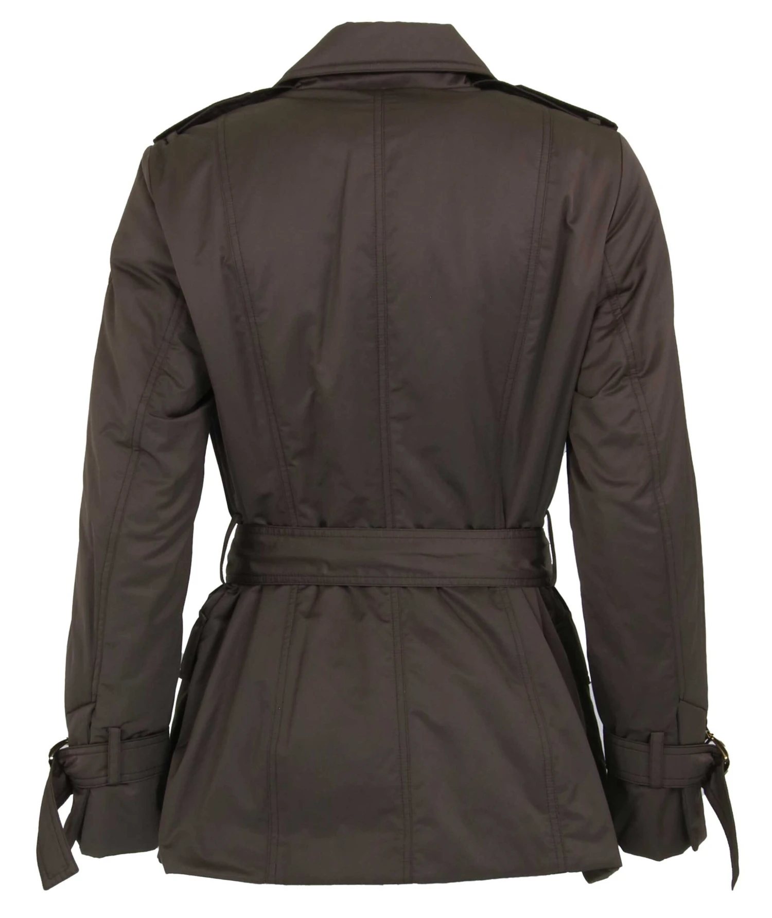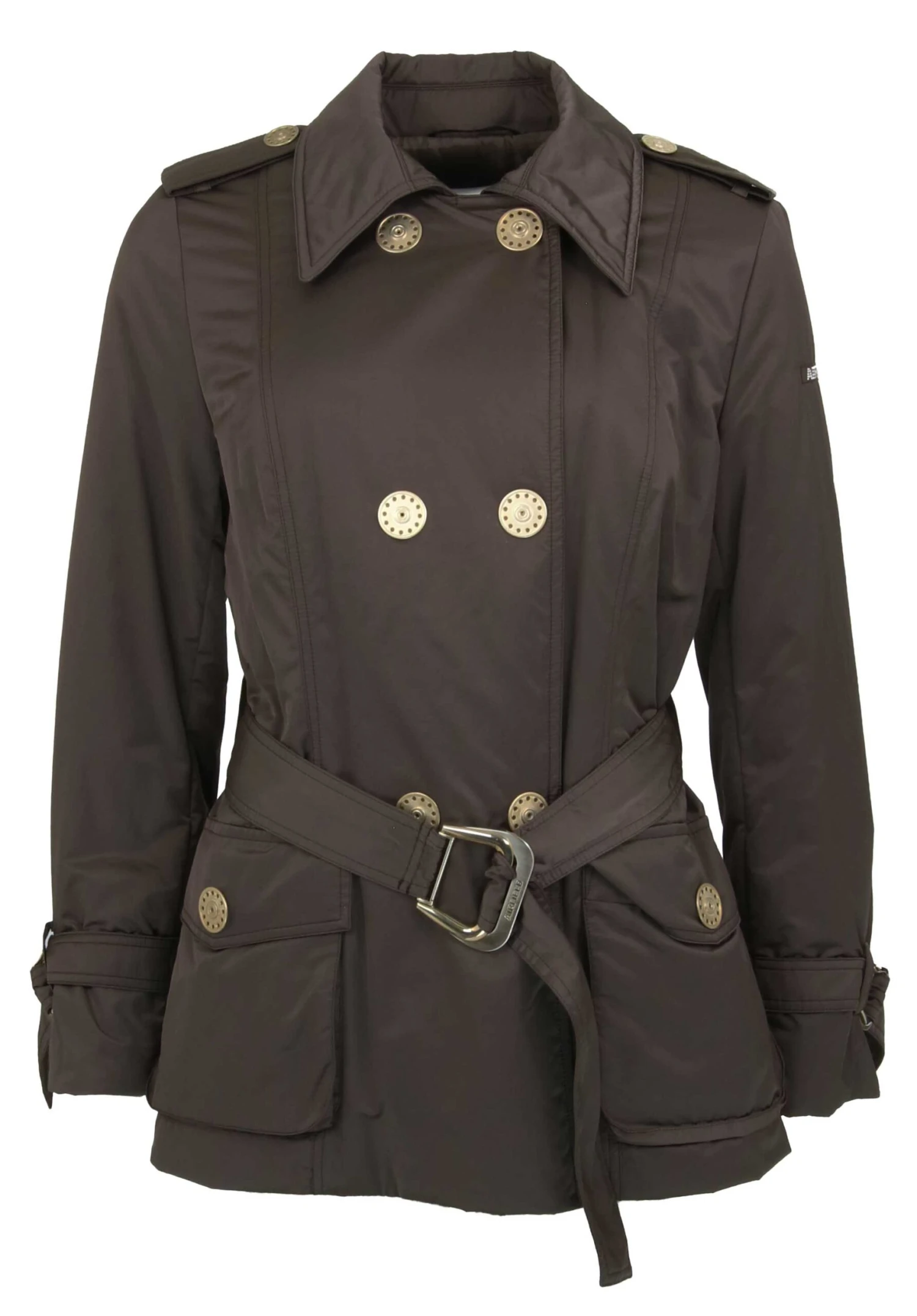 Een double brazzed jack van Airfield in een mokka bruine kleur. Het jack heeft een sluiting met 3 dubbele drukknopen. De ceintuur is in dezelfde stof als het jack met een messing kleurige gesp. dit jack mag op 30 graden worden gewassen.