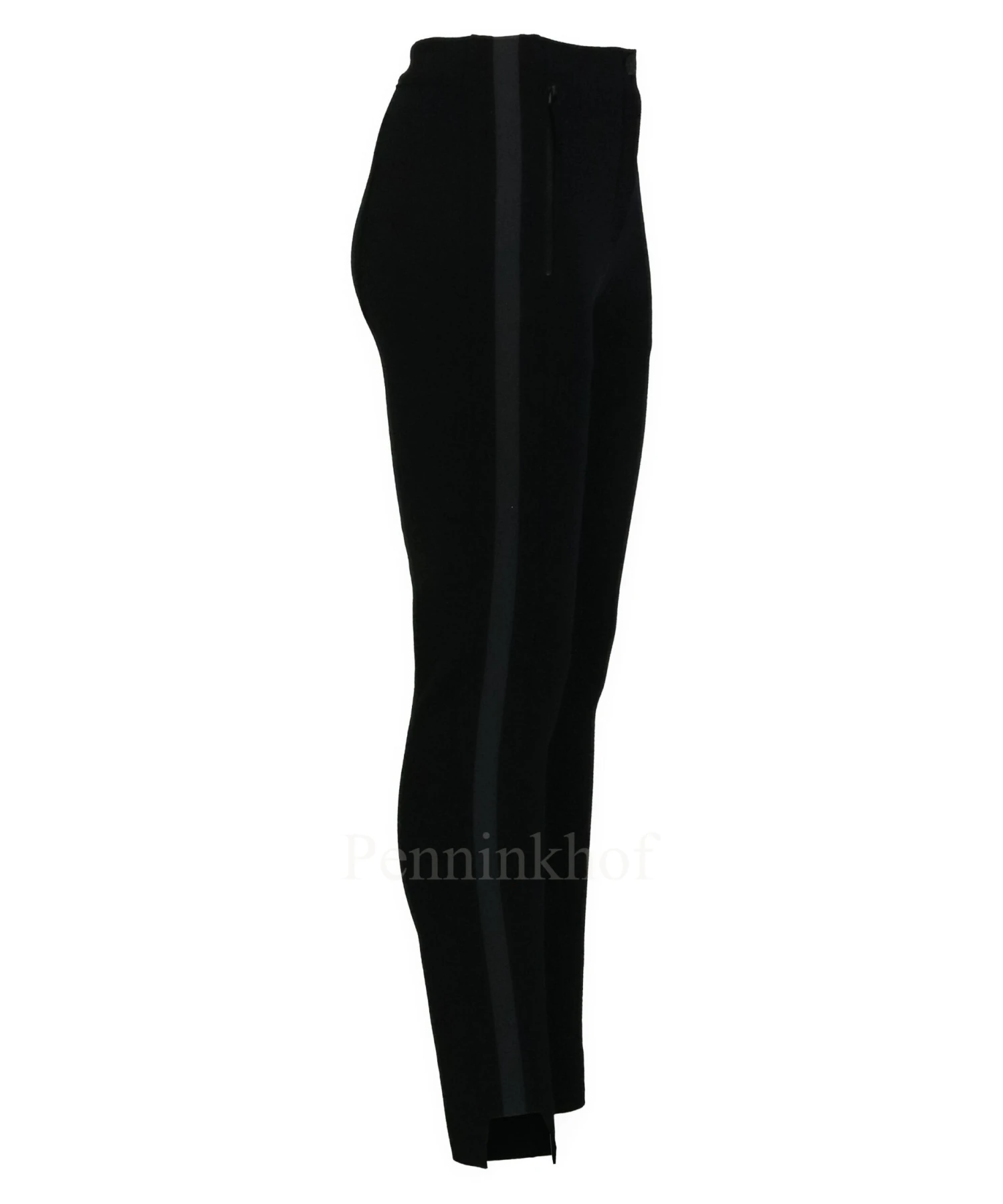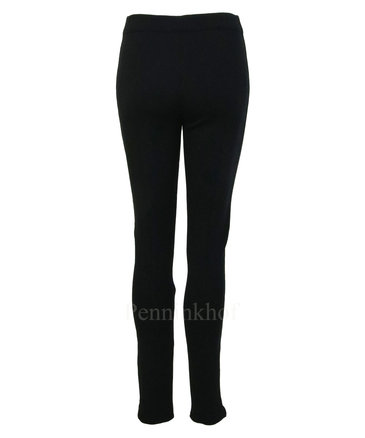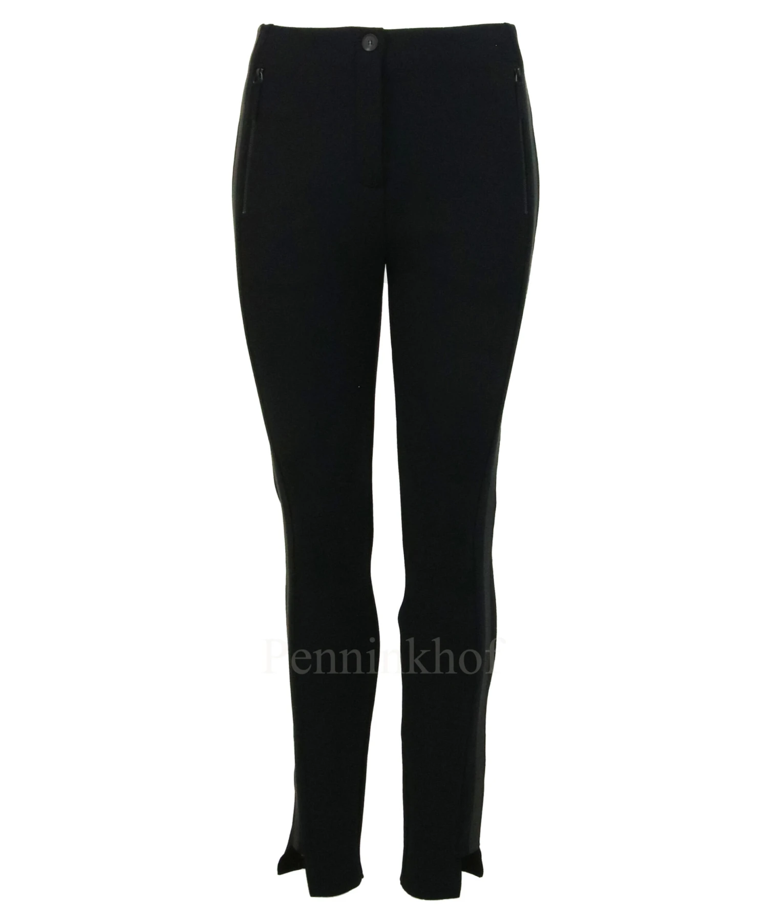 Een elastische broek van Annette Görtz in de kleur zwart. De zakken hebben een verticale ritssluiting. Langs de zijkanten is een brede mat zwarte bies. Aan de onderkant van de pijpen is aan de buitenzijde een inkeping. Deze broek mag op de hand worden gewassen.