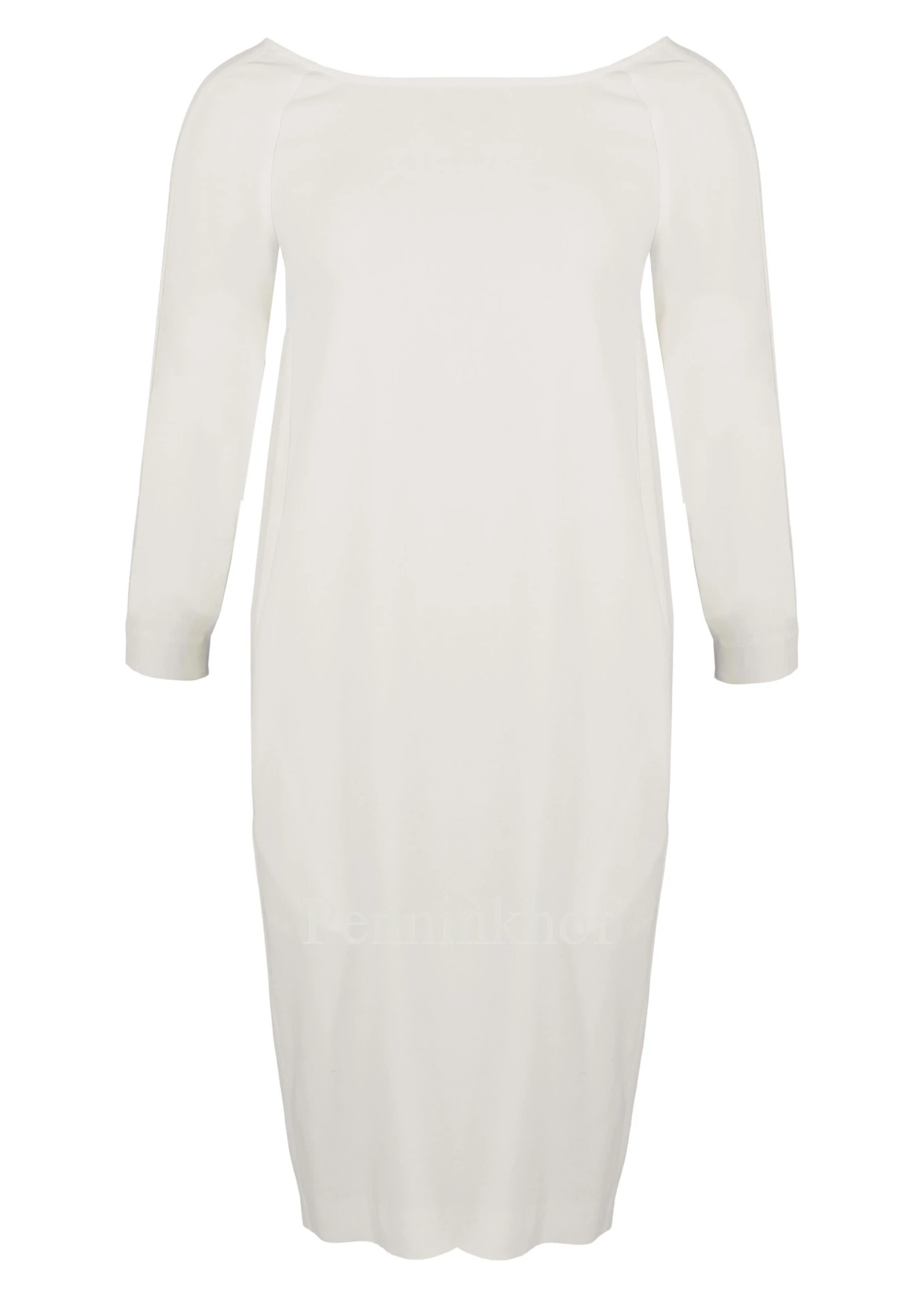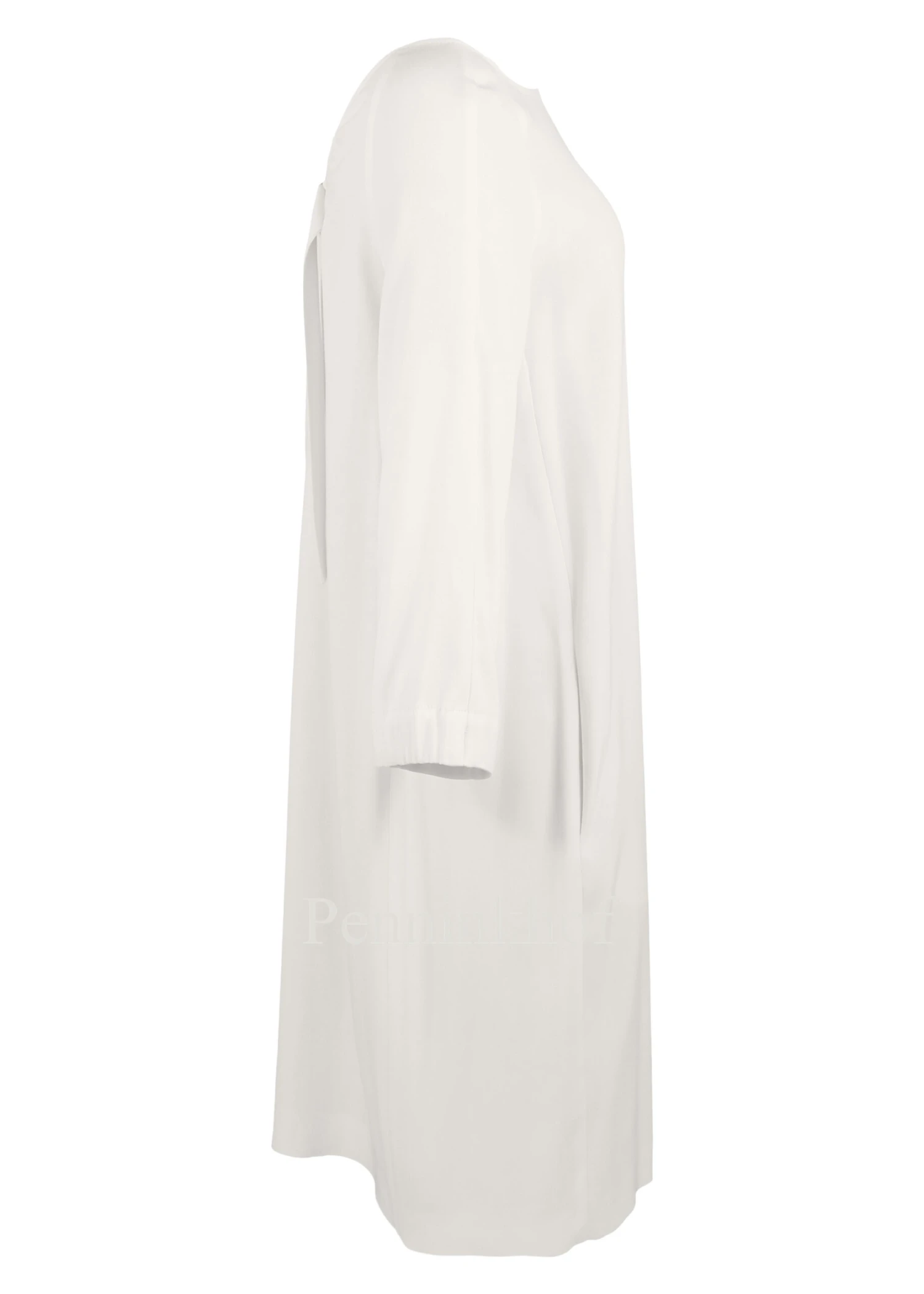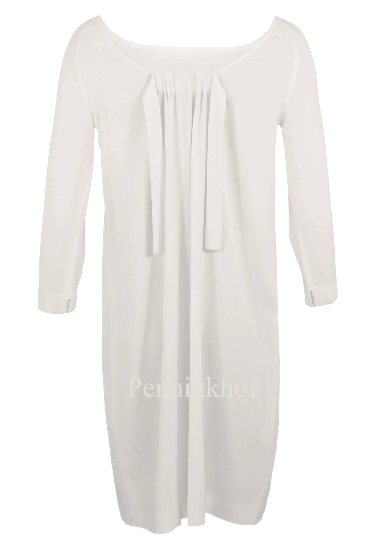 Een jurk van Annette Görtz in de kleur roomwit. Aan de voorzijde is een brede ronde hals. Aan de achterzijde is de uitsnijding iets dieper met in het midden een korte elastieken band met 2 linten aan het uiteinde. In de rand van de halflange mouwen is een elastieken band. De jurk heeft steekzakken en mag op 30 graden worden gewassen.