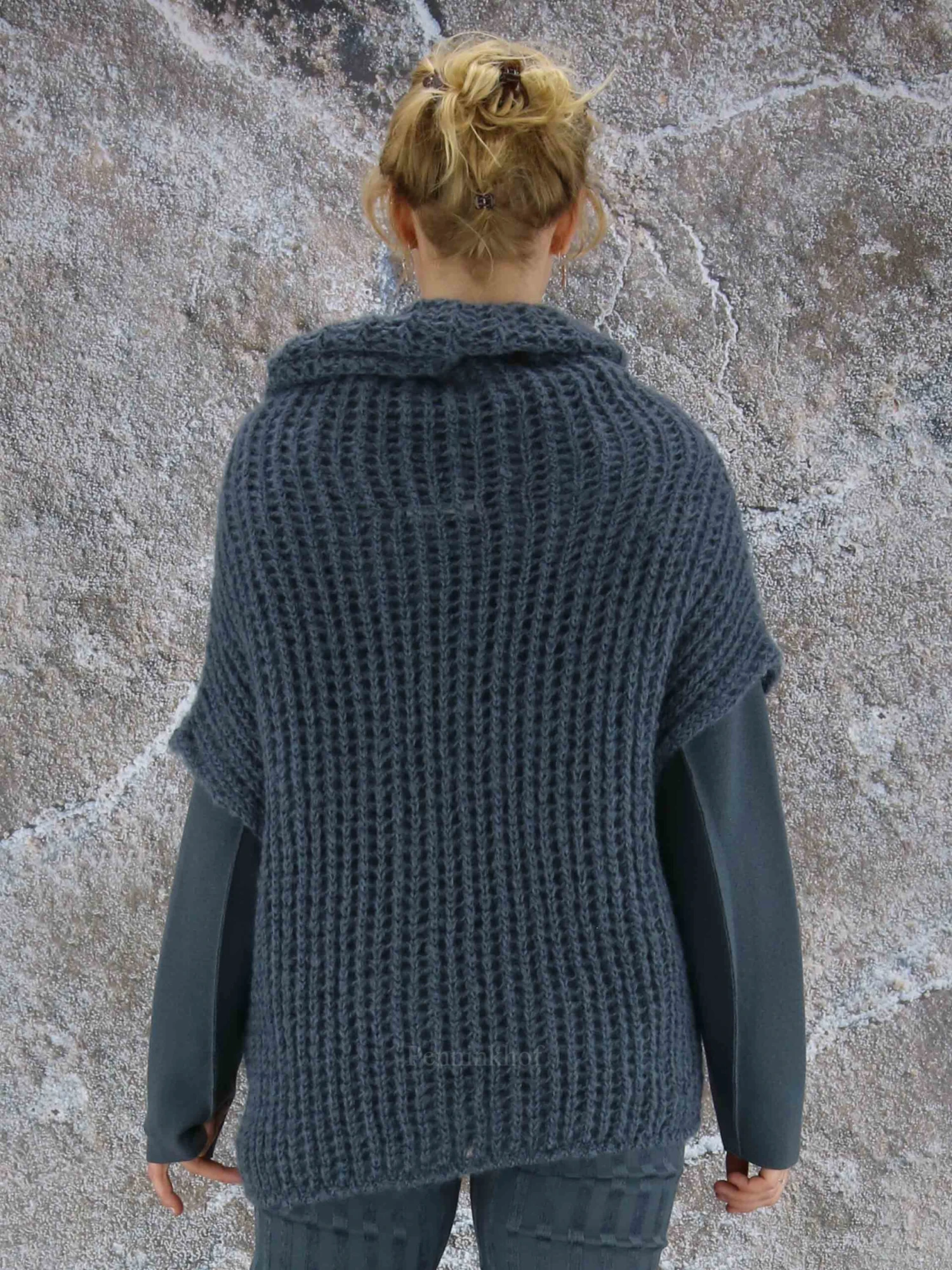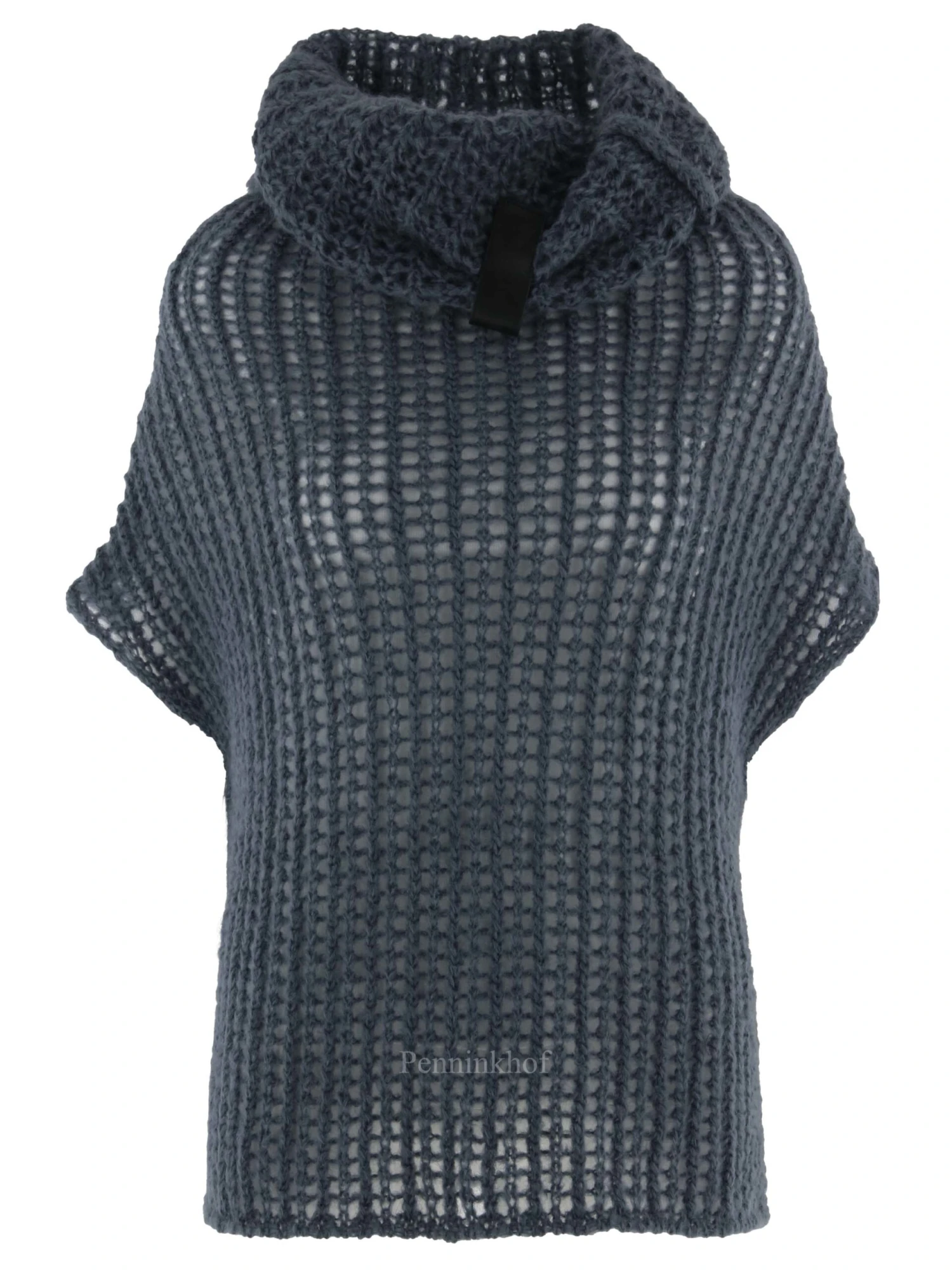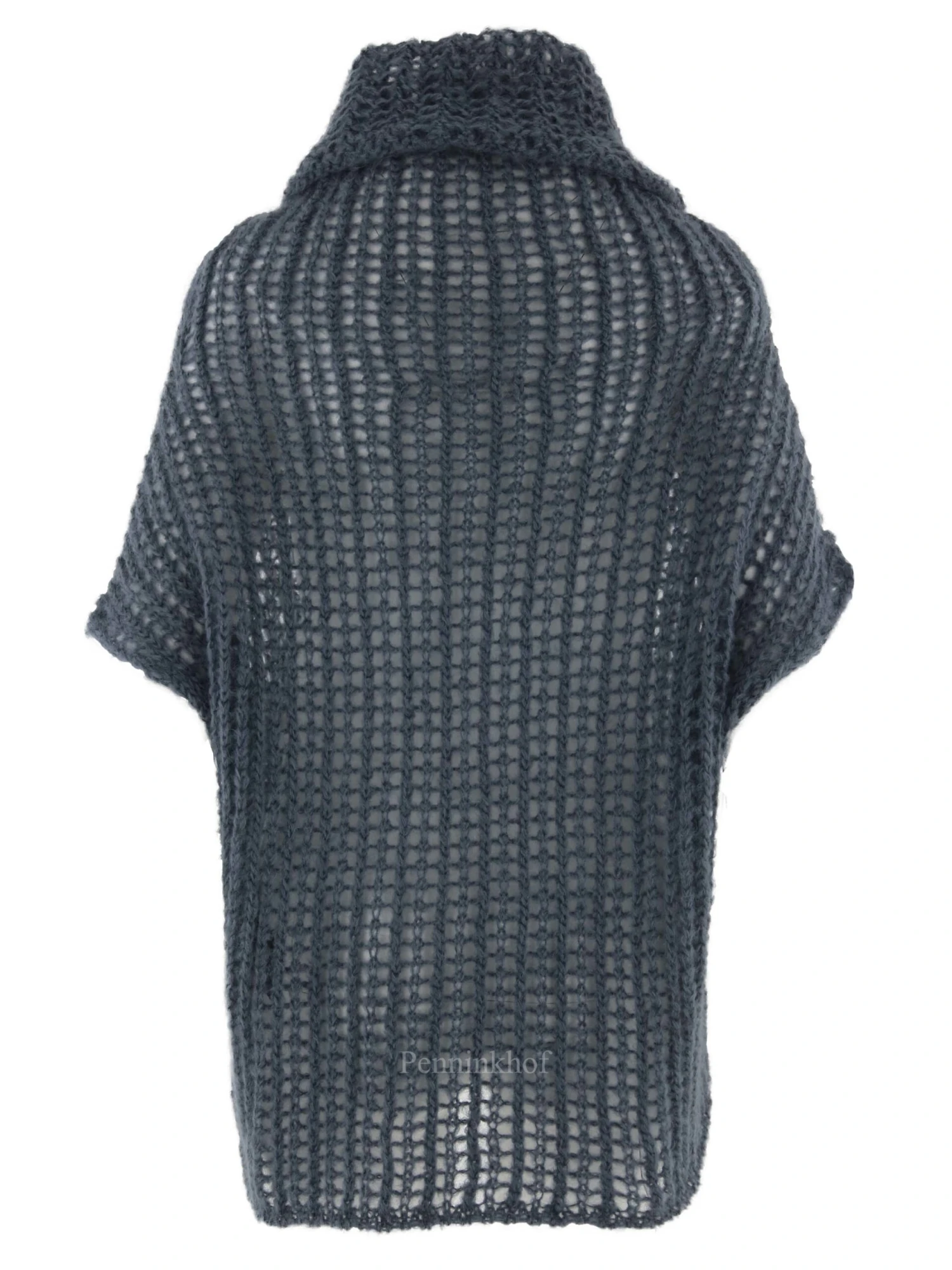 Een open gebreid hes van Annette Görtz in een blauw grijze kleur. Het hes heeft een hangende col en mag op de hand worden gewassen.