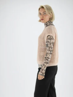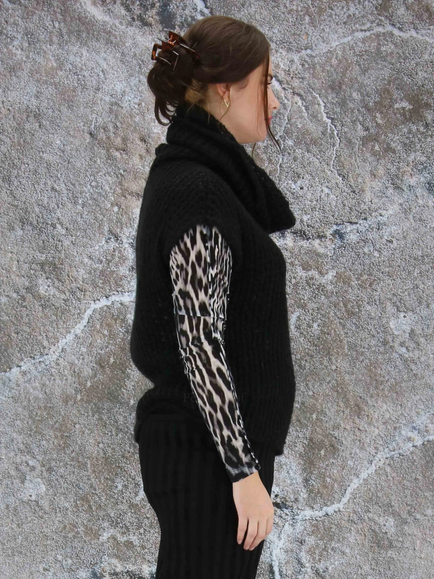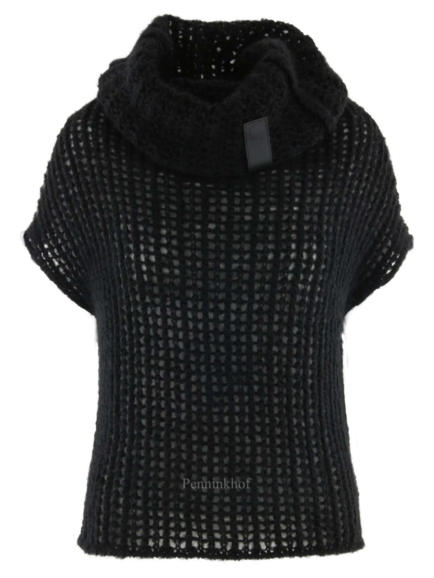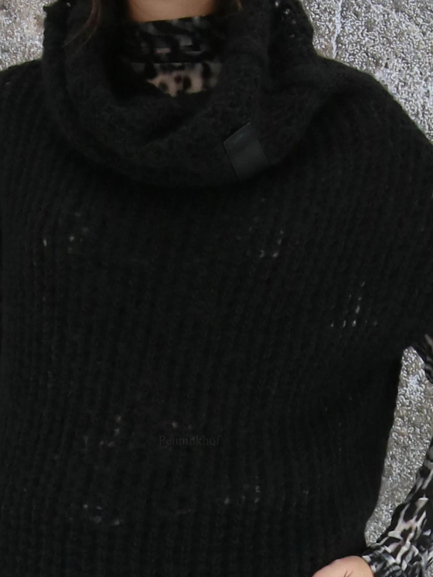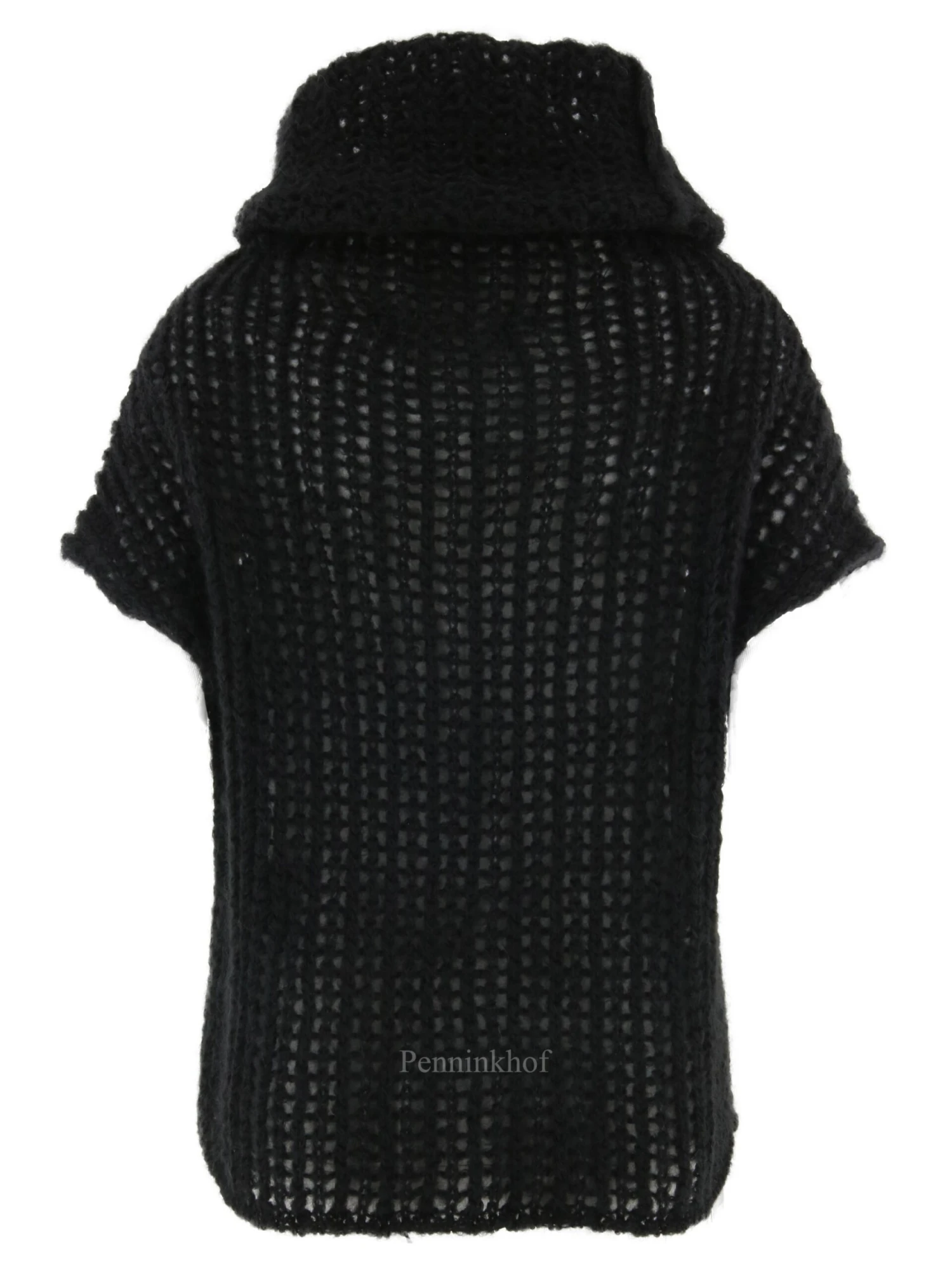 Een open gebreid hes van Annette Görtz in de kleur zwart. Het hes heeft een hangende col en mag op de hand worden gewassen.