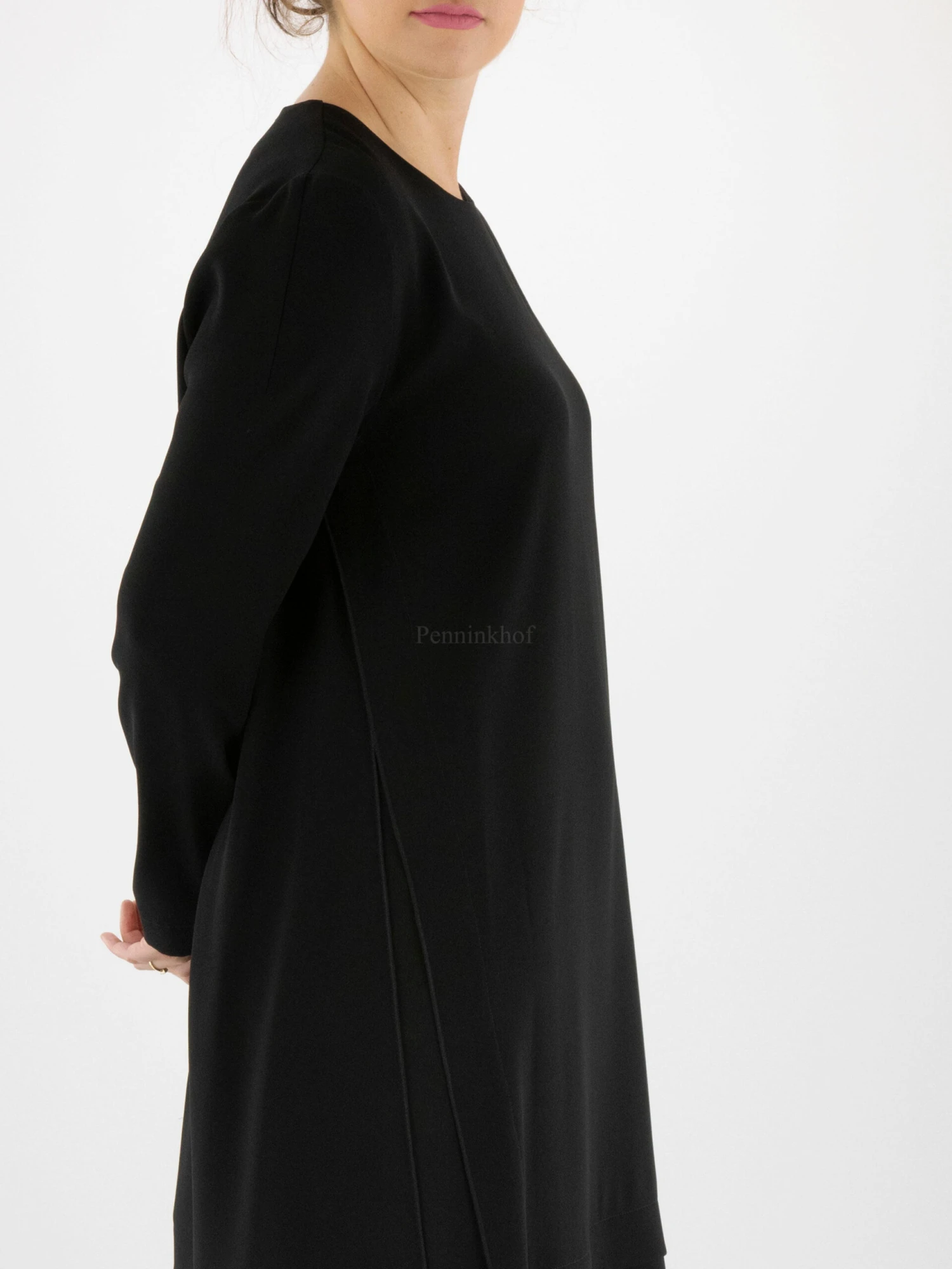 Een jurk van Annette Görtz in de kleur zwart. Langs de zijkanten is de stof open met daaronder een diepzwarte stof die ook aan de onderkant van de jurk tevoorschijn komt. De jurk heeft een ronde hals en mag op de hand worden gewassen.
