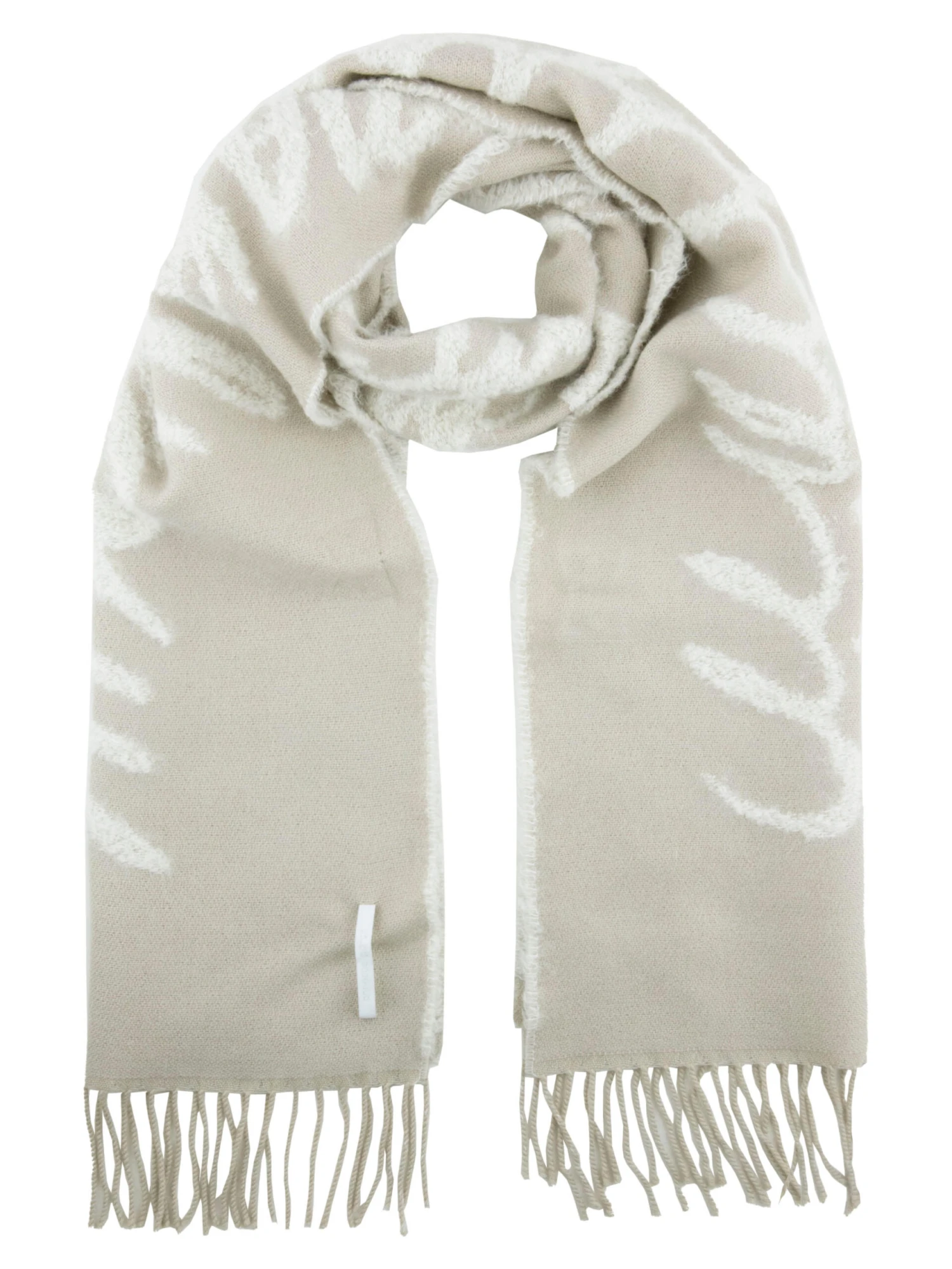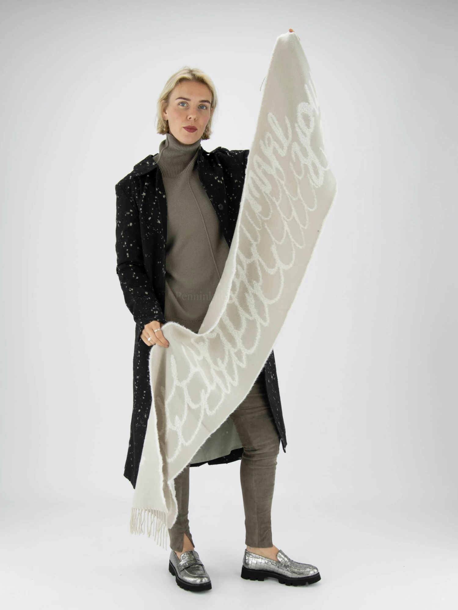 Een shawl van Annette Görtz in een beige kleur met een tekst die geschreven is in een witte kleur. Aan het uiteinde van de shawl zijn franjes. Deze shawl mag op de hand worden gewassen.
