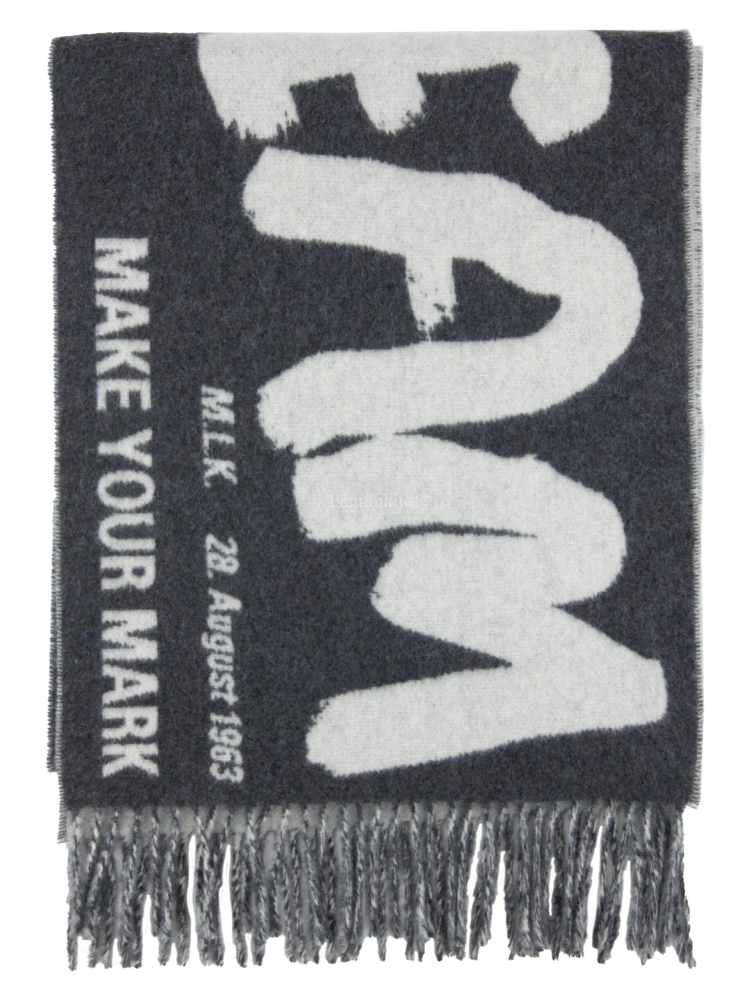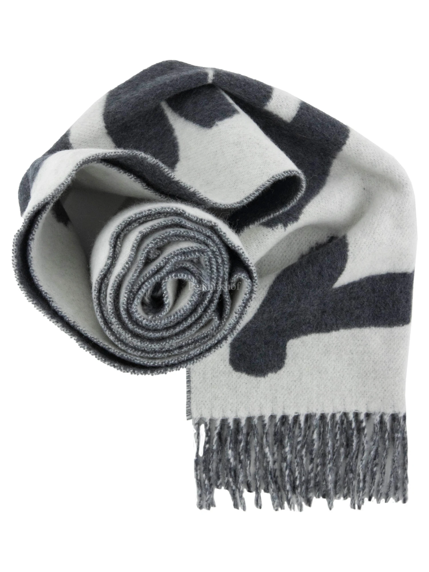 Een shawl van Annette Görtz met een text print in de kleuren donkergrijs en roomwit. Aan de uiteinden van de shawl zijn lange franjes. Deze shawl mag niet worden gewassen.