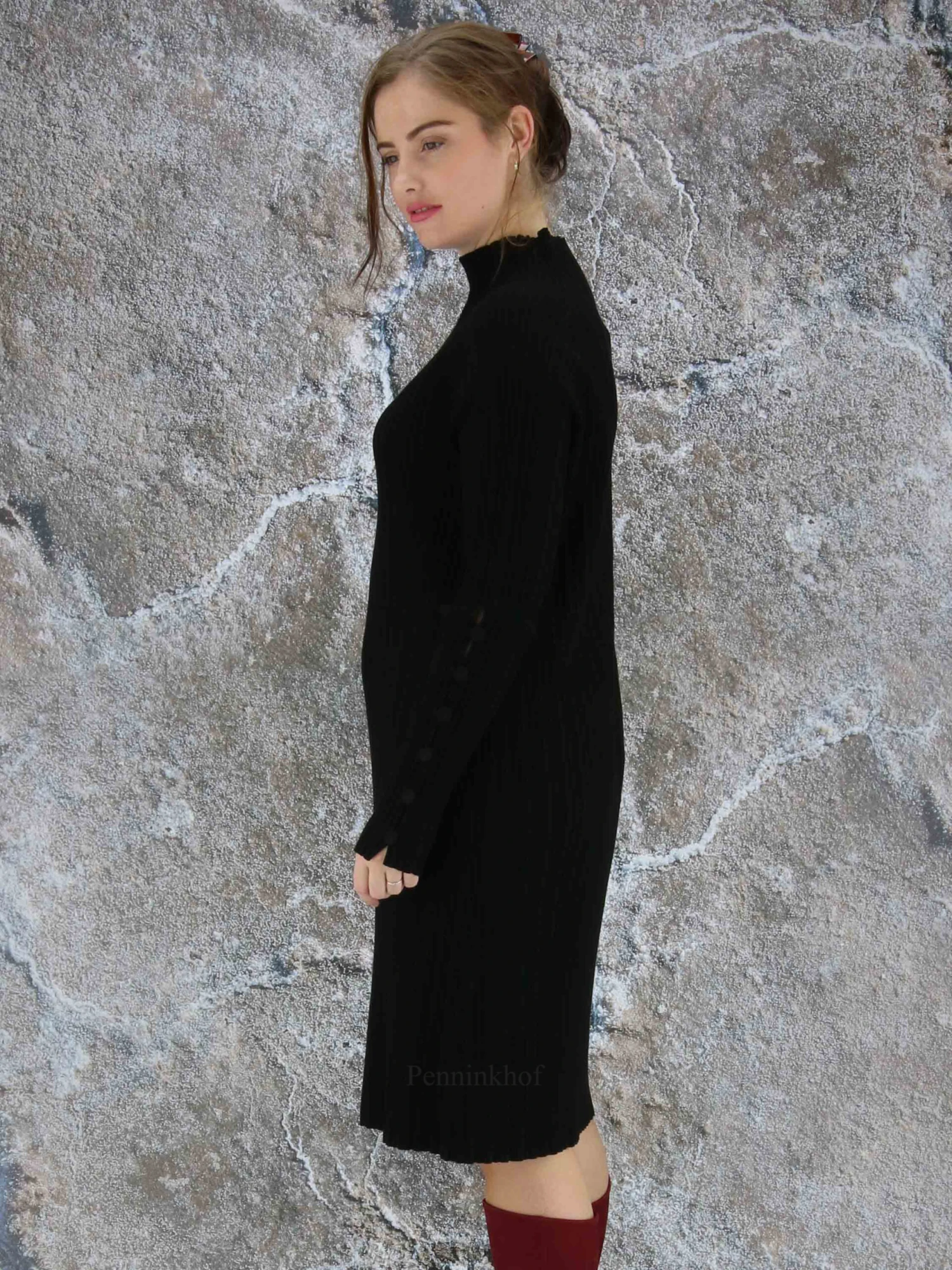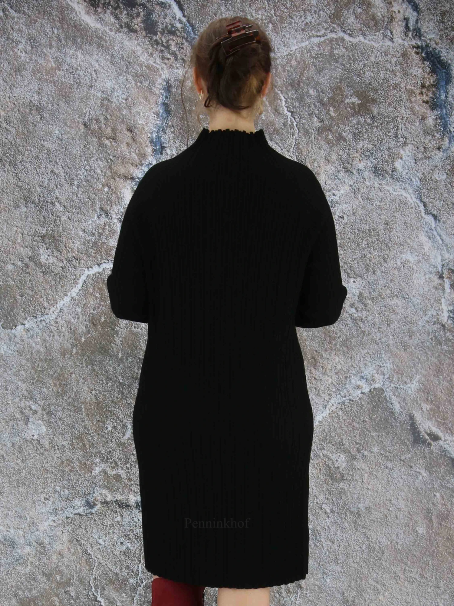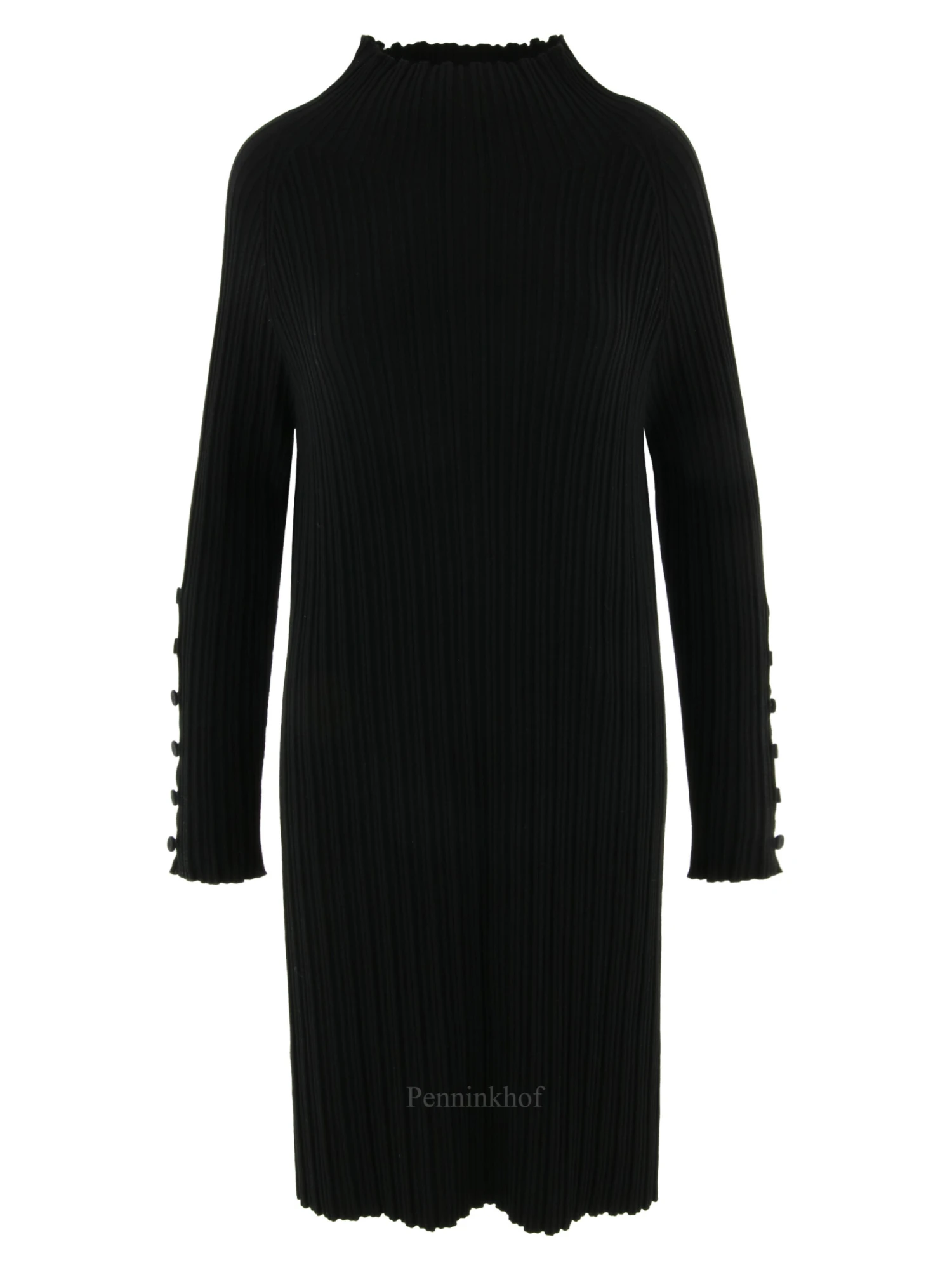 Een luxe jurk van Annette Görtz in een reliëf ribbel patroon in de kleur zwart. Aan het uiteinde van de lange mouwen zijn meerdere decoratieve knoopjes. Deze jurk mag op de hand worden gewassen.