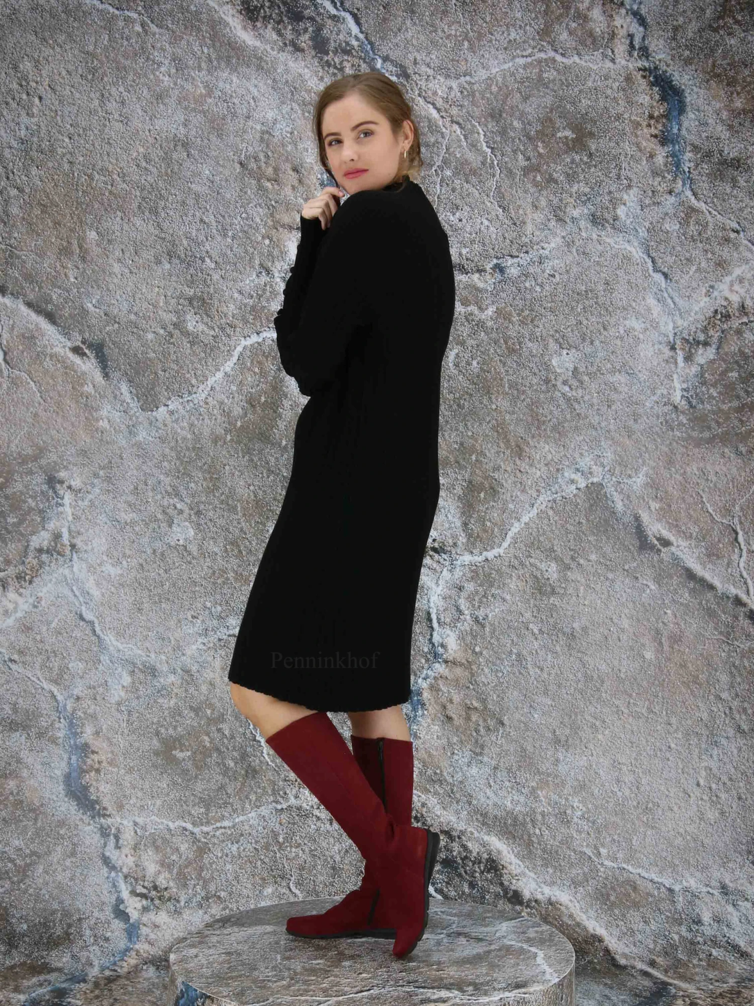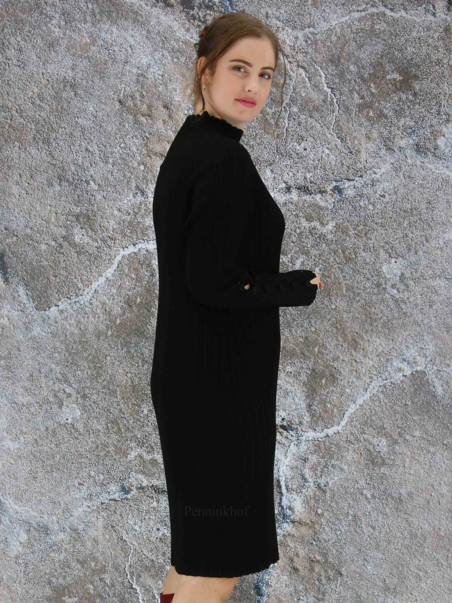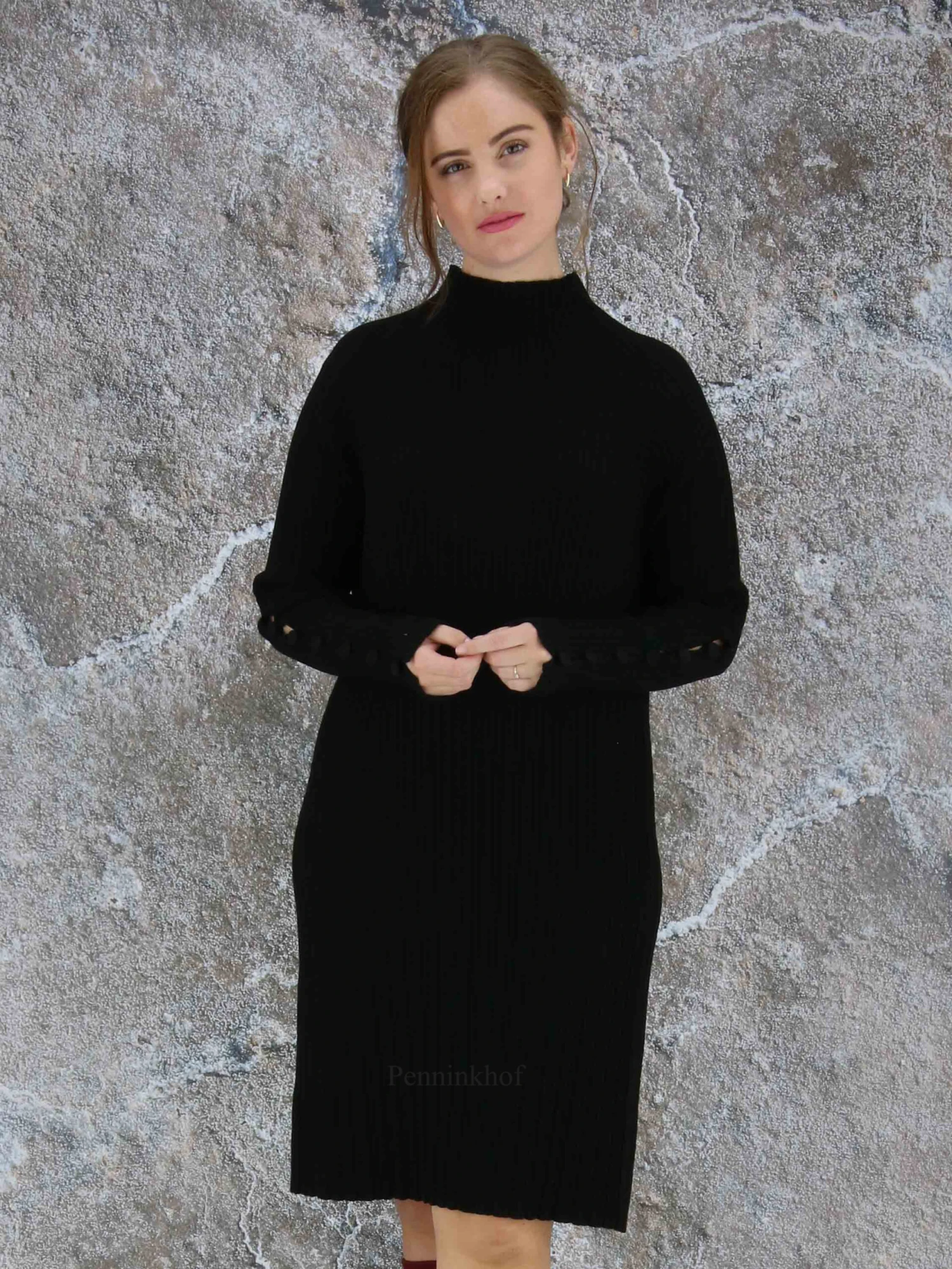 Een luxe jurk van Annette Görtz in een reliëf ribbel patroon in de kleur zwart. Aan het uiteinde van de lange mouwen zijn meerdere decoratieve knoopjes. Deze jurk mag op de hand worden gewassen.