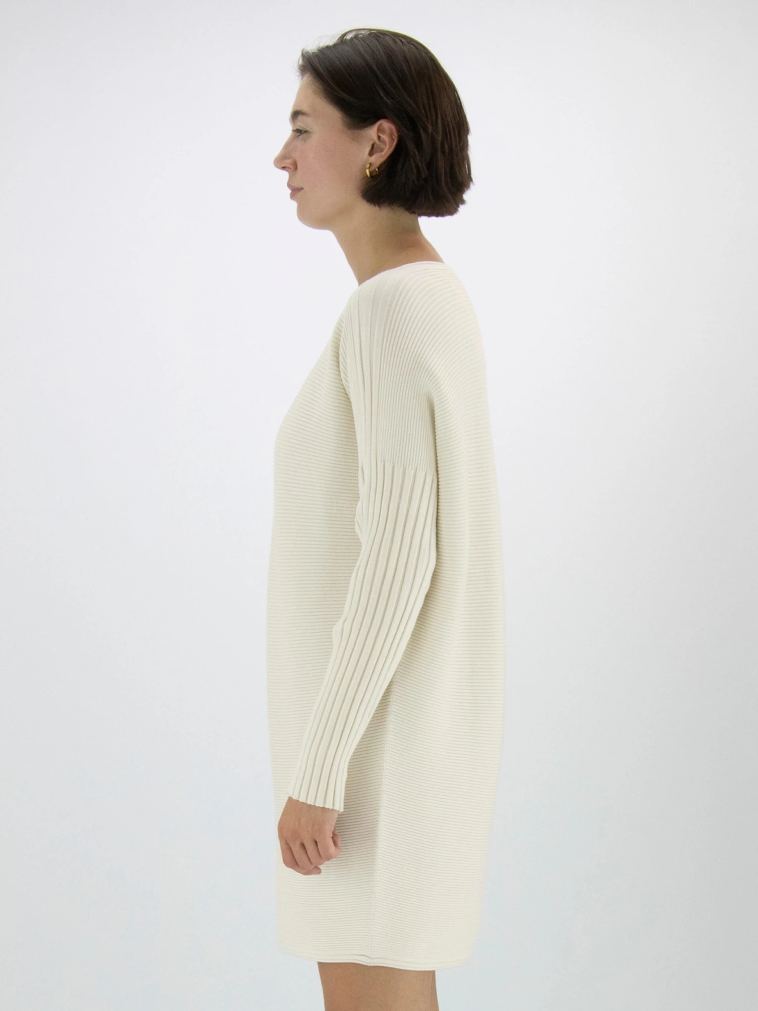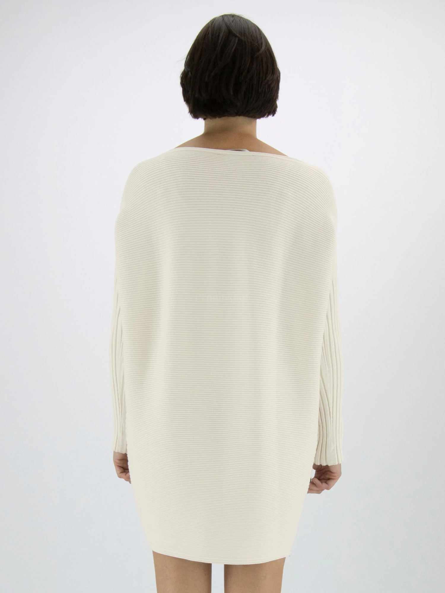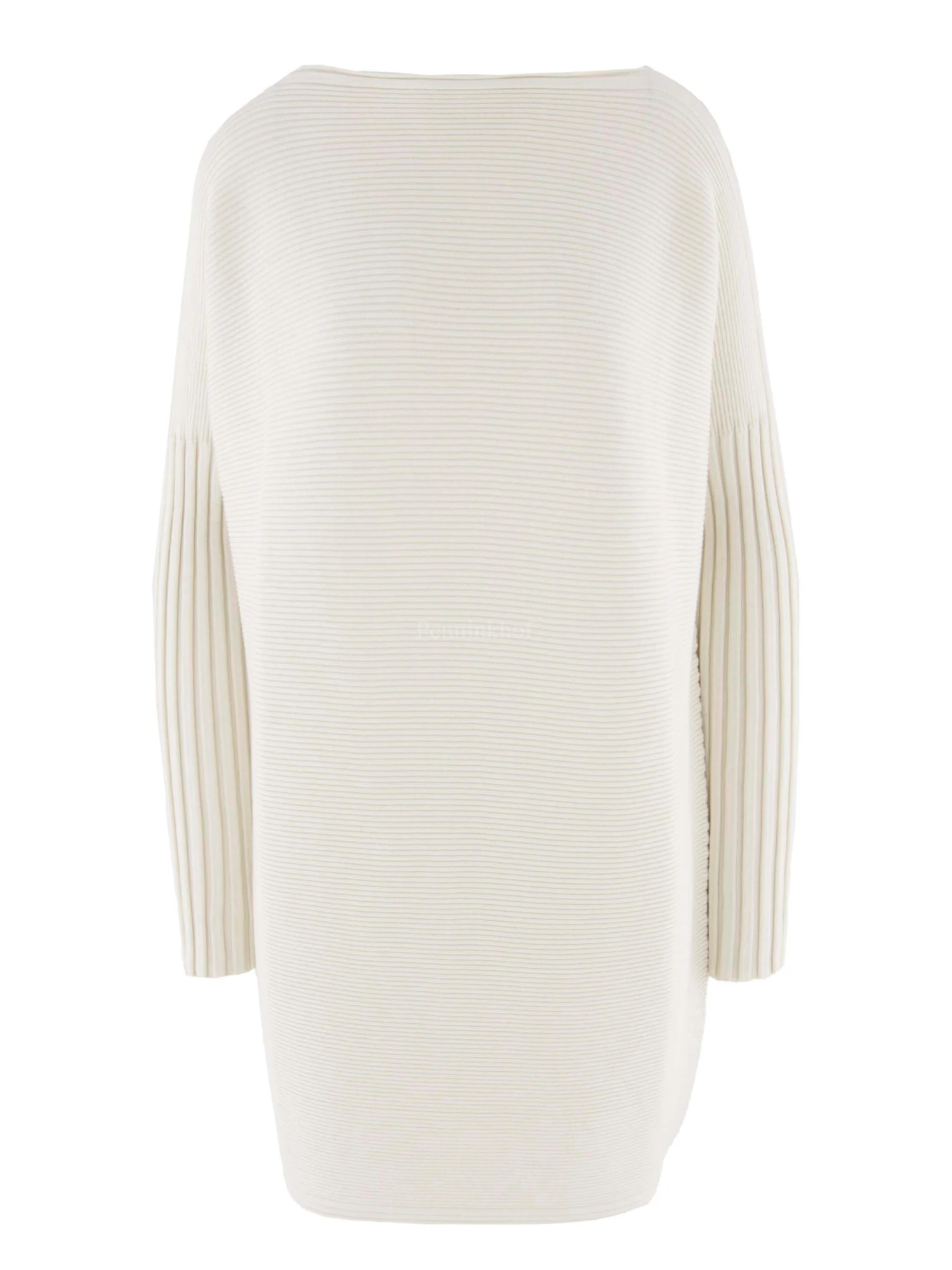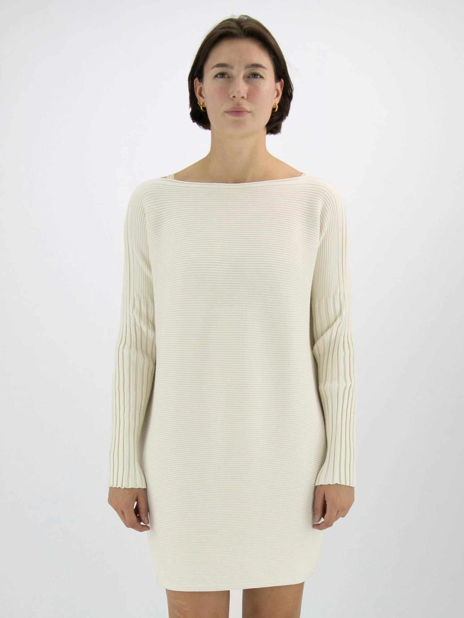 Een jurk of tuniek van Annette Görtz in de kleur roomwit. Het tuniek is in een ribbel structuur met een ronde hals en lange mouwen. Deze jurk mag op de hand worden gewassen.