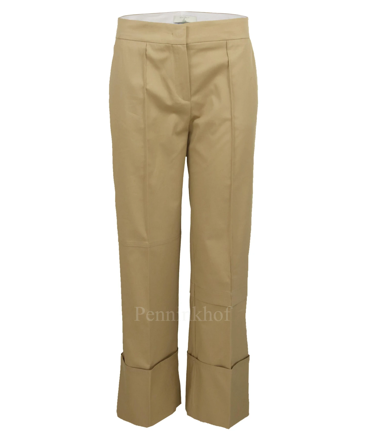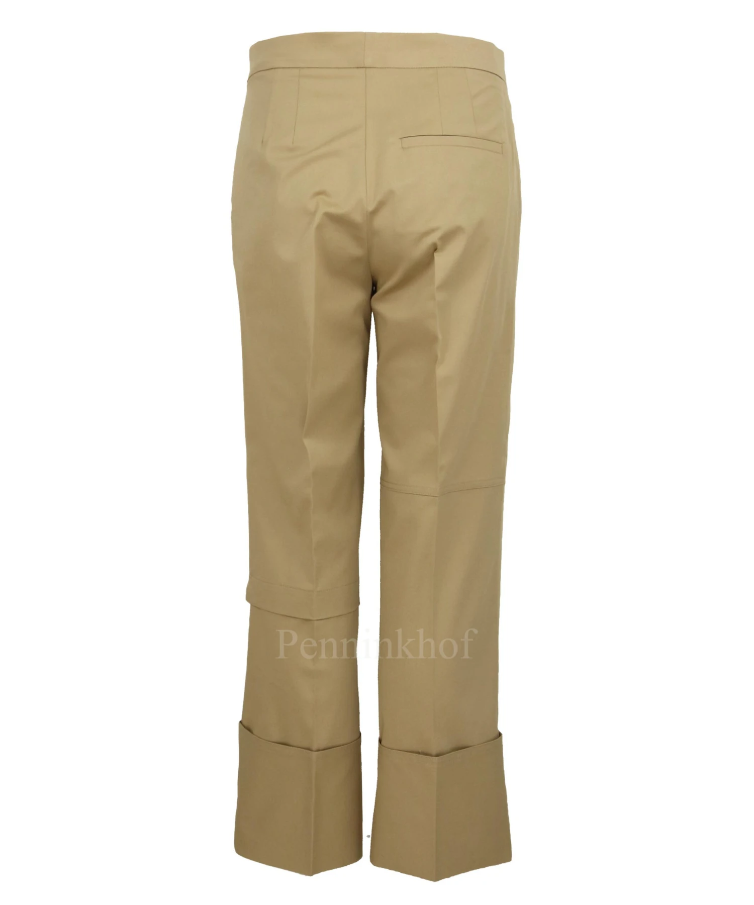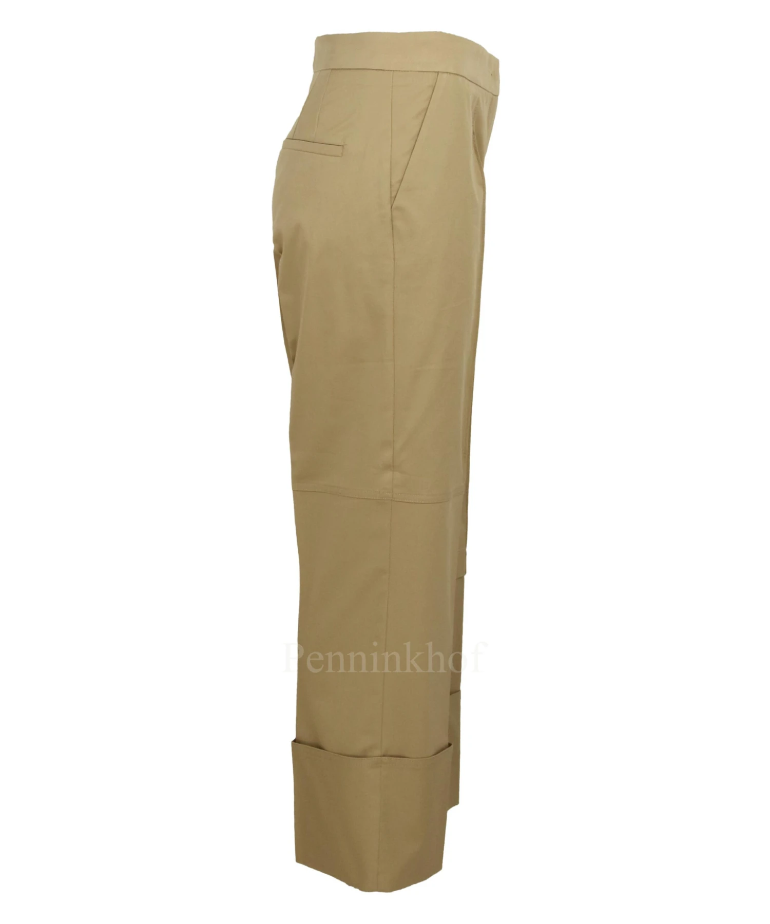 Een broek van Beatrice B. in de kleur camel. Bij de linker knie is een stiknaad met een overslag in de stof. Aan de onderkant van de pijpen is een zeer brede omslag van 15 cm. De broek heeft steekzakken en mag op de hand worden gewassen.