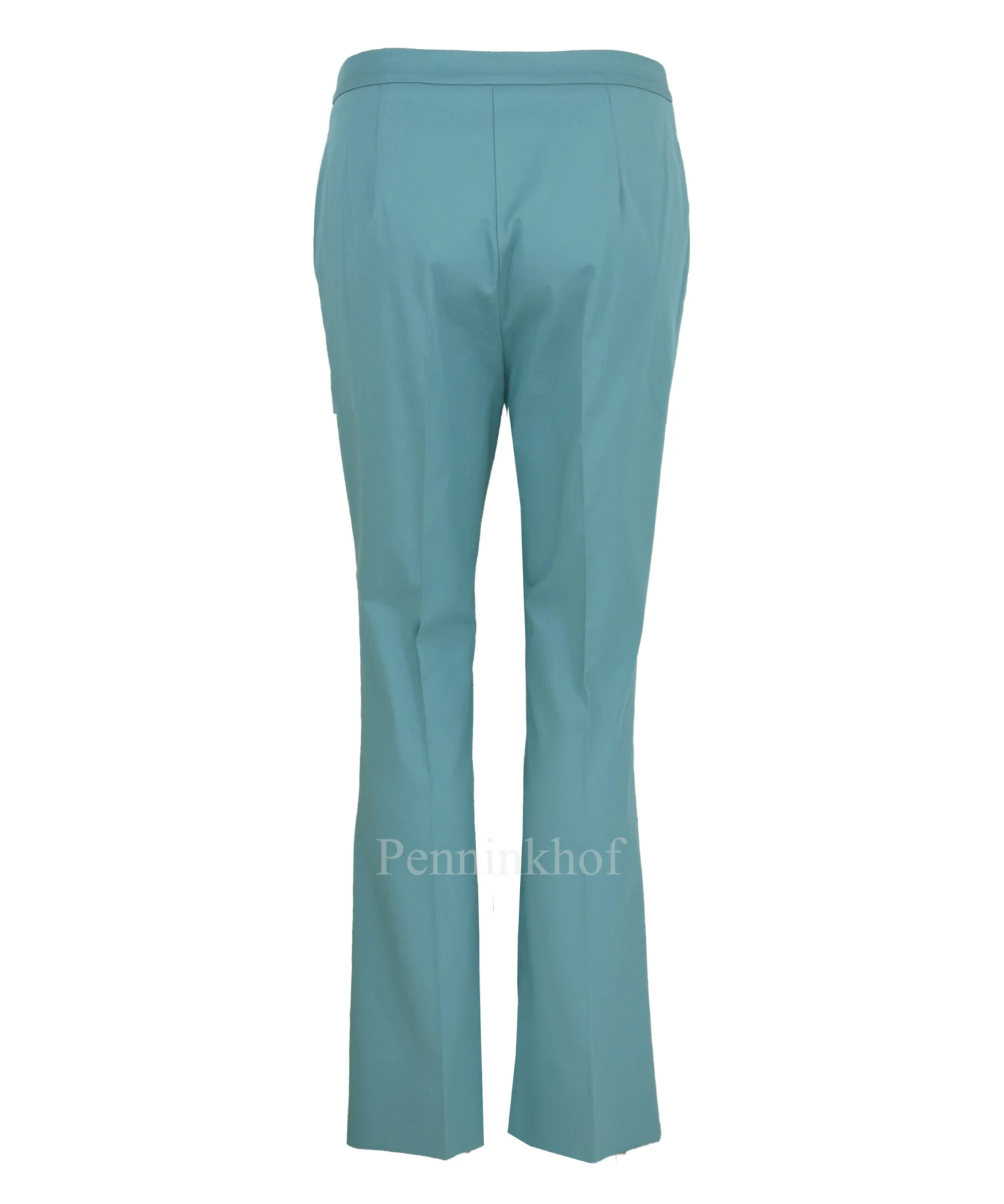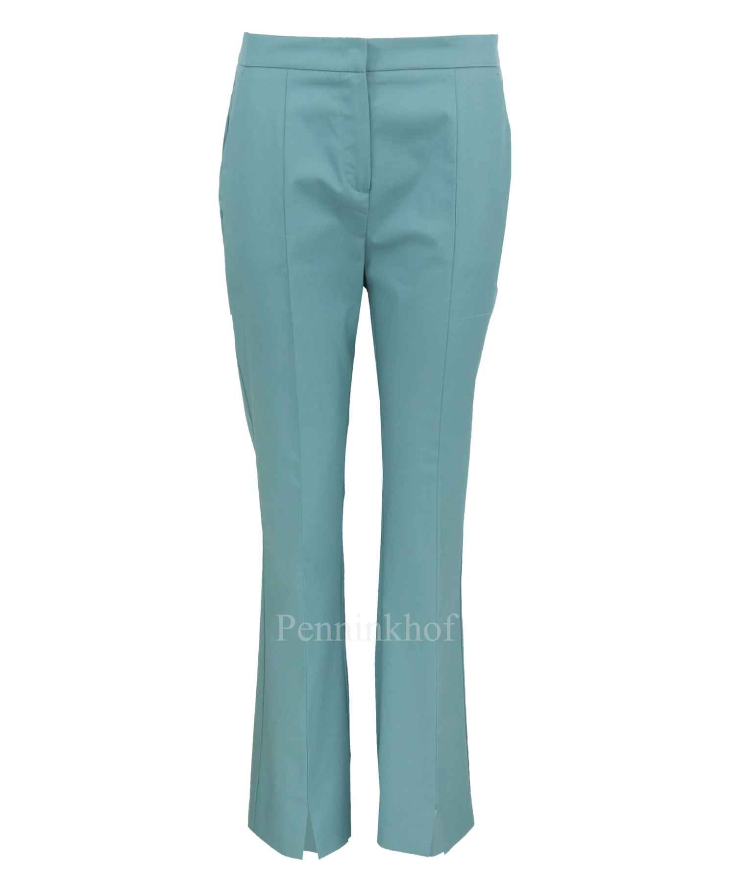 Een broek van Beatrice B. in een donkere mint kleur. Aan de onderkant van de pijpen is aan de voorzijde een splitje. De broek heeft steekzakken en mag op de hand worden gewassen.