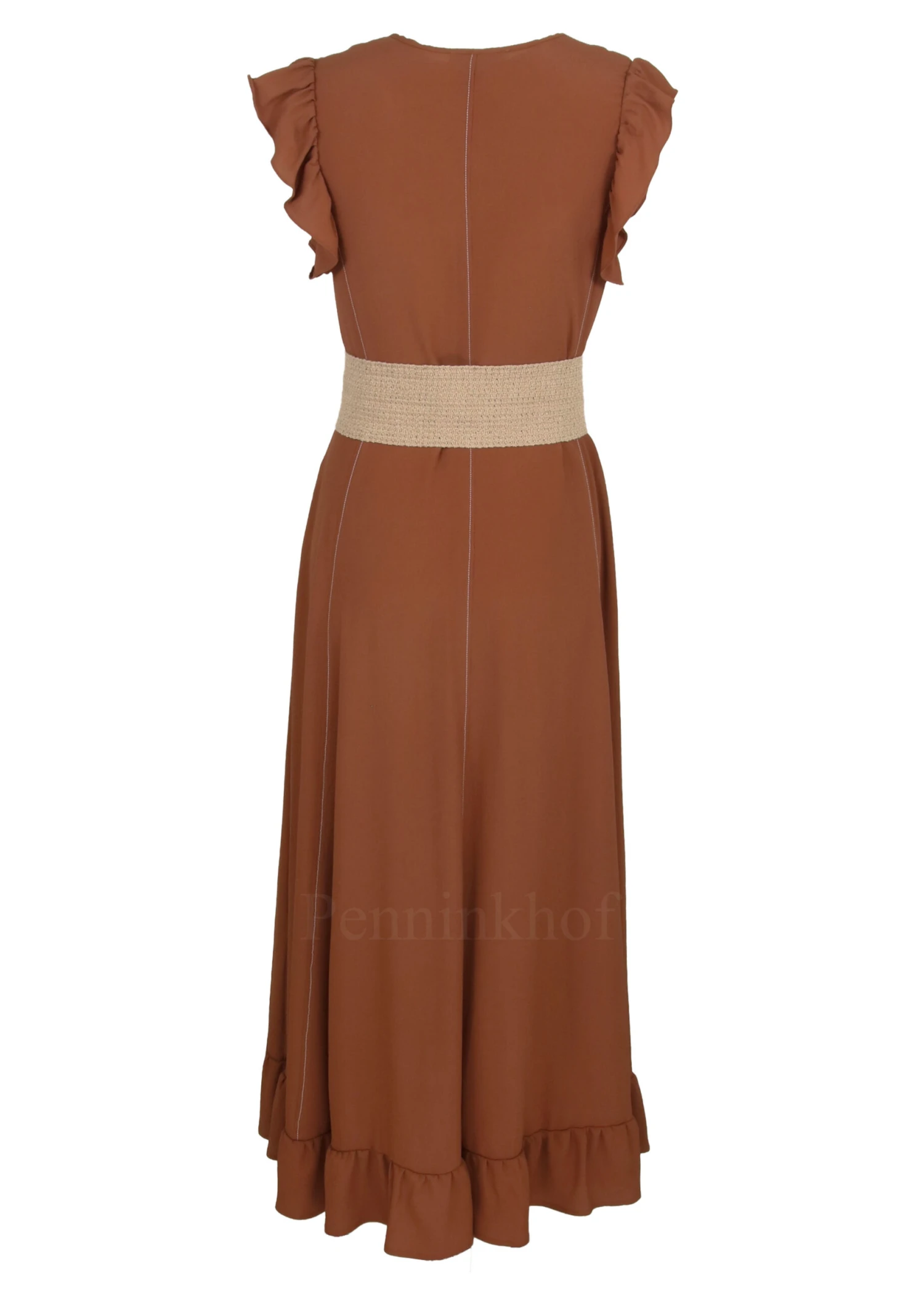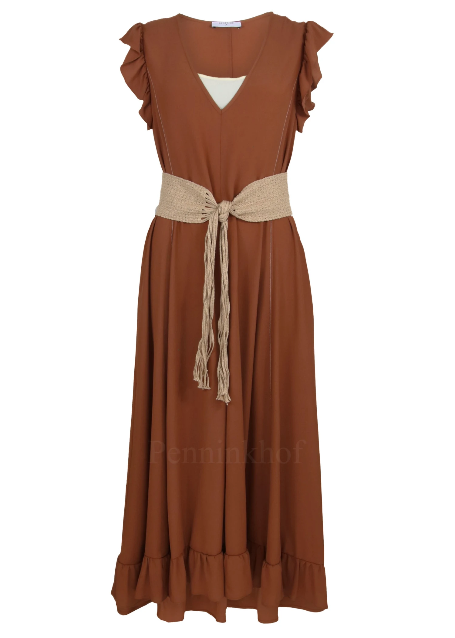 Een jurk van Beatrice B. in de kleur bruin. De jurk heeft een V – Hals. Langs de randen van de mouwinzet is een folange. Aan de voor en achterzijde zijn aan de zijkanten witte stiknaden. Vanuit de taille heeft de jurk een A – lijn. Aan de onderzijde is een stiknaad met daar onder fijne plooien. Deze jurk mag op de hand worden gewassen.