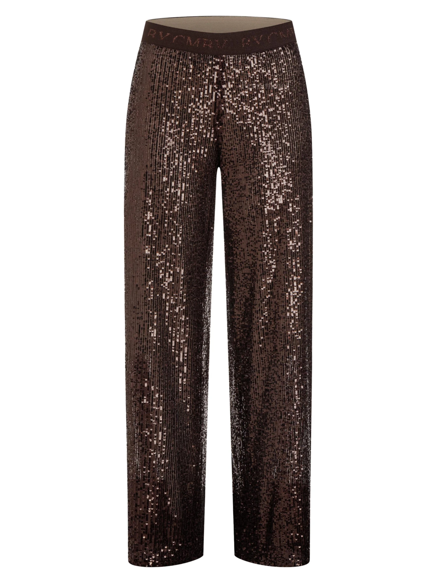 Een broek van Cambio in de kleur bruin. De broek is bedekt met lovertjes in dezelfde kleur als de stof. In de taille is en elastieken band. Deze broek mag op de hand worden gewassen.