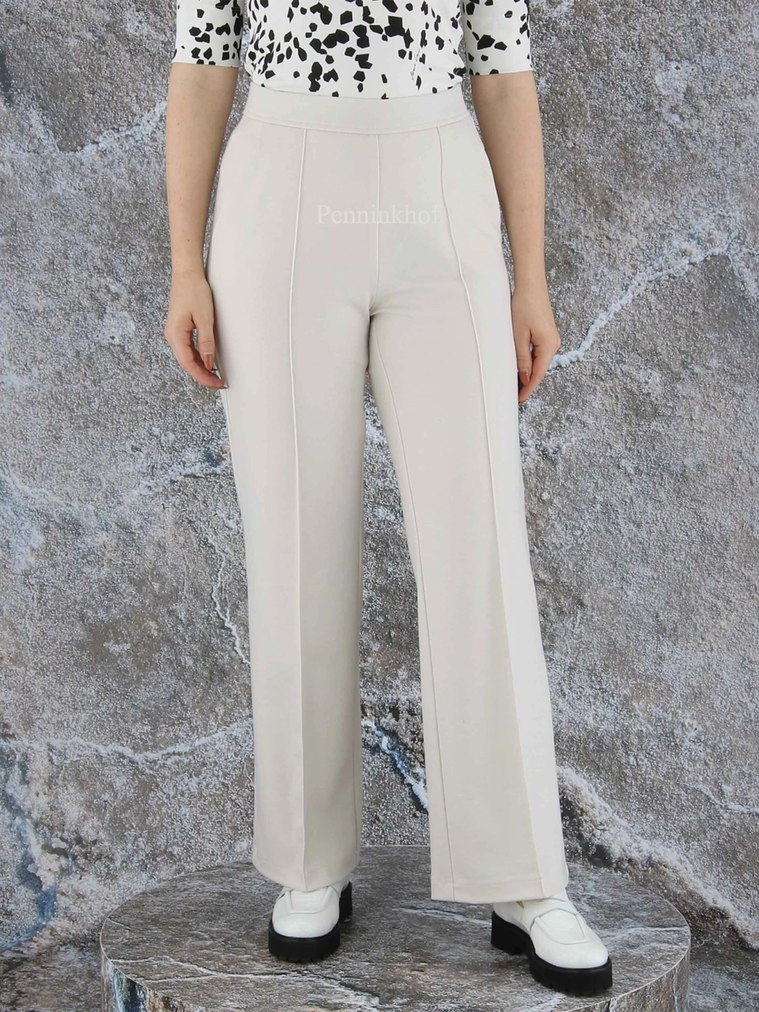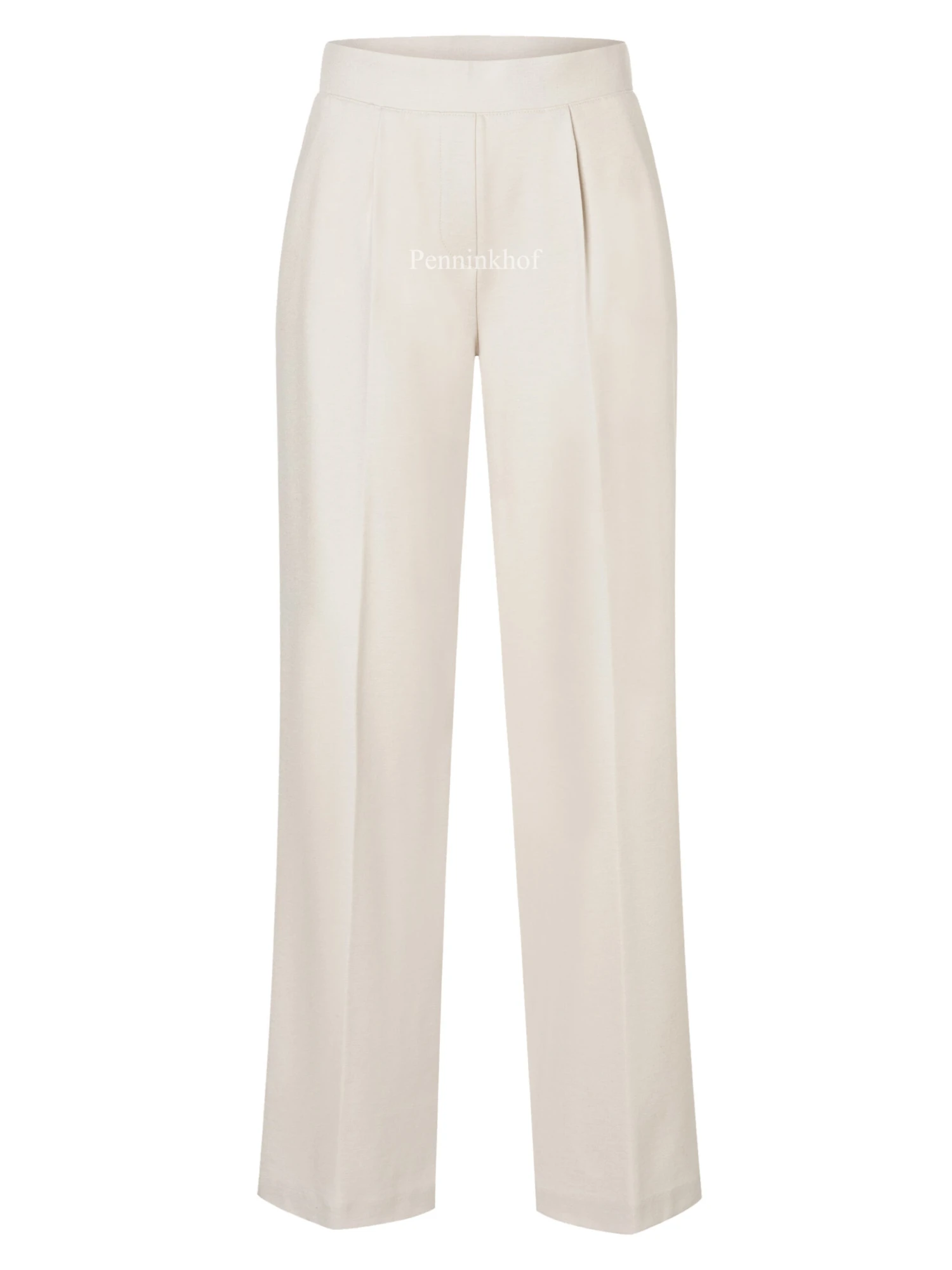 Een broek van Cambio in de kleur beige. In de taille is een elastieken band. De broek heeft steekzakken en een rechte pijp. Deze broek mag op de hand worden gewassen.