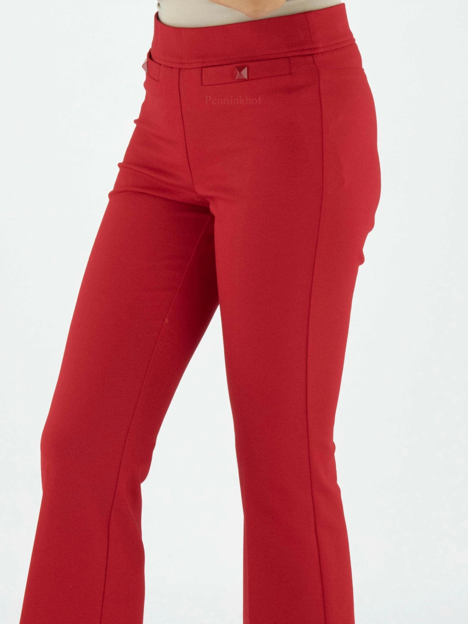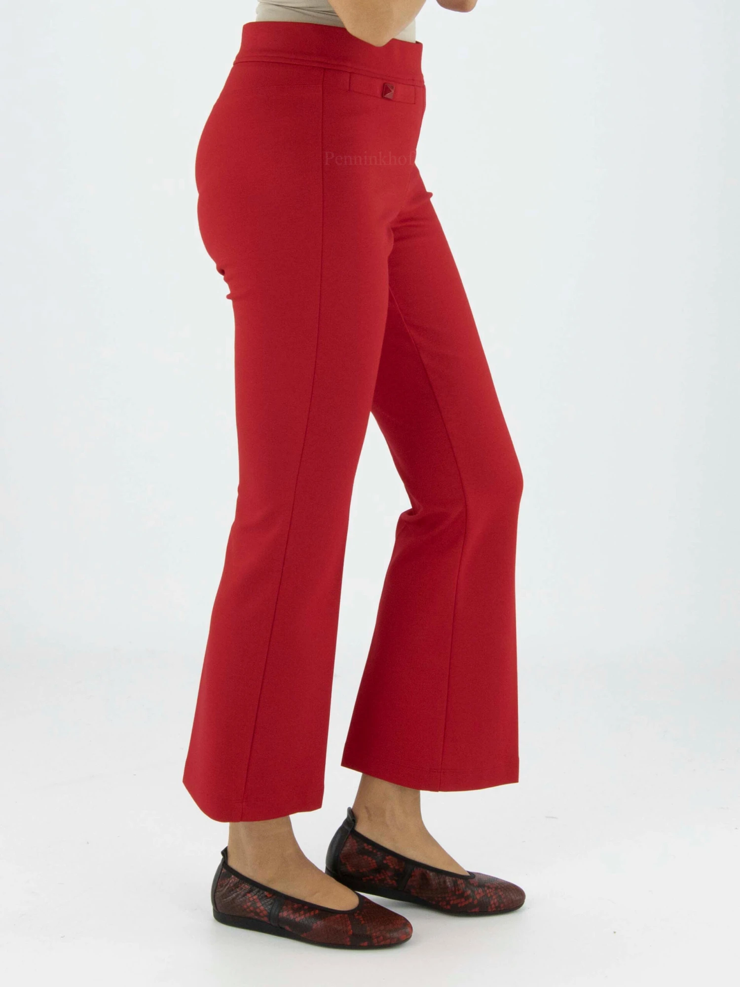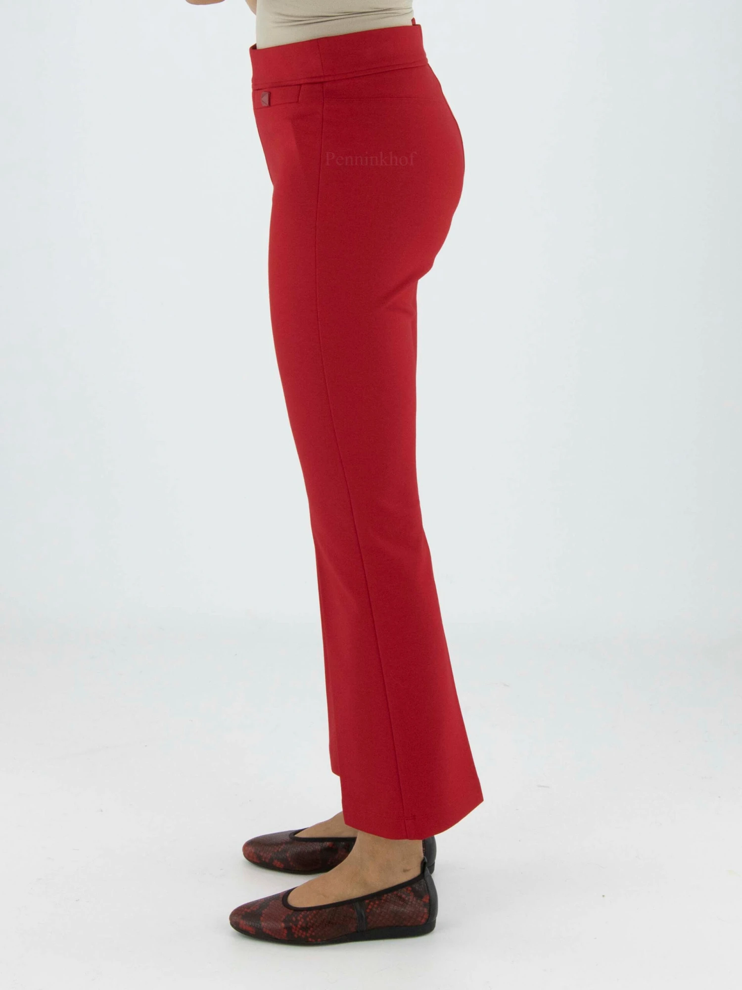 Een broek van Cambio in de kleur rood. In de taille is een elastieken band. Deze broek mag op de hand worden gewassen.