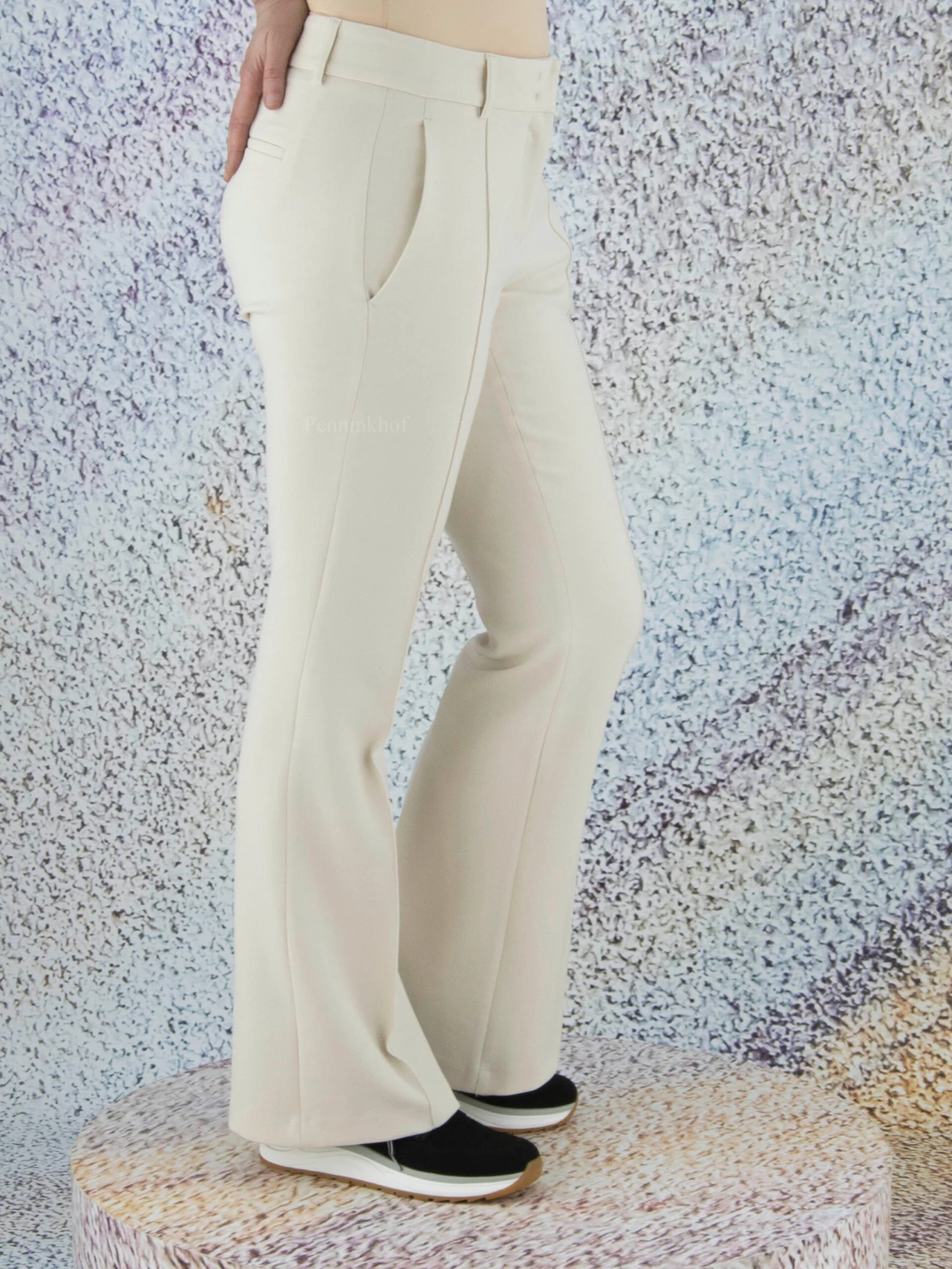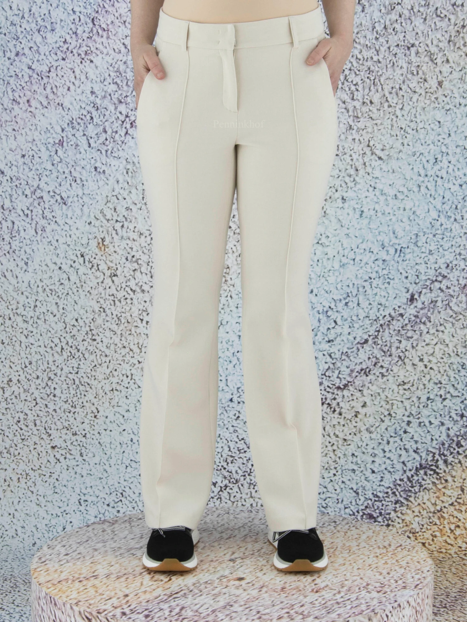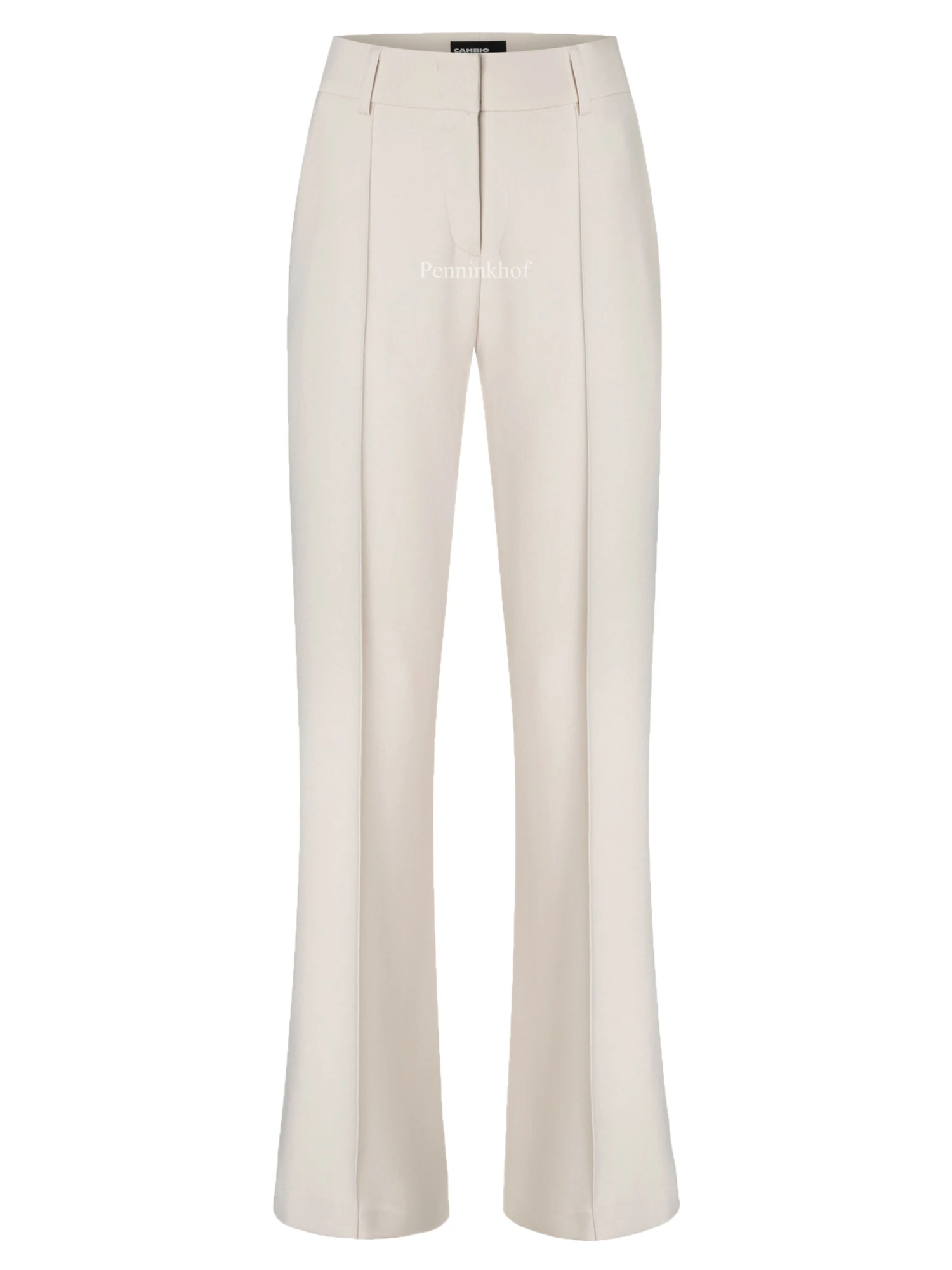 Een flared broek van Cambio in een roomwitte kleur. De broek heeft steekzakken en in het midden van de pijpen is een stiknaad. Deze broek mag op 30 graden worden gewassen.