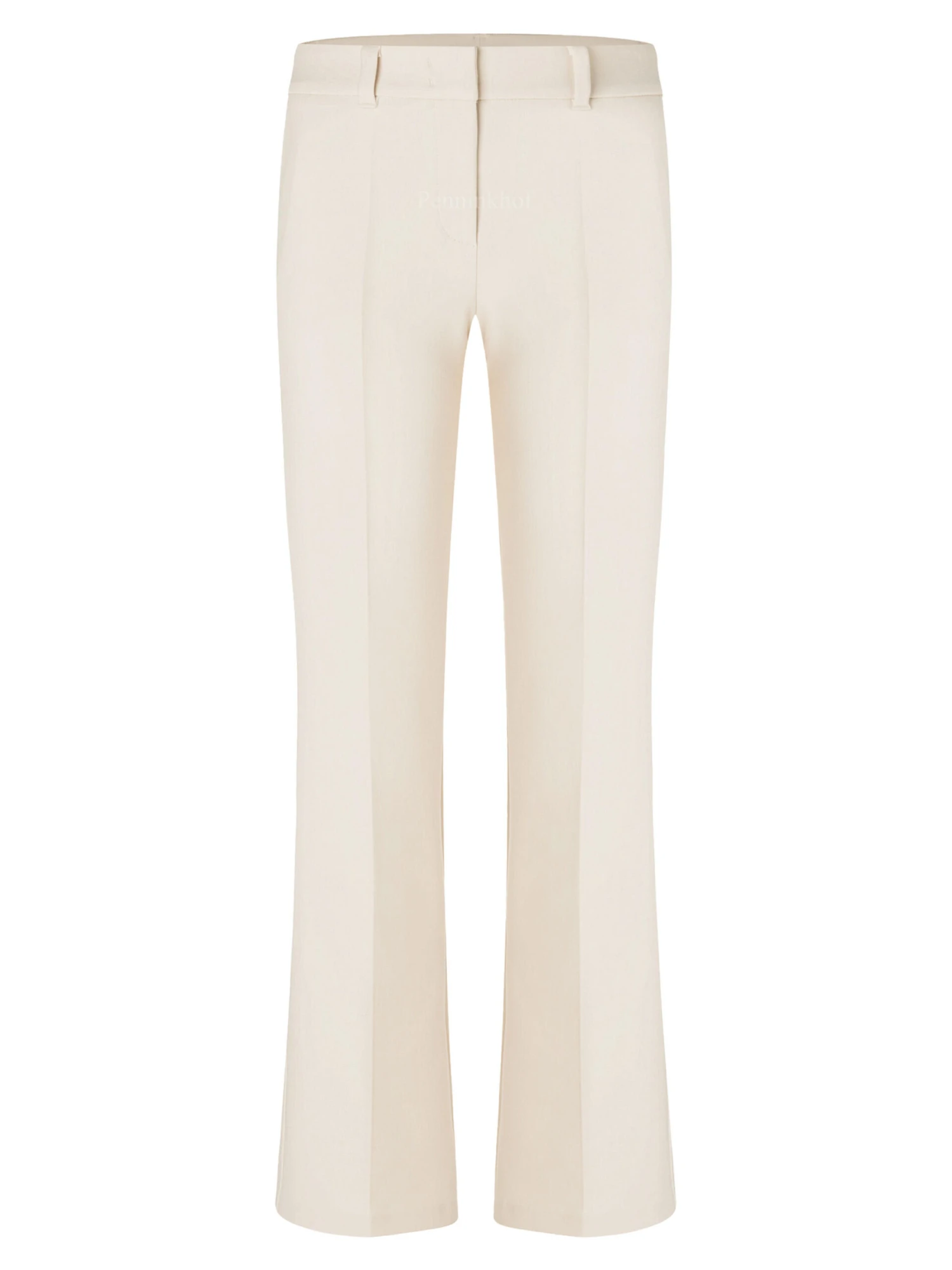 Een broek van Cambio in een beige kleur. Langs de zijkanten van de pijpen is een decoratieve stiknaad. De broek heeft steekzakken en mag op 30 graden worden gewassen.
