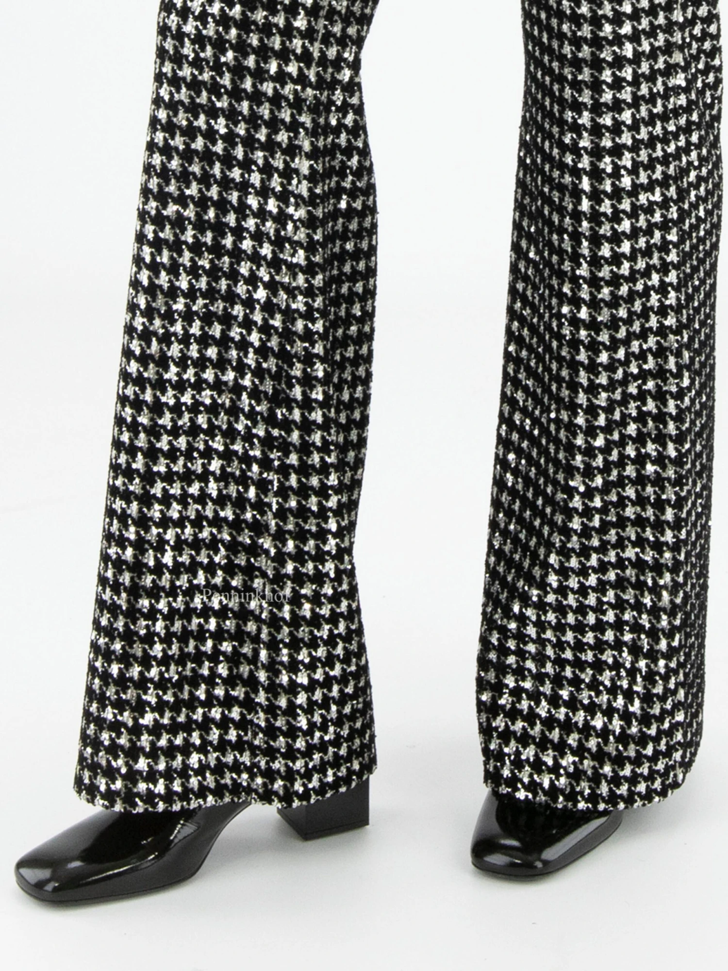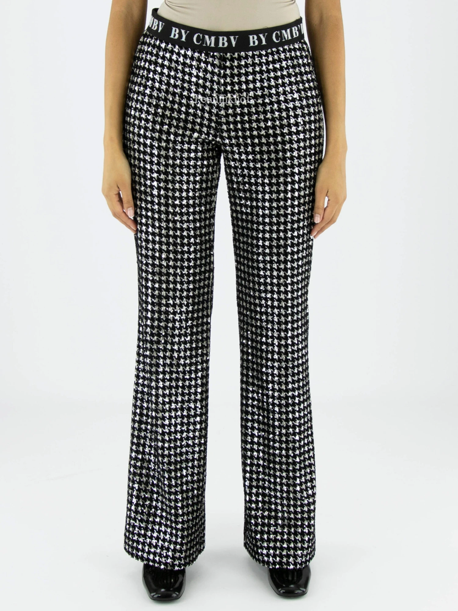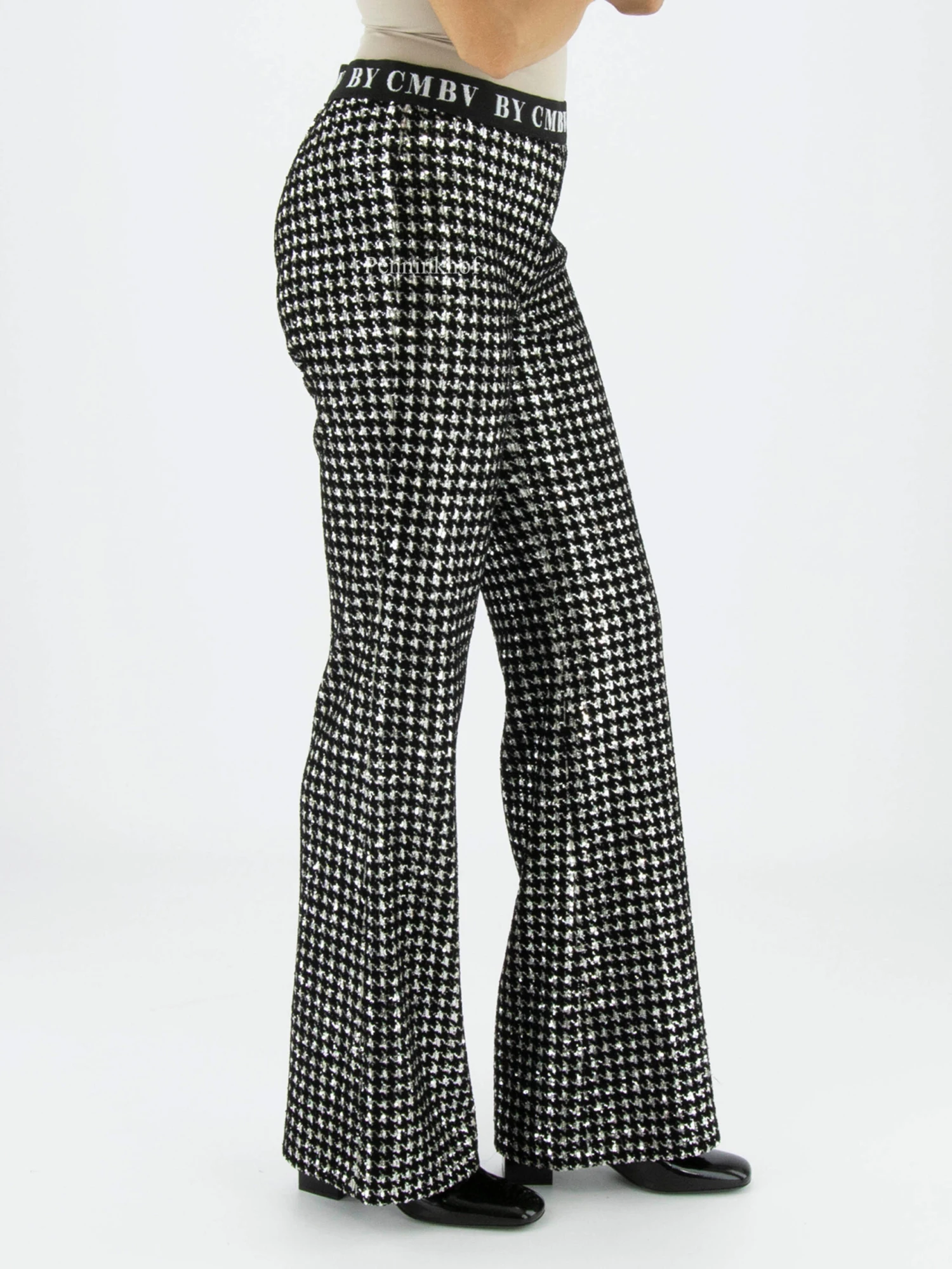 Een flared broek van Cambio in een pied de coq print met zilver kleurige lovertjes in de stof verwerkt. In de taille is ene elastieken band. Deze broek mag op de hand worden gewassen.