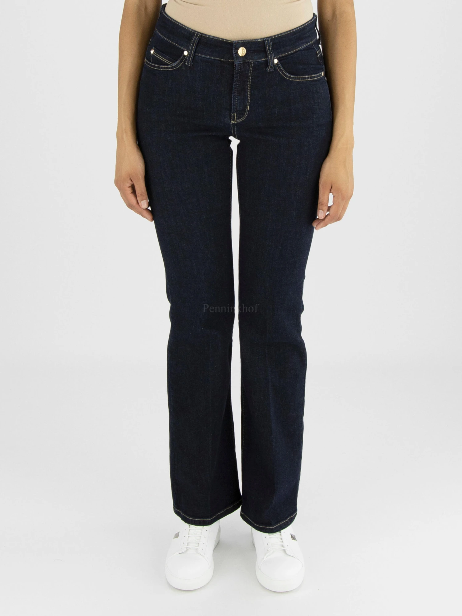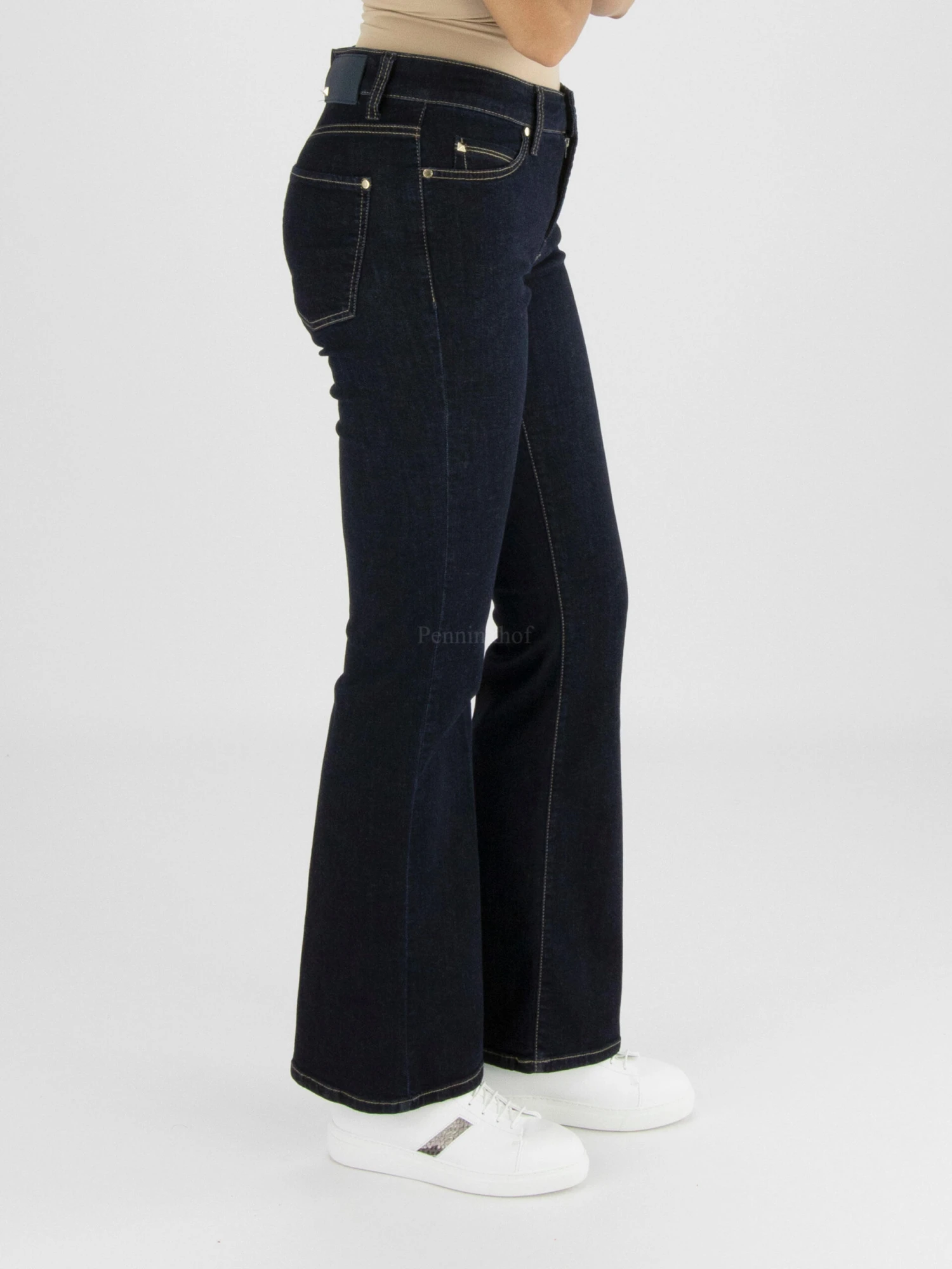 Een flared jeans van Cambio in de kleur dark denim of donkerblauw. De jeans is in een 5 pocket model en mag op 30 graden worden gewassen.
