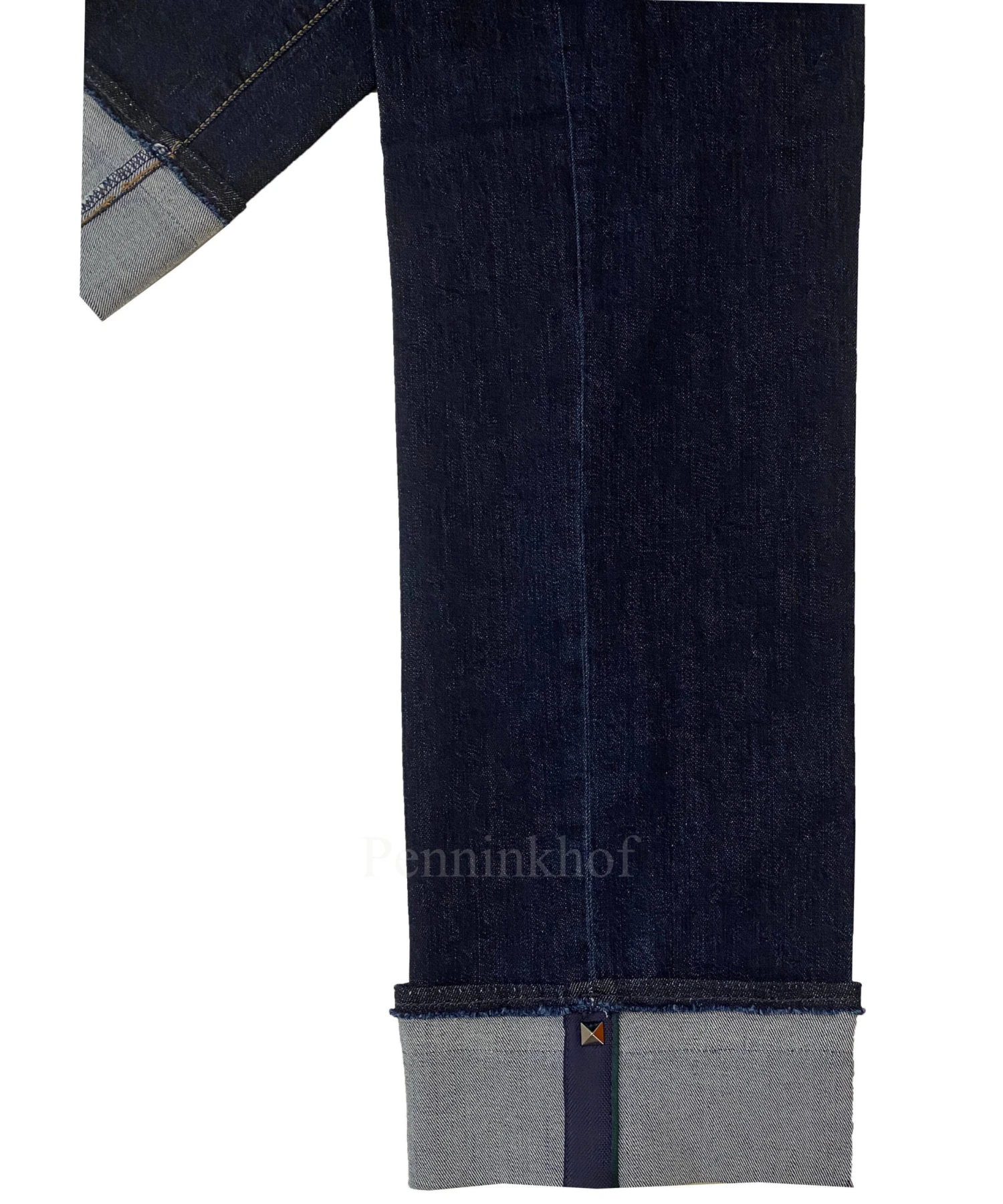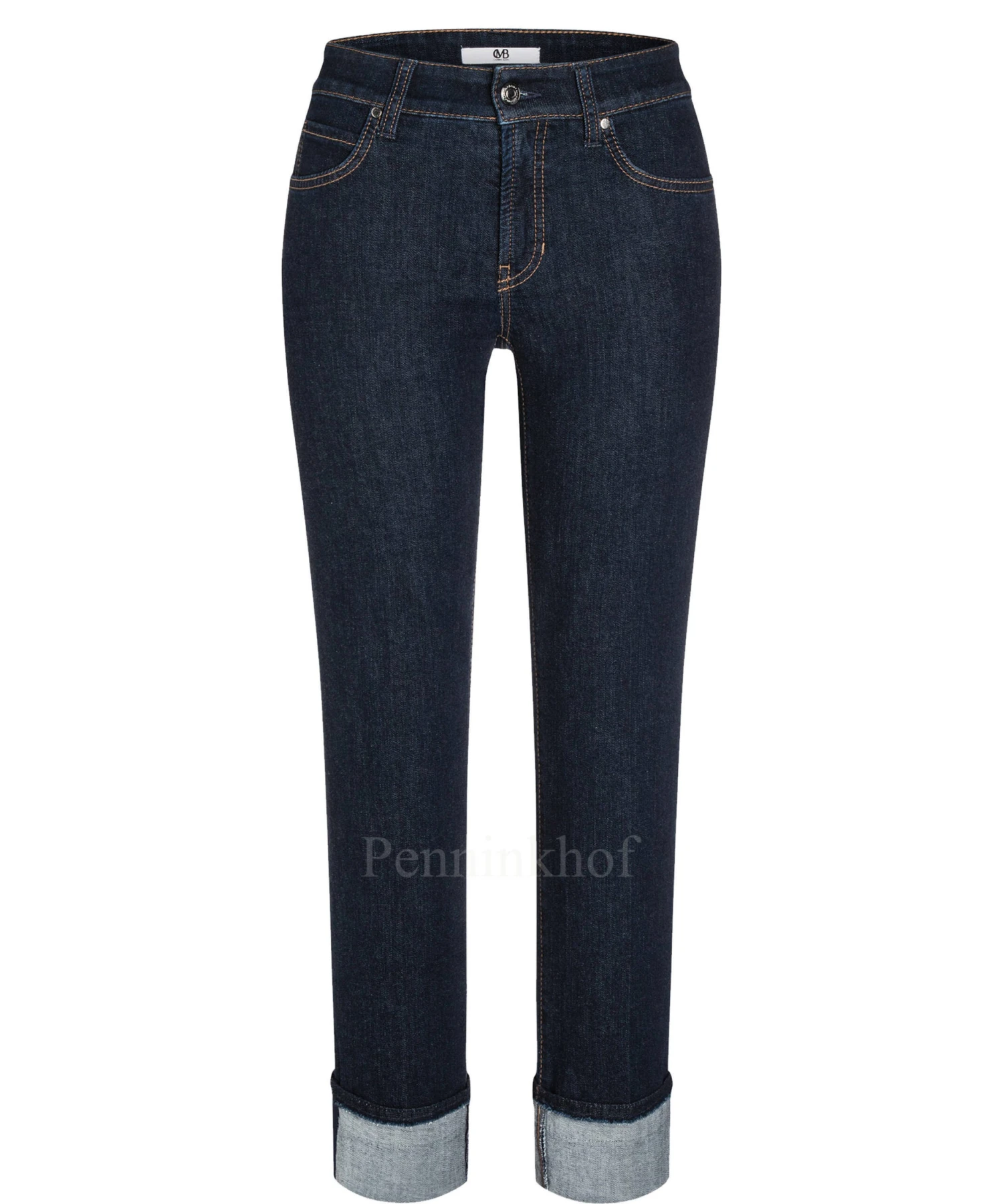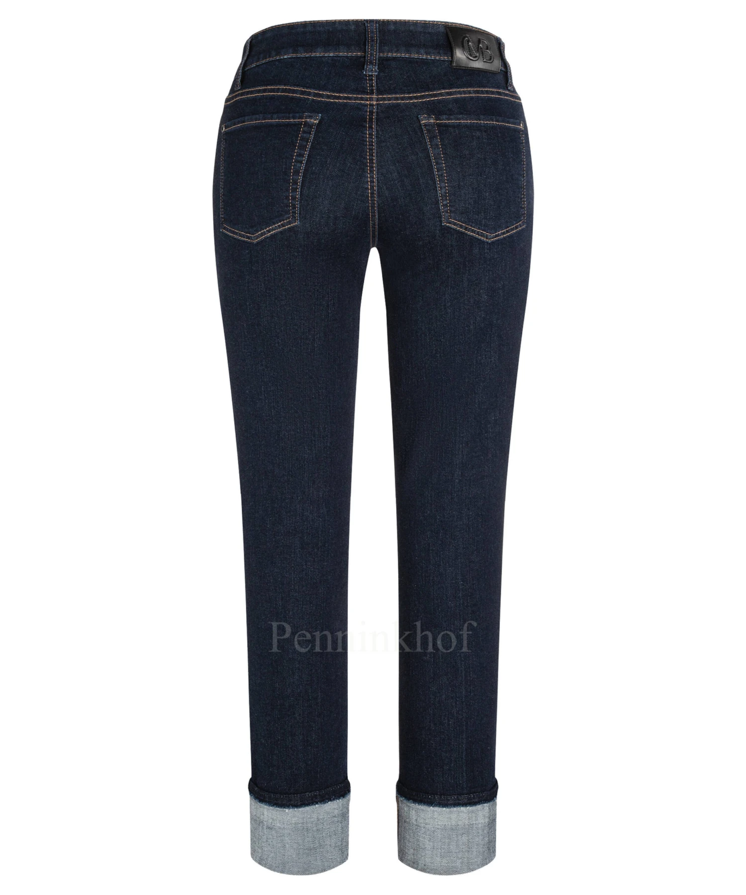 Een jeans van Cambio in een dark denim kleur. De jeans is in een 5 pocket model. De jeans heeft cognac kleurige stiksels en aan de onderkant van de pijpen is een brede omslag. Deze jeans mag op 30 graden worden gewassen.