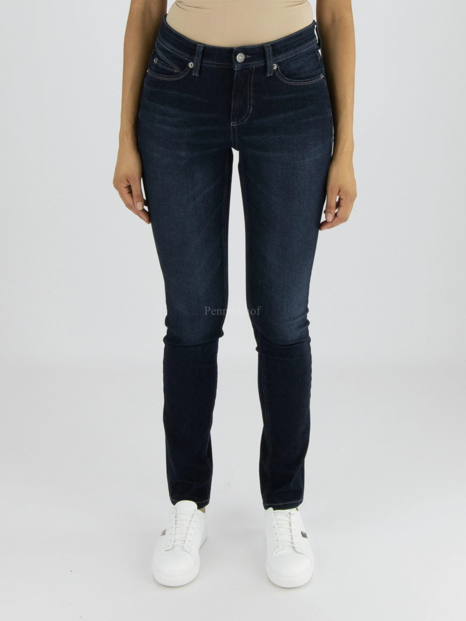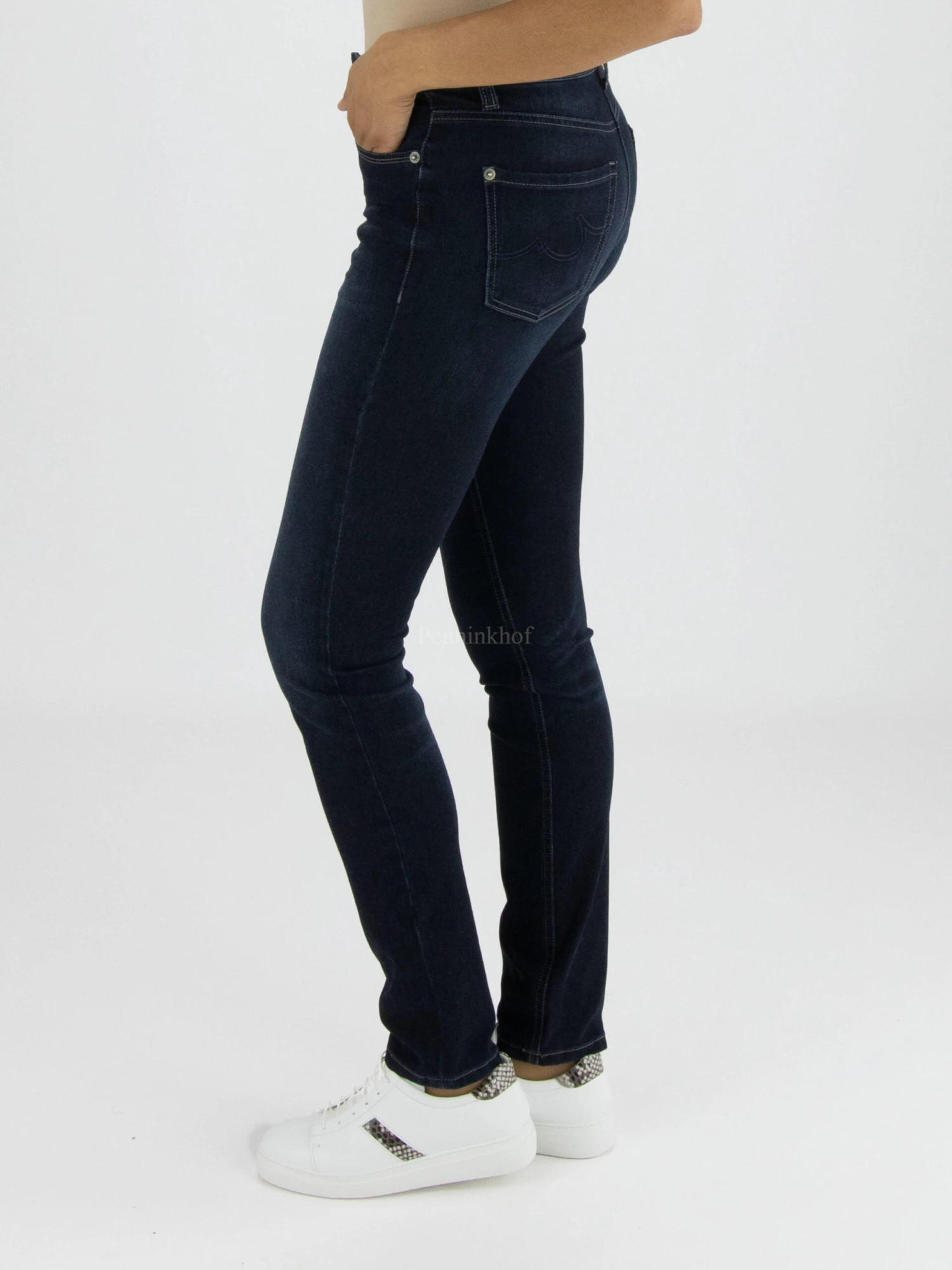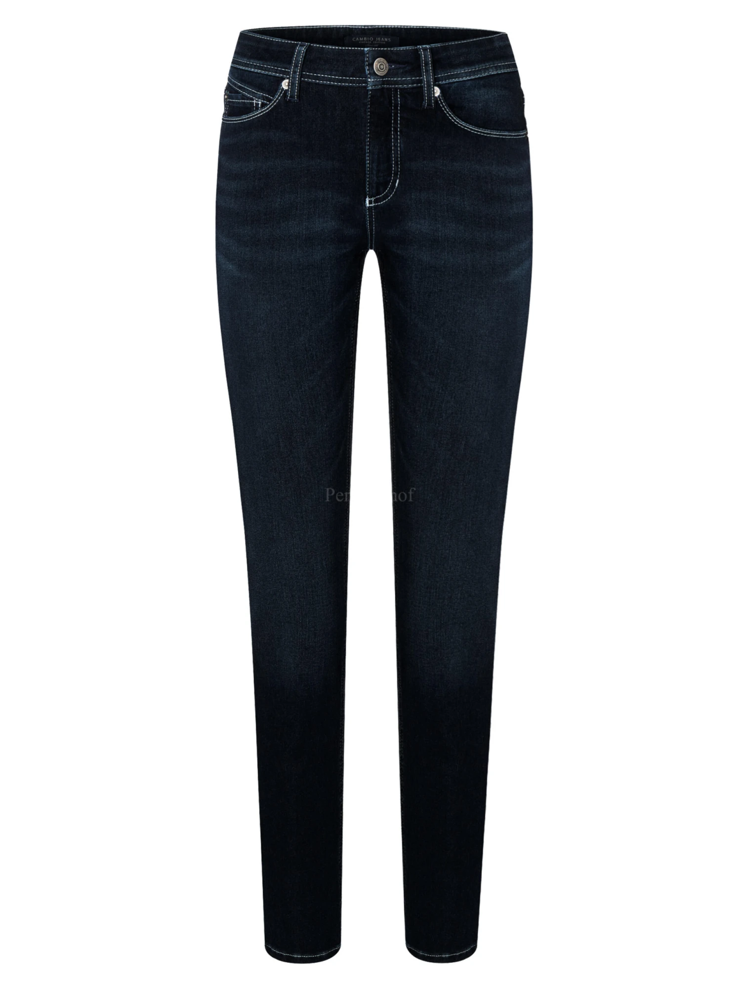 Een jeans van Cambio in een donkere jeans kleur. De broek is in een 5 pocket model en mag op 30 graden worden gewassen.