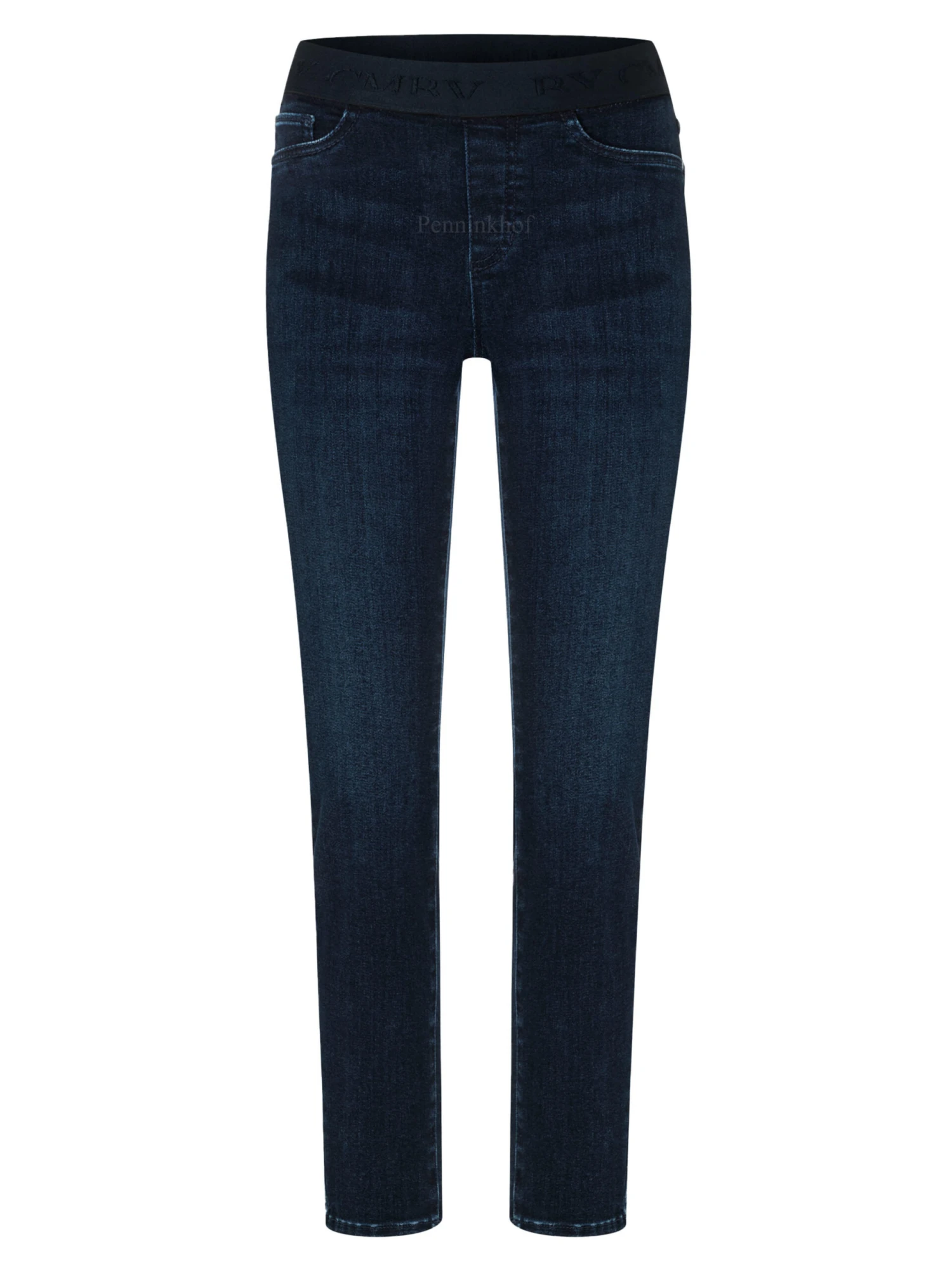 Een gewassen jeans van Cambio in de kleur dark blue. In de taille is een elastieken band. De jeans is in een 5 pocket model. Deze jeans mag op 30 graden worden gewassen.