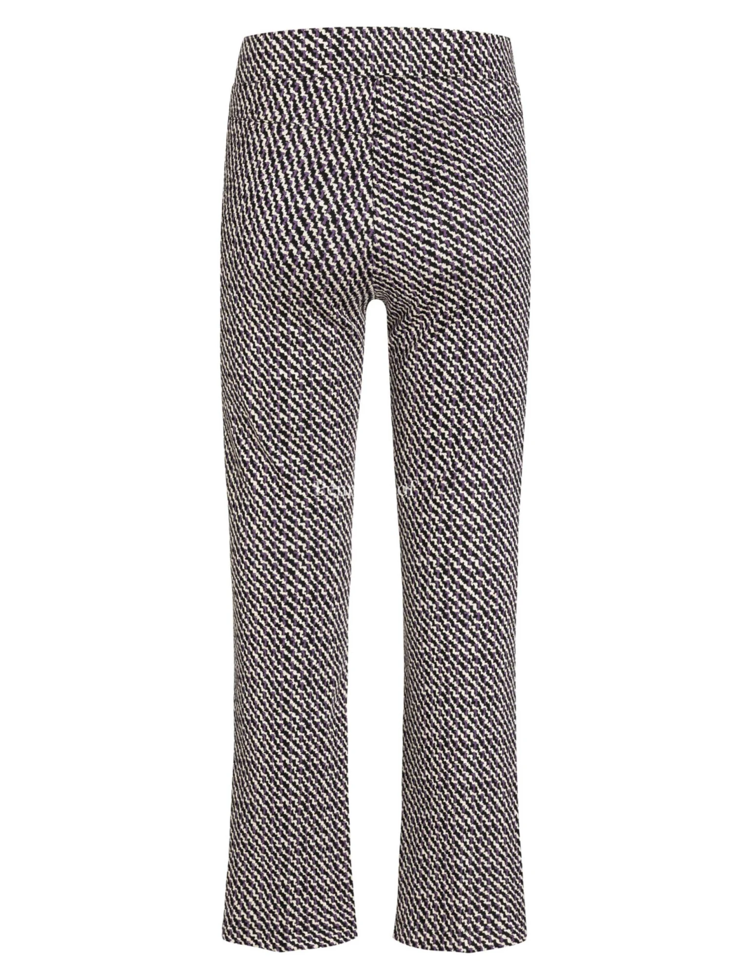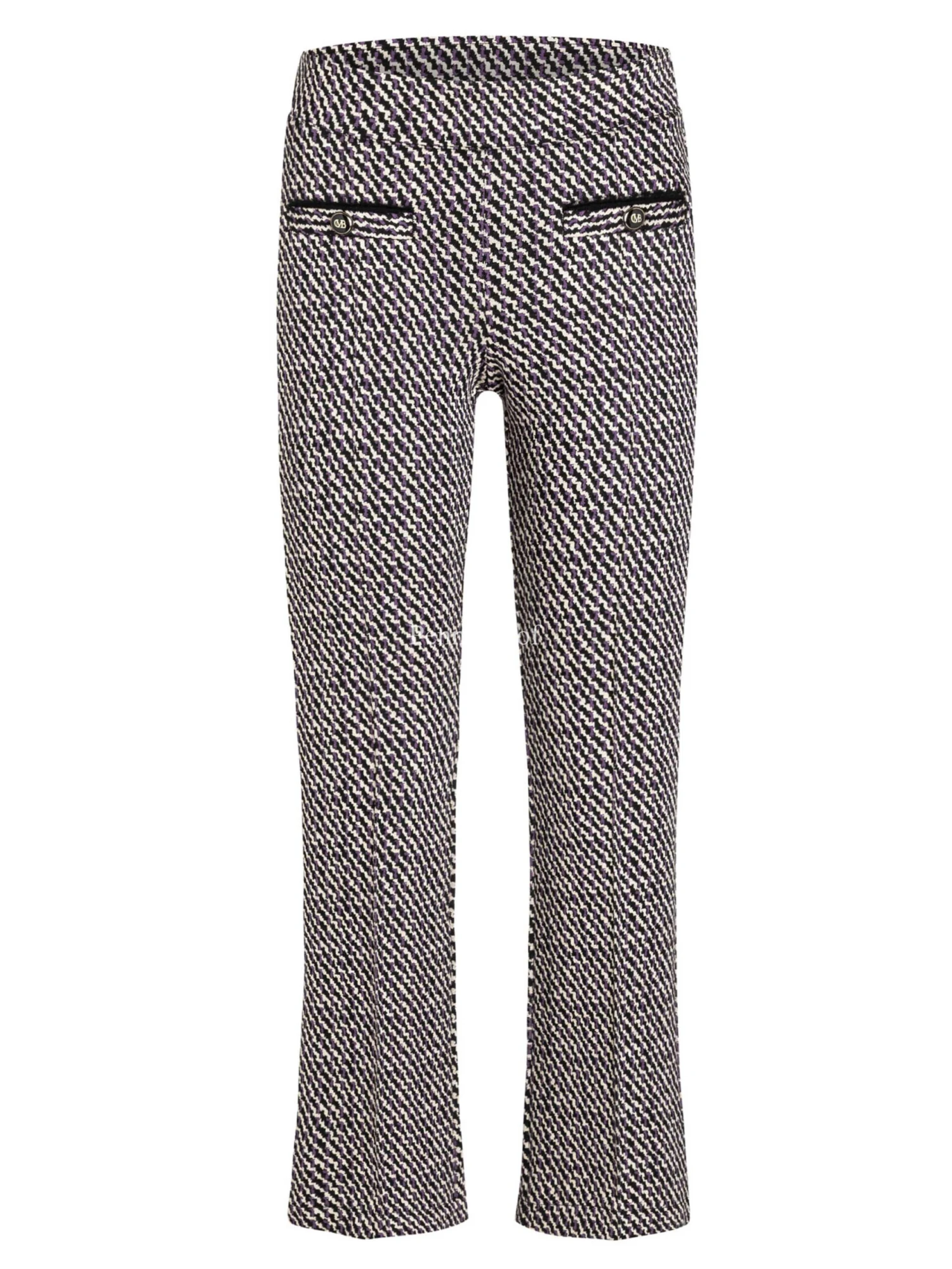 Een broek van Cambio in een soort pied de coq print met de kleuren paars, roomwit en zwart. In de taille is een elastieken band. Deze broek mag op de hand worden gewassen.