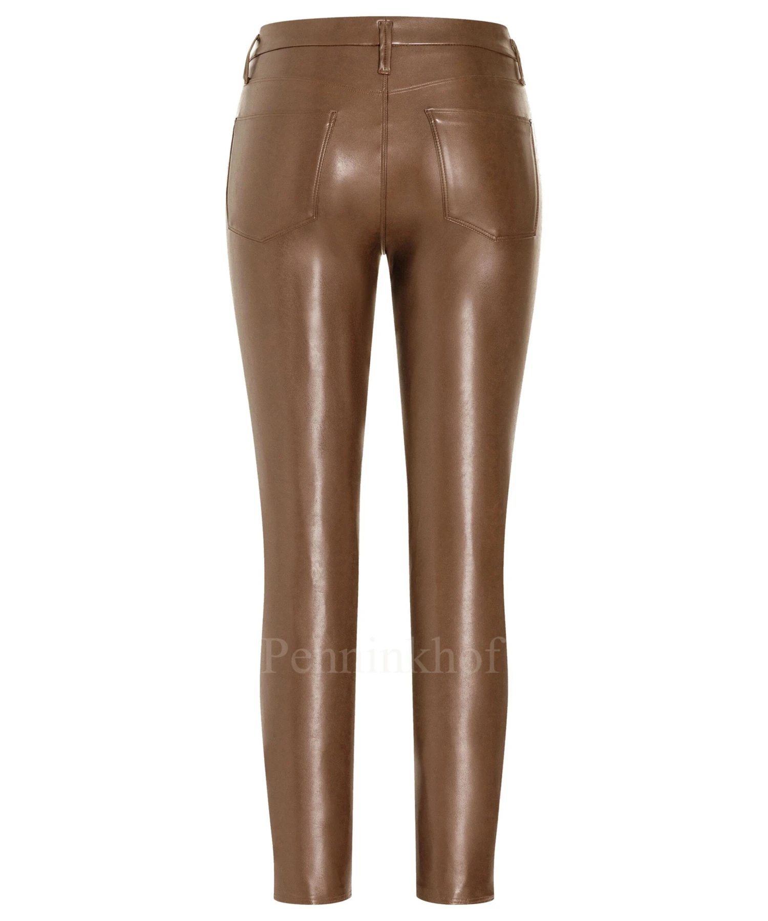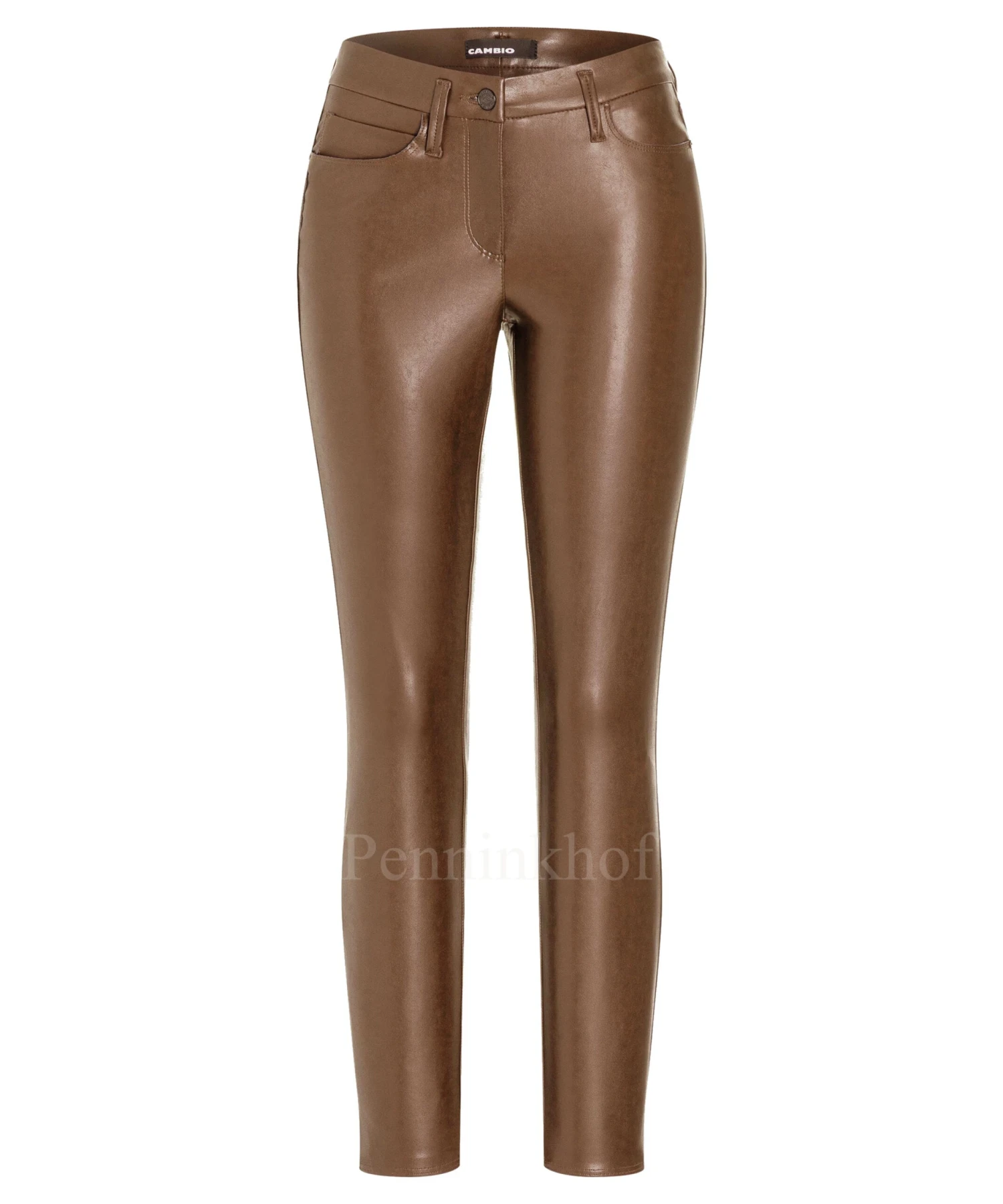 Een imitatie lederen broek van Cambio in de kleur cognac. De broek is in een 5 pocket model. Deze broek mag op de hand worden gewassen.