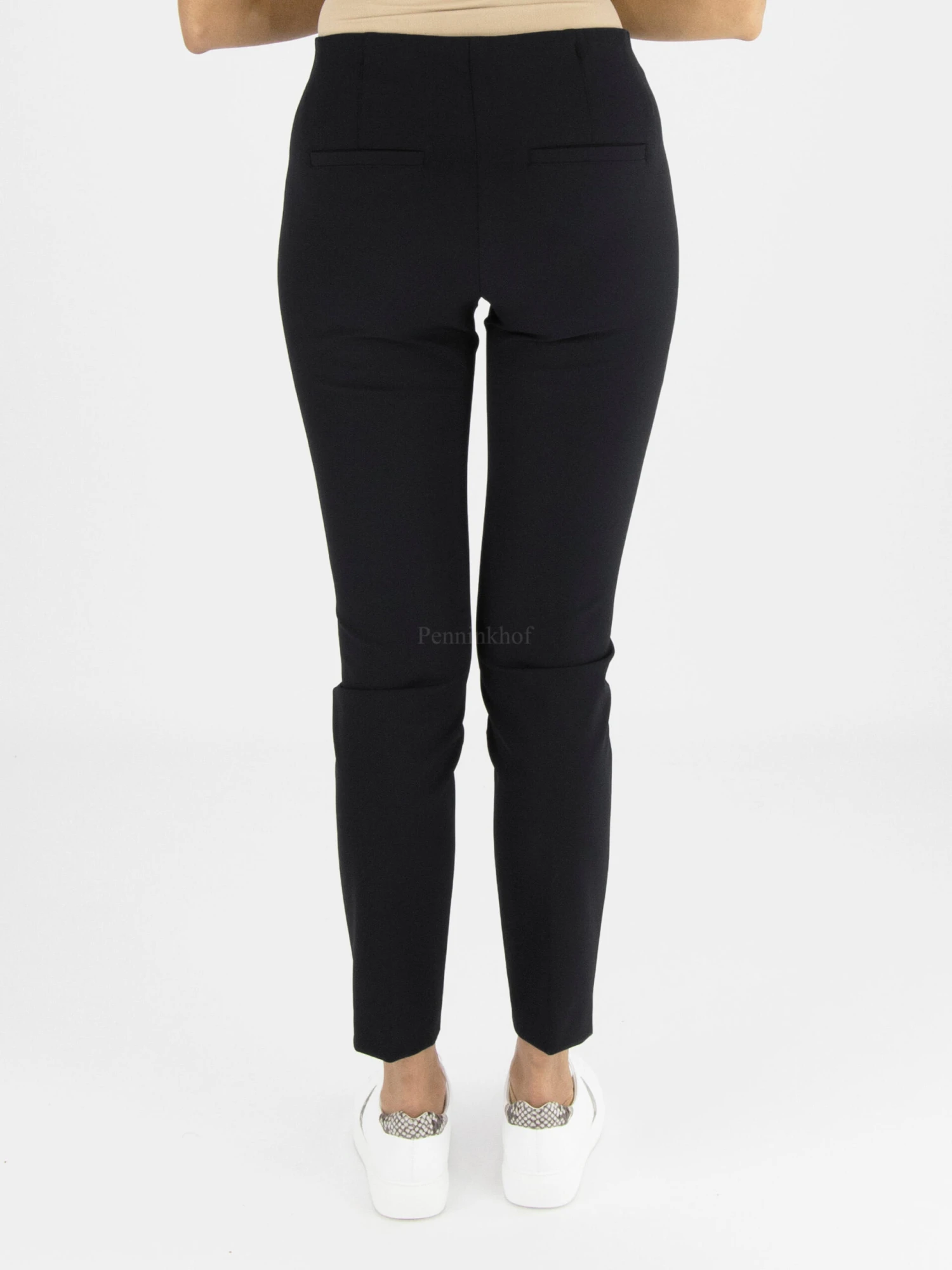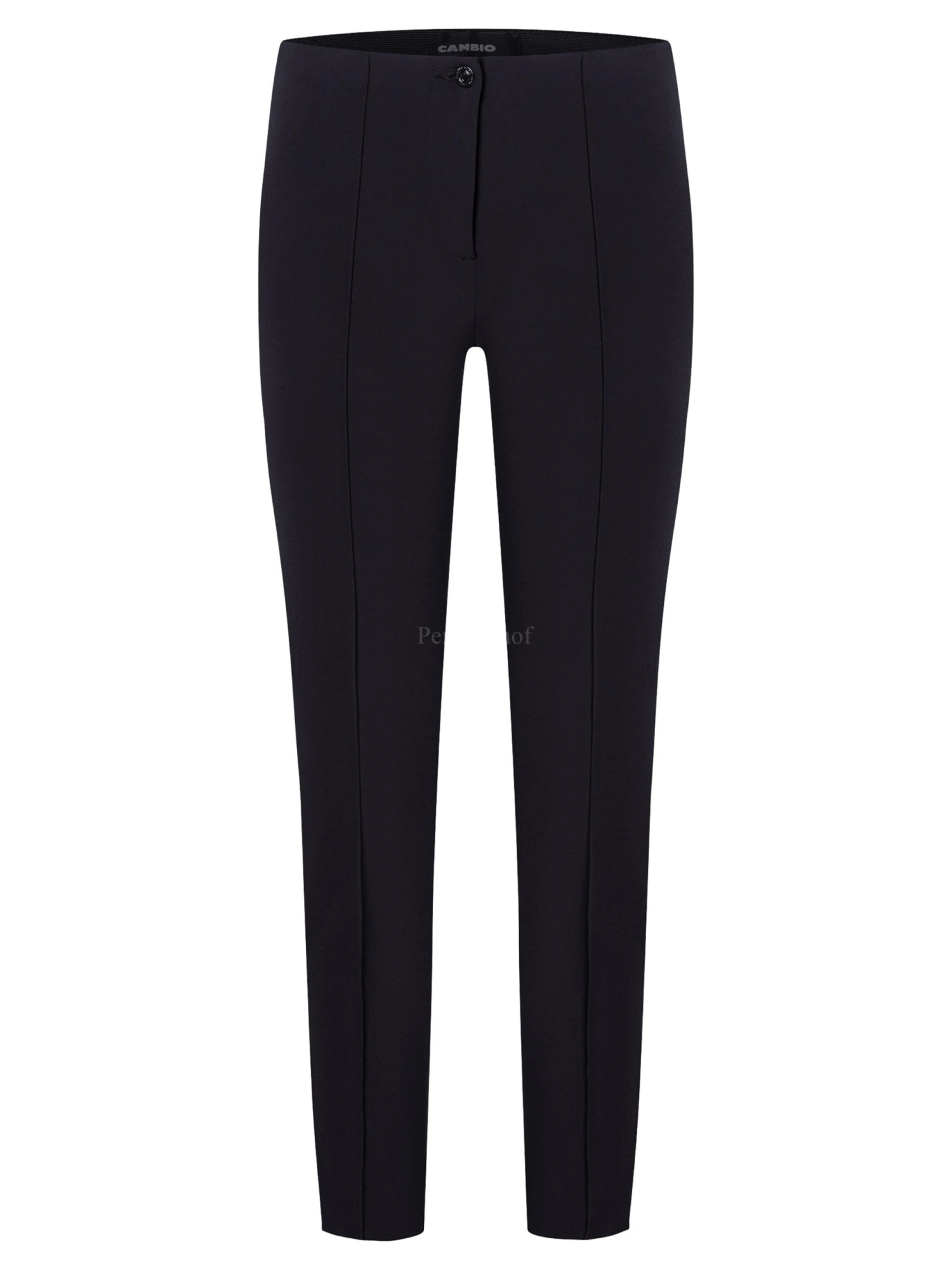 Een broek van Cambio in de kleur marineblauw . In de taille is een elastieken band. Over het midden van de pijpen is een stiknaad. Deze broek mag op de hand worden gewassen.
