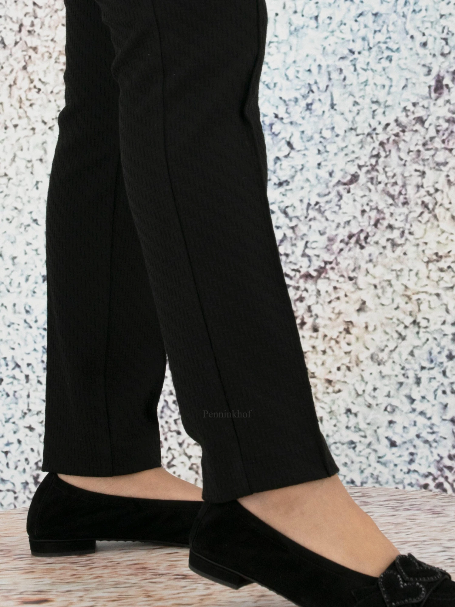 Een broek van het merk Cambio in de kleur zwart. De stof is in een reliëf structuur van horizontale en verticale streepjes. In de taille is een elastieken band van 3 cm breed. Over het midden van de pijpen is een stiknaad. Deze broek mag op 30 graden worden gewassen.