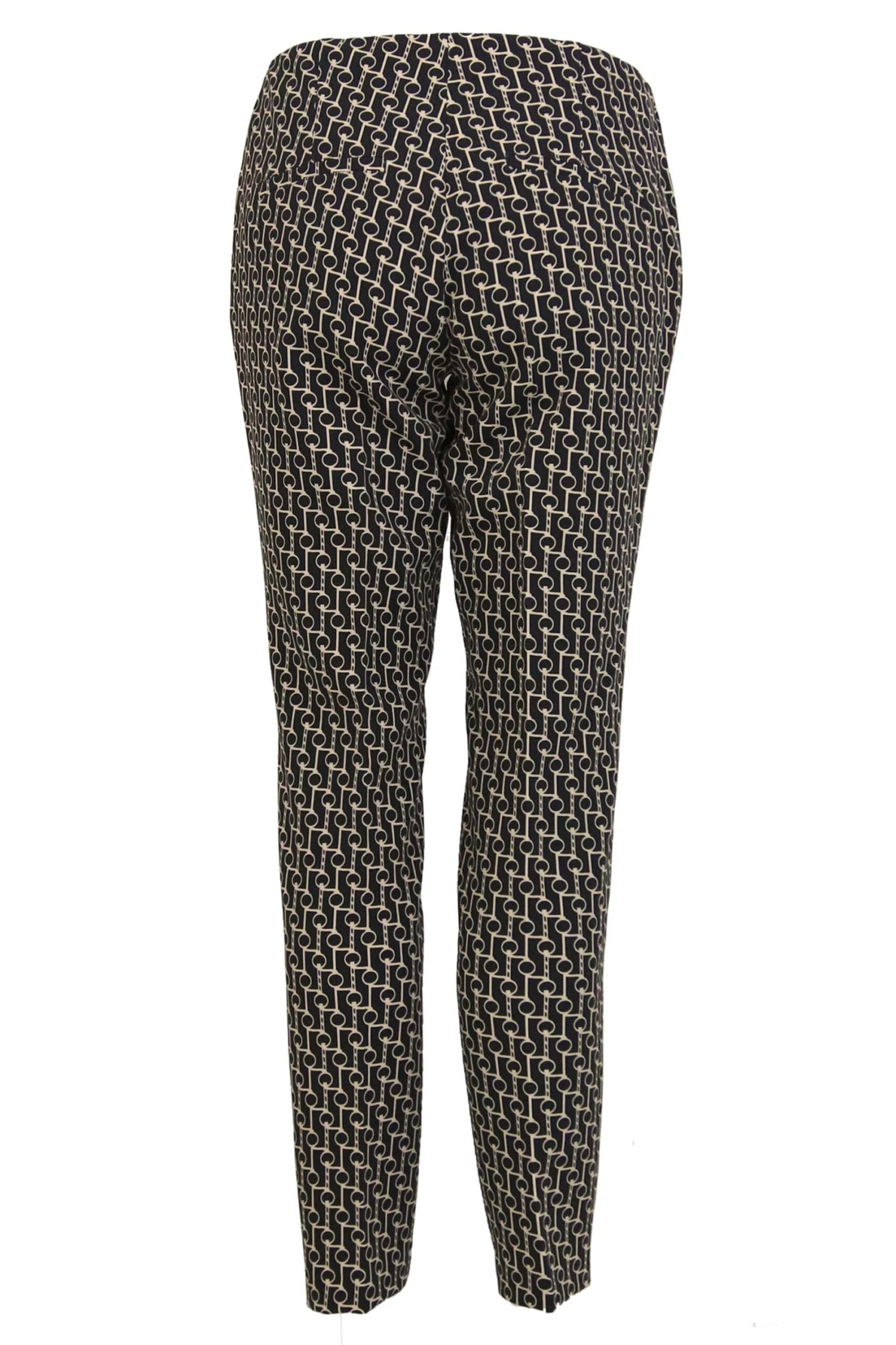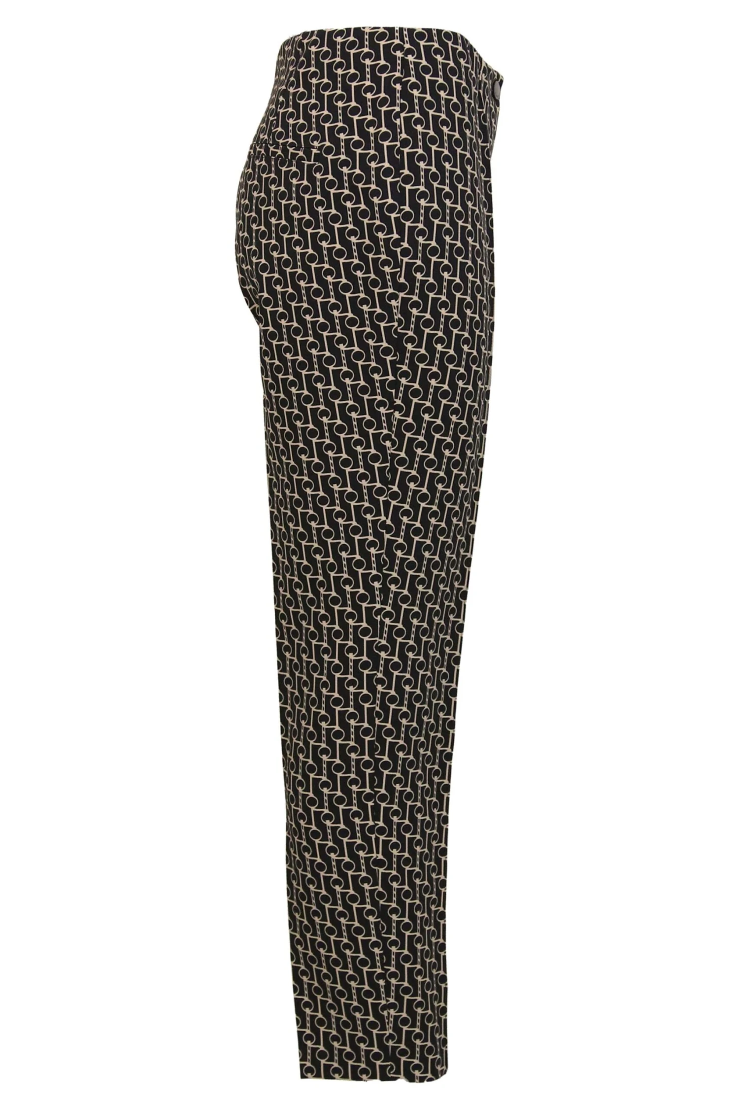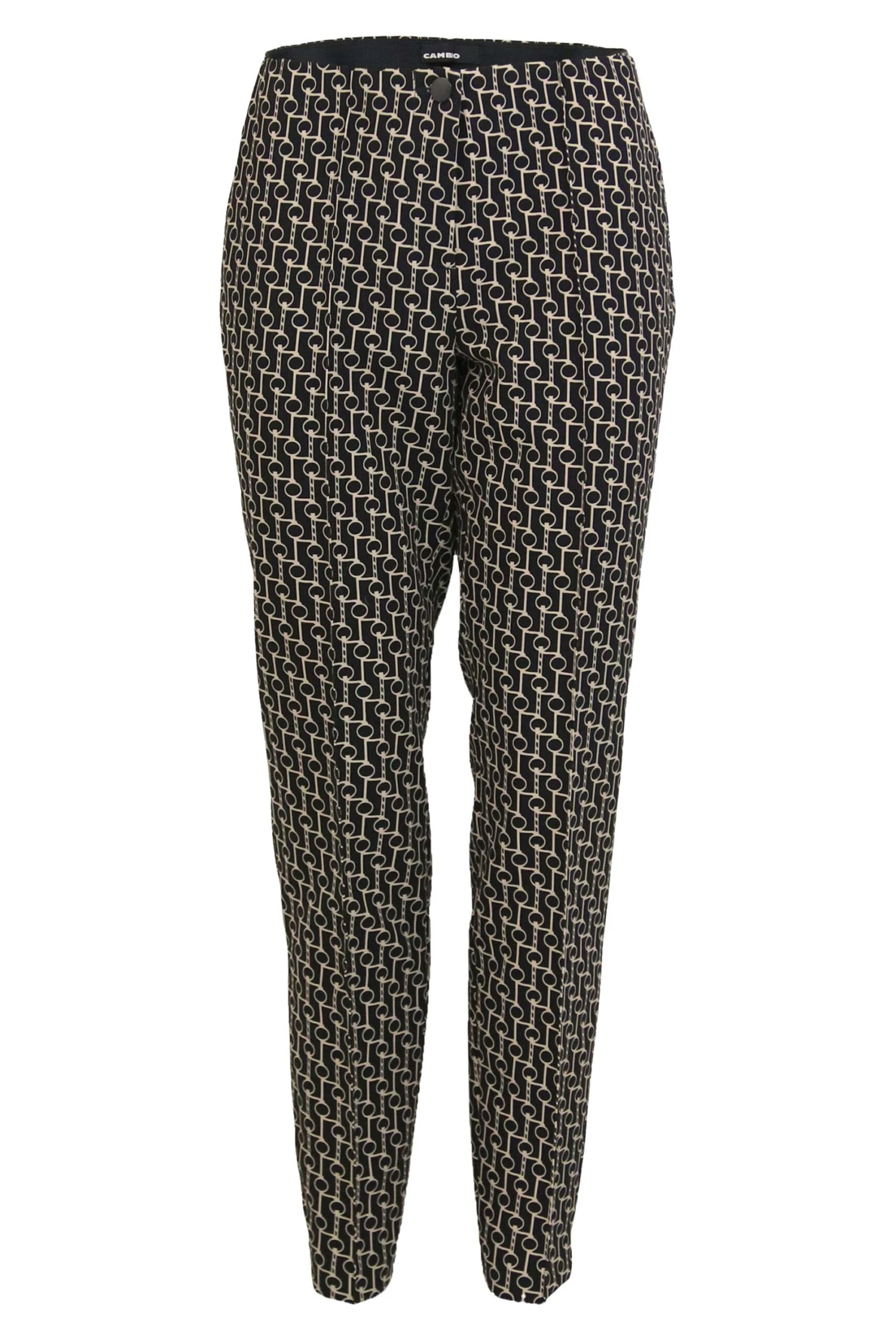 Een broek van Cambio in een grafische print met de kleur zand op een zwarte achtergrond. In de taille is een elastieken band. In het midden van de pijpen is aan de voorkant een stiknaad. Deze broek mag op 30 graden worden gewassen.