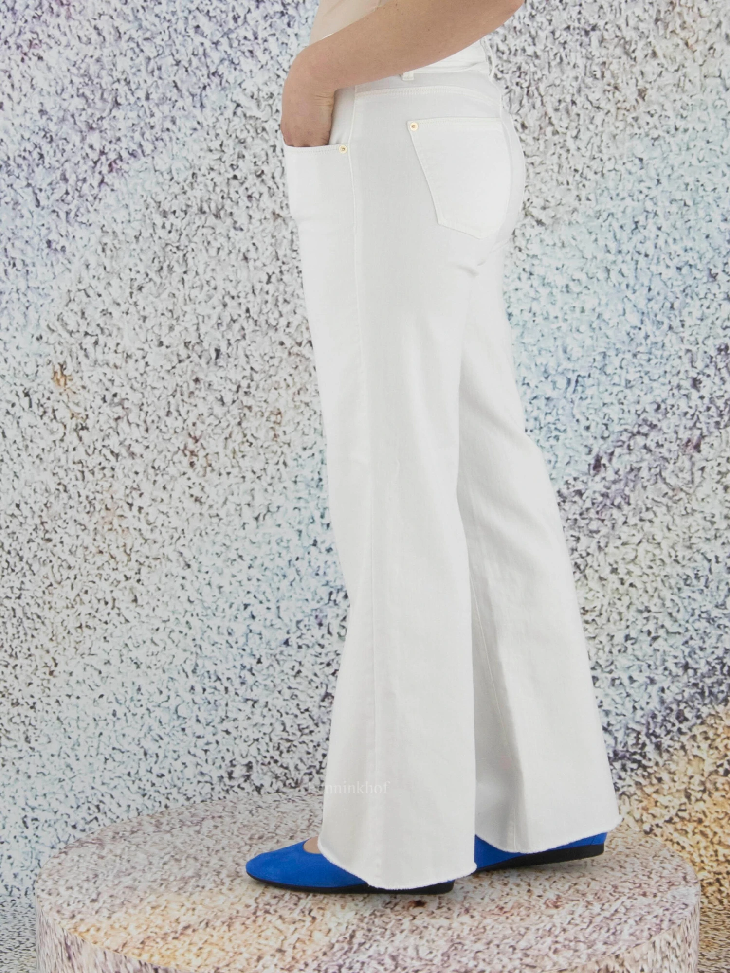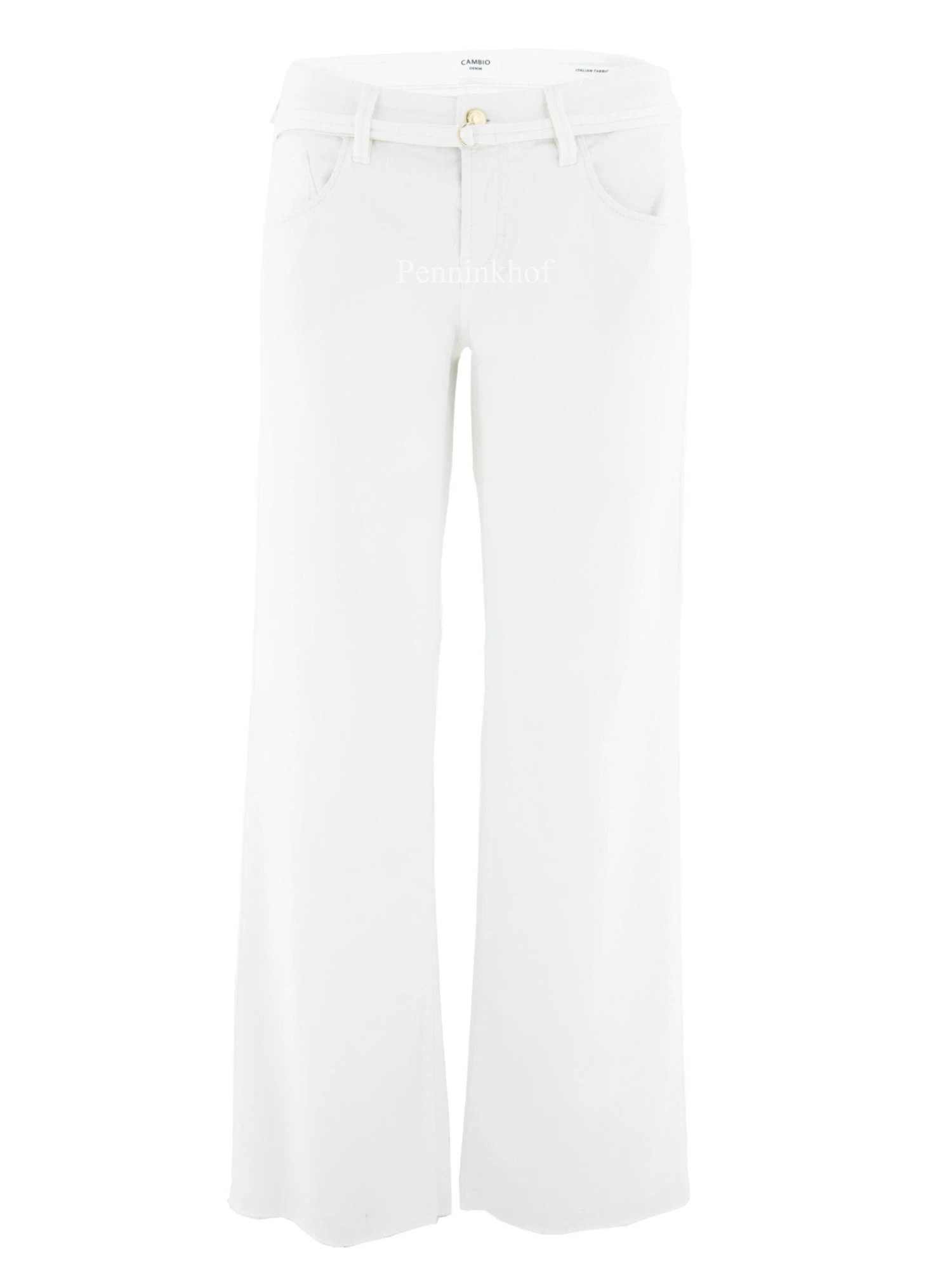 Een wijde jeans van Cambio in de kleur wit. De jeans is in een 5 pocket model en de rand aan de onderkant van de pijpen is fijn gerafeld. Deze jeans mag op 30 graden worden gewassen.