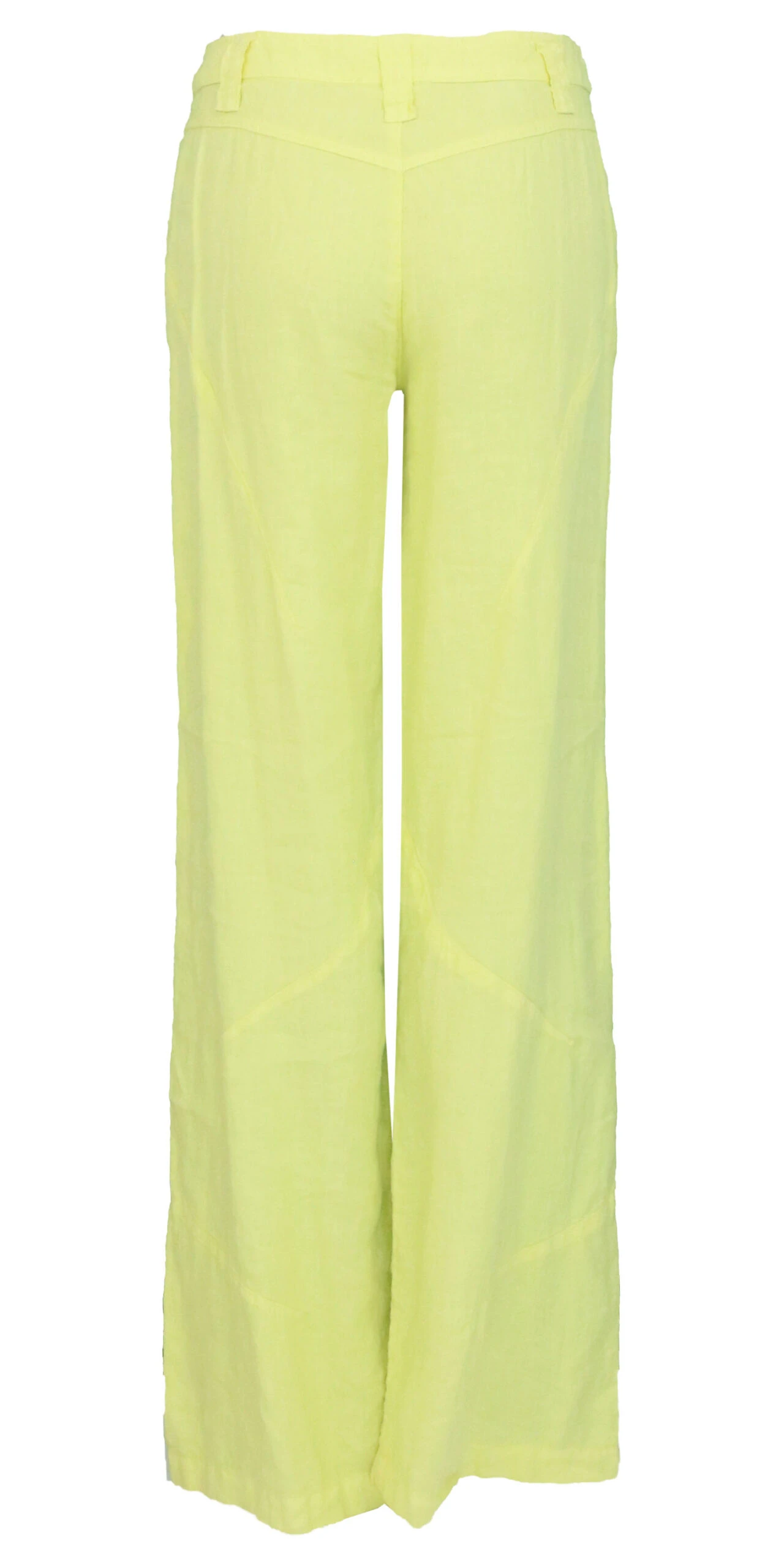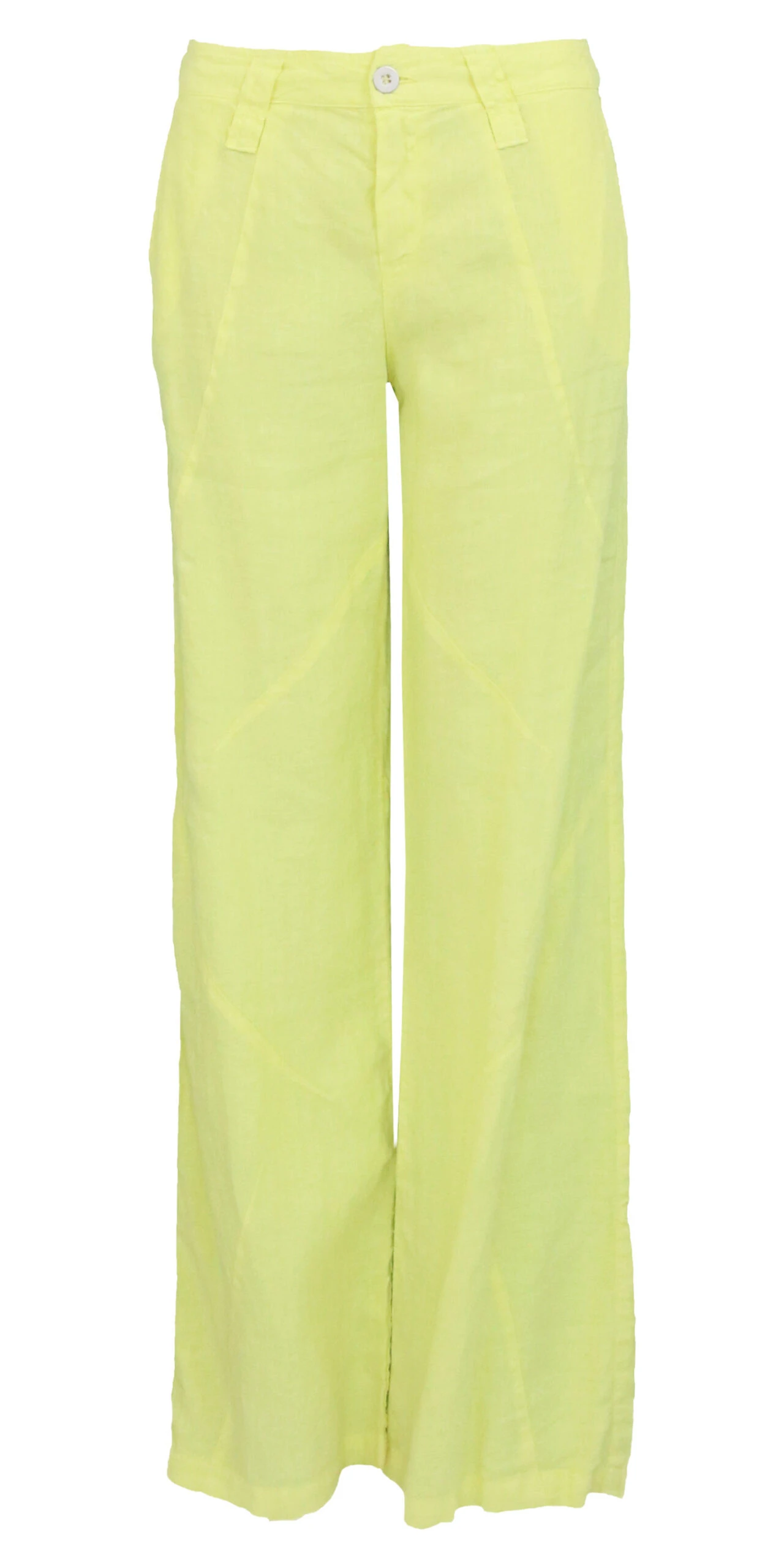 Een broek van Tandem in een pastel gele kleur. De broek heeft steekzakken en op het bovenbeen zijn enkele diagonale stiknaden. Deze broek mag op de hand worden gewassen.