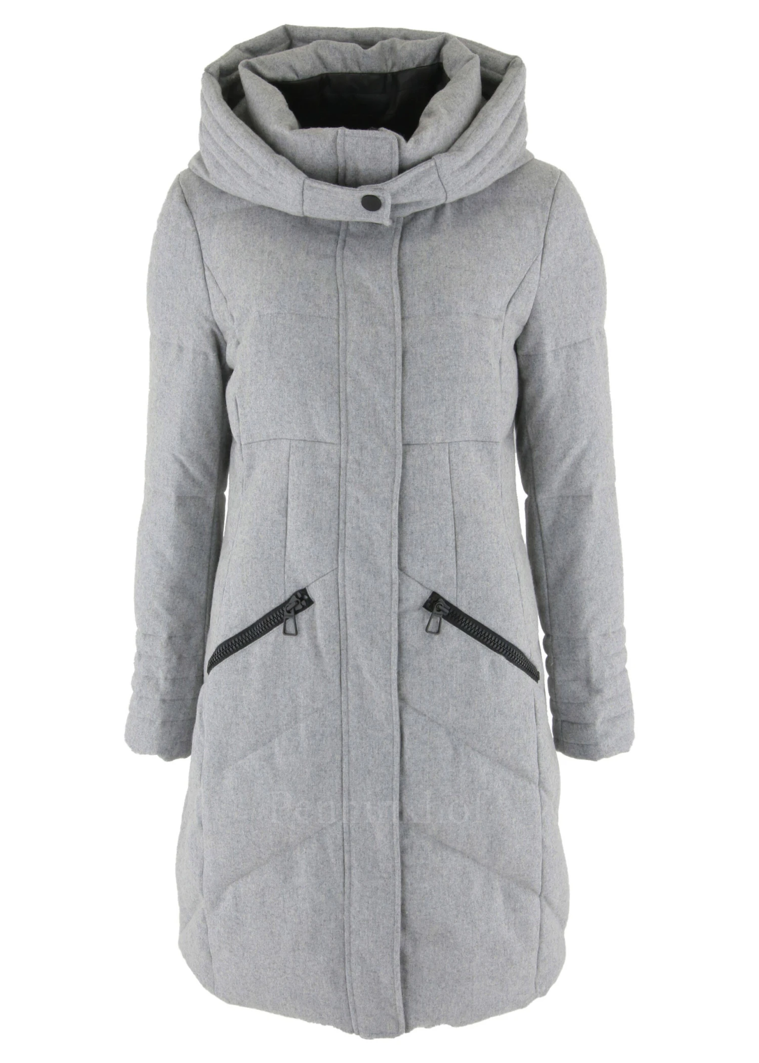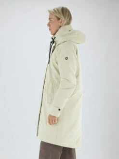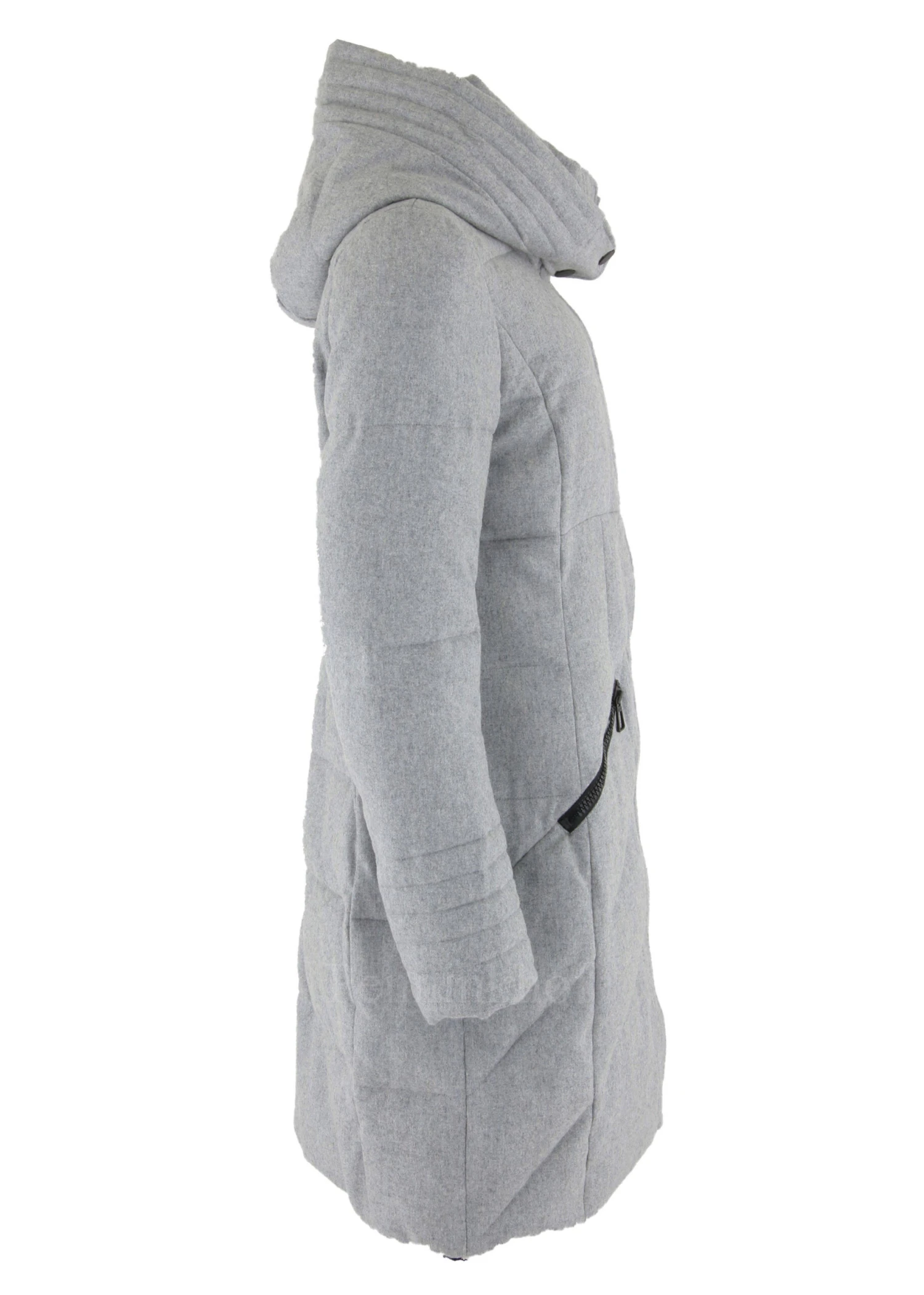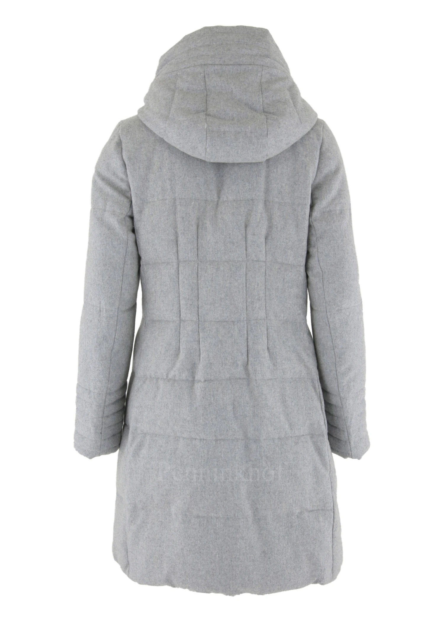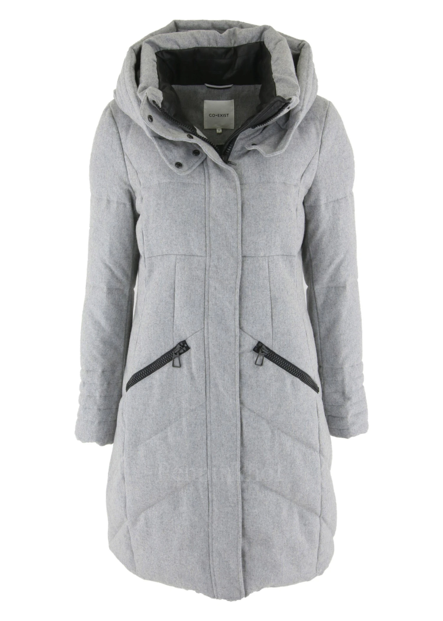 Een halflange coat van Co Exist in een licht grijze kleur. De coat heeft diagonale, verticale en horizontale stiknaden. de capuchon is afritsbaar. De coat heeft een ritssluiting met drukknopen. De steekzakken hebben een ritssluiting. Deze coat mag niet worden gewassen.