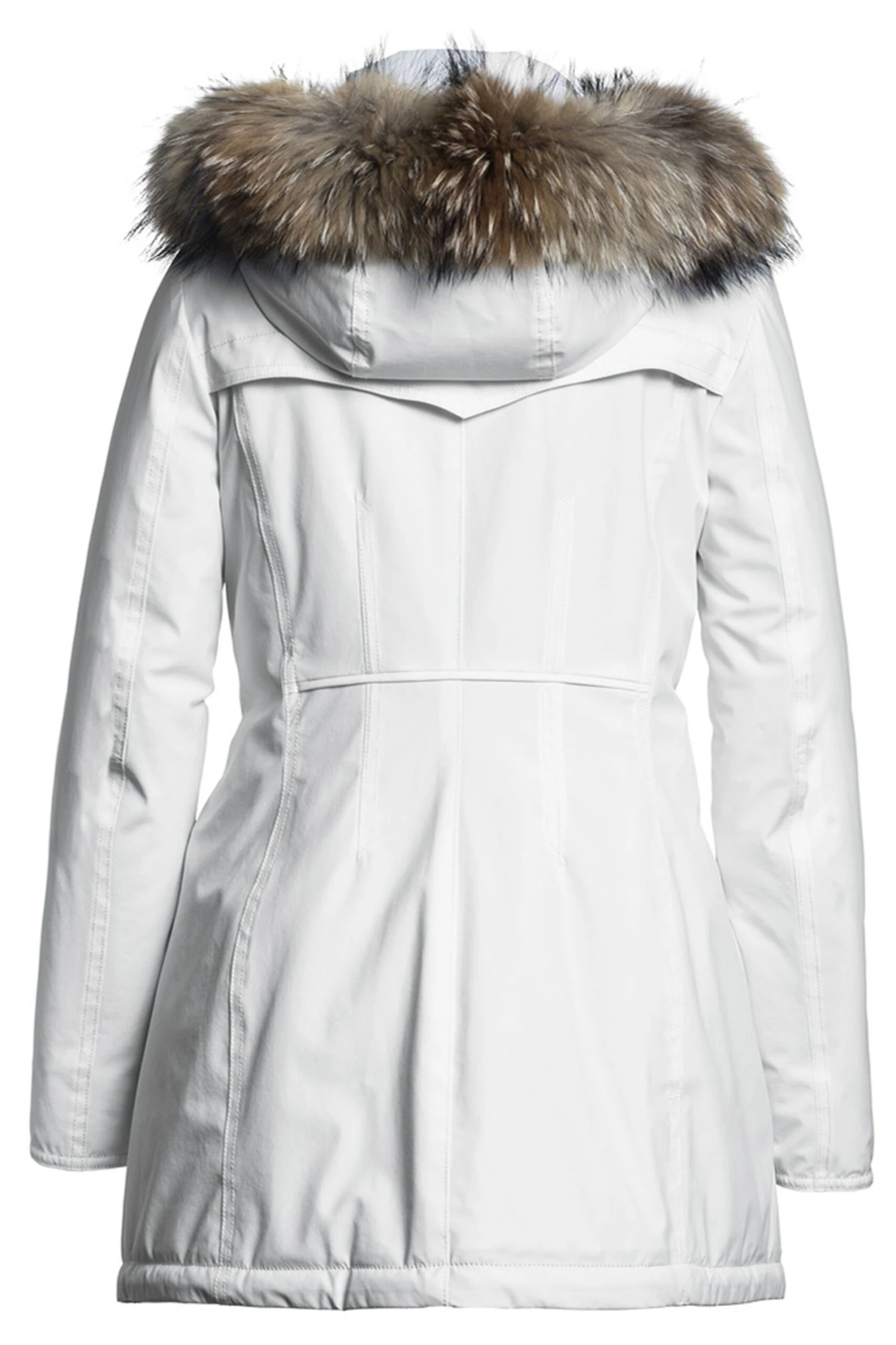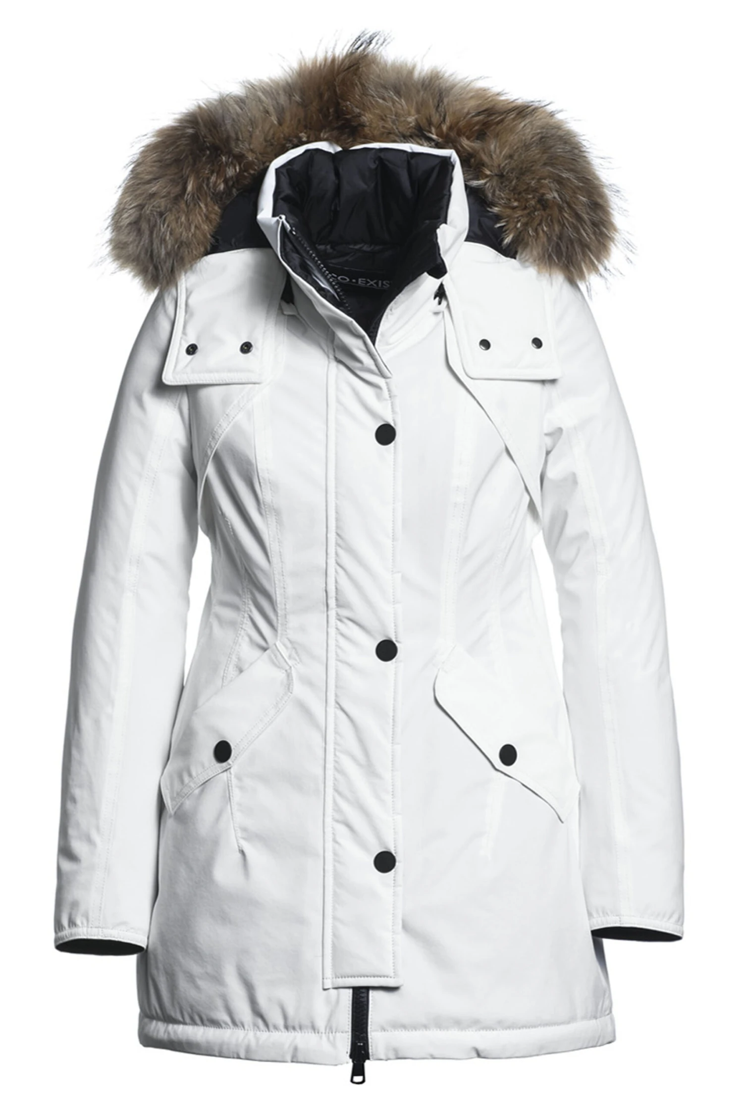 Een coat van co exist in de kleur roomwit. De coat heeft een afritsbare capuchon met een bontkraag. De steekzakken hebben een omslag met een drukknoop. Deze coat mag op 30 graden worden gewassen.