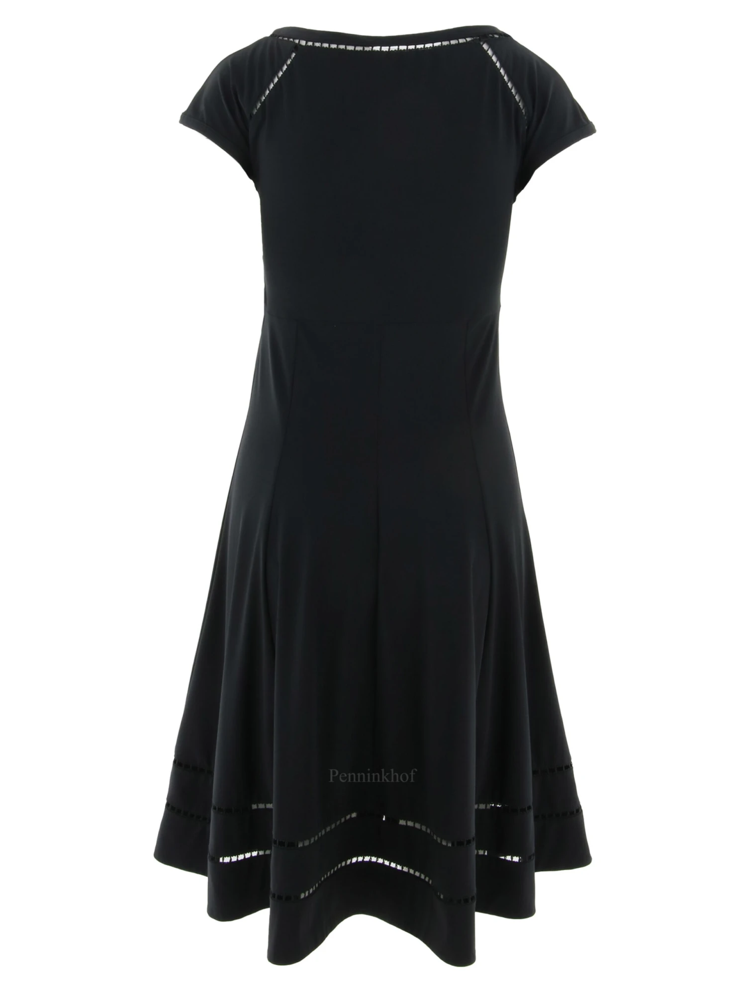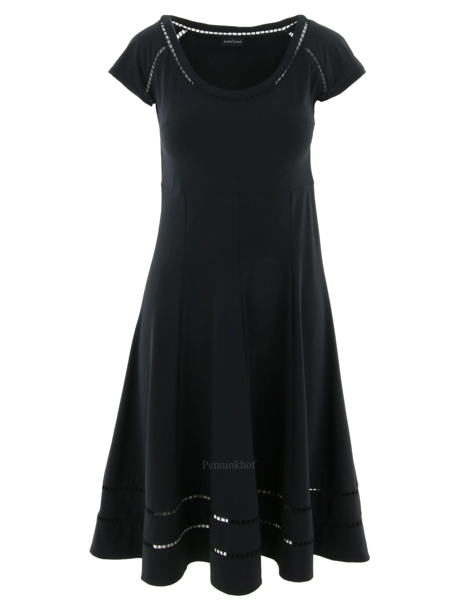 Een jurk van Cassiopée in de kleur zwart. Langs de rand van de ronde hals, Aan de onderkant van de jurk en bij de schouders zijn ajourbiezen. Vanuit de taille heeft de jurk een A- Lijn. Deze jurk mag op de hand worden gewassen.