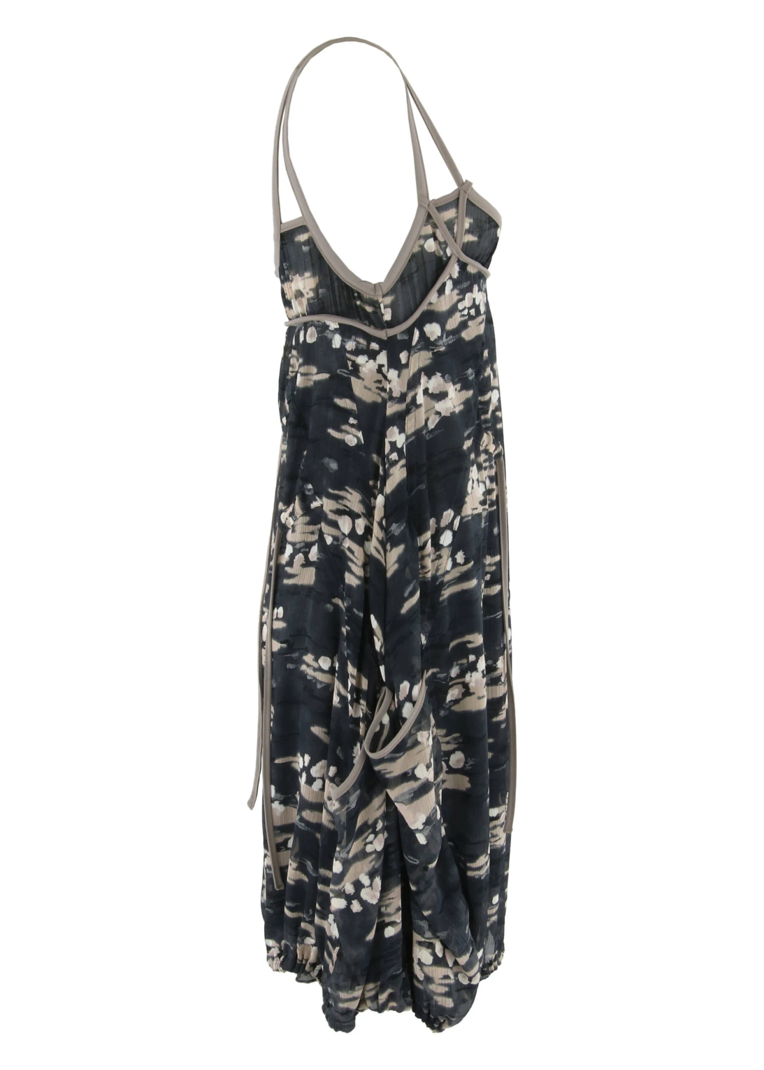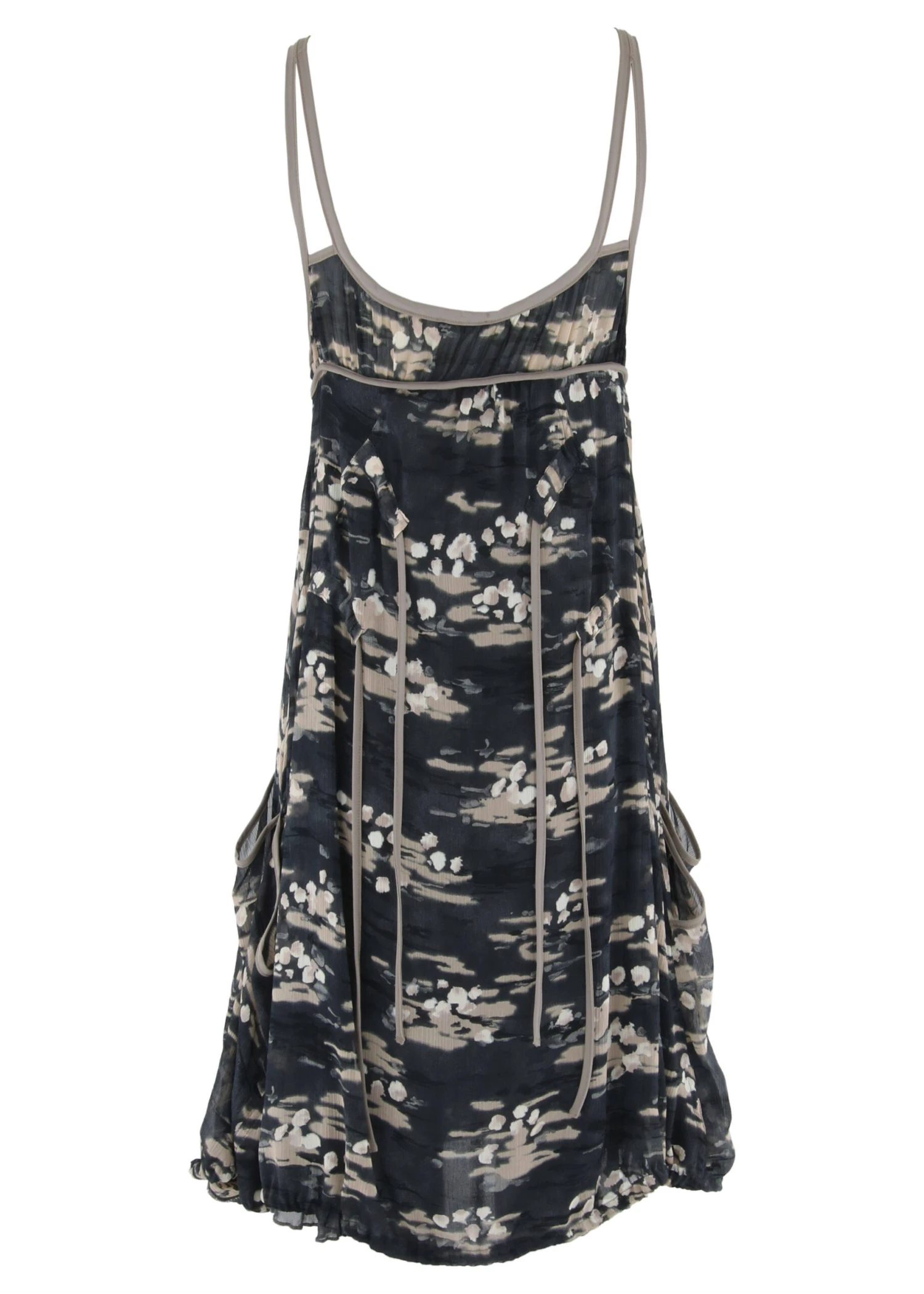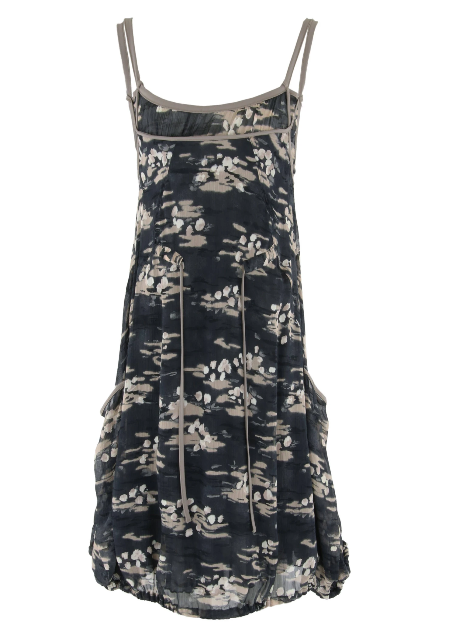 Een jurk van D’Etoiles Cassiopee in een grafische print met meerdere tinten donkergrijs en taupe. De jurk is gevoerd waarvan de onderste laag in een uni grijze stof is. De spaghetti bandjes en de bies langs de ronde halslijn zijn in een lichtgrijze kleur. Net onder de taille zijn steekzakken. Ter hoogte van de taille zijn 2 linten waarmee in de taille een plooi effect kan worden gecreëerd. Deze jurk mag op 30 graden worden gewassen.