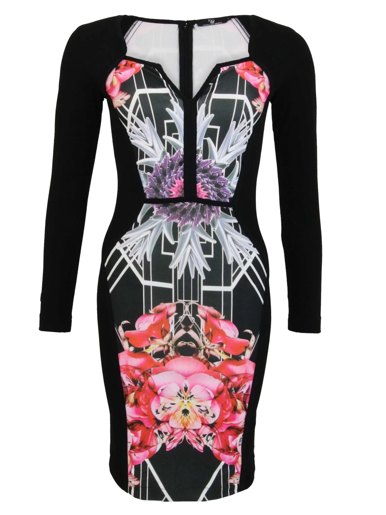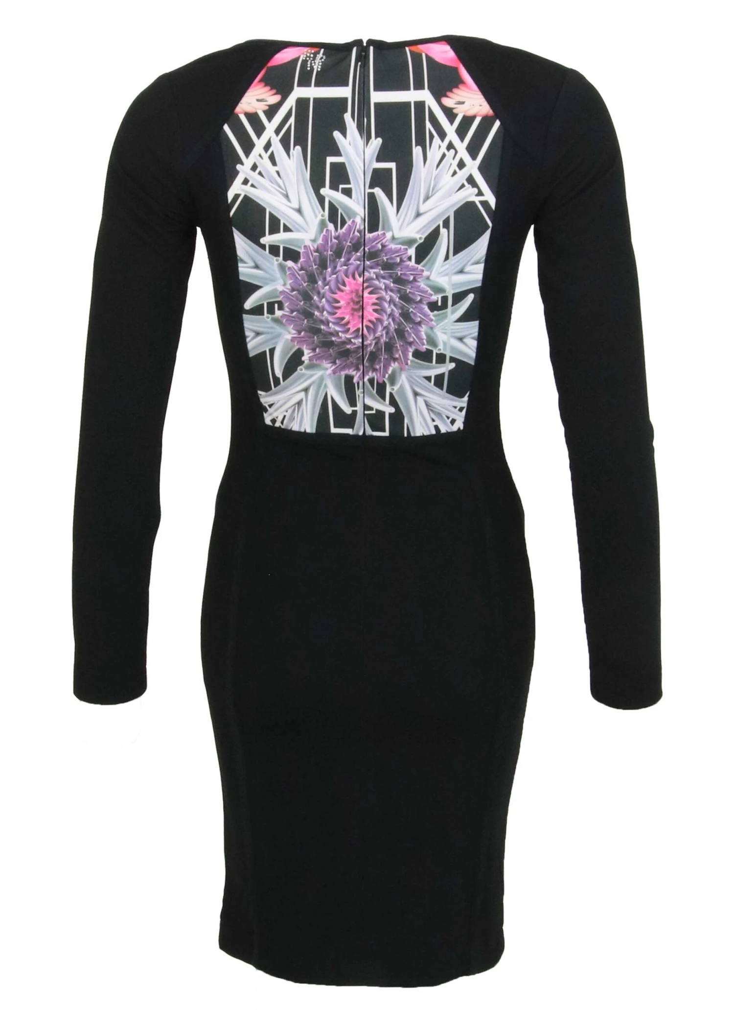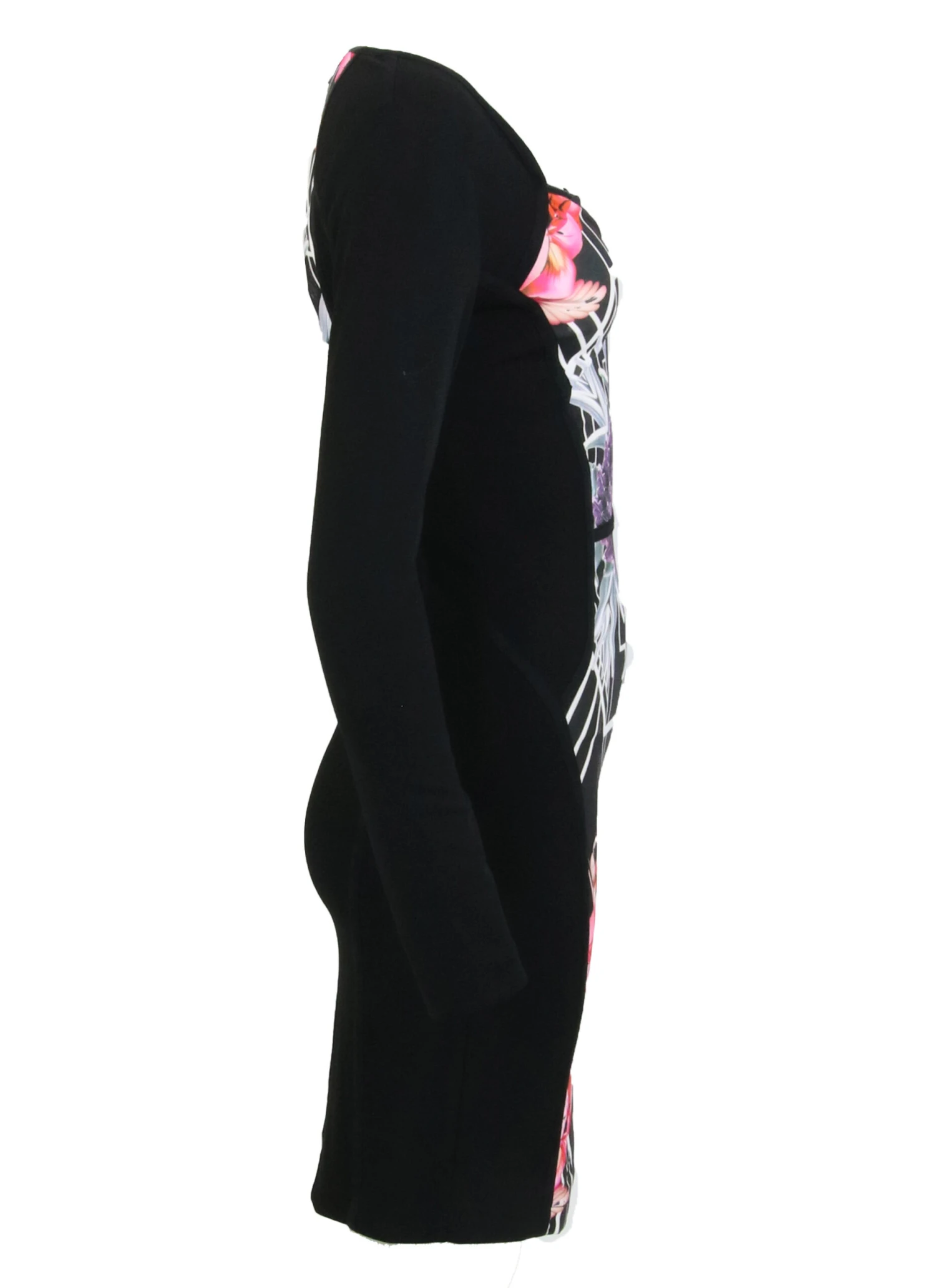 Een jurk van Etoile du monde in een roze bloemenprint op een zwarte achtergrond. De tasille is geaccentueerd door een smalle horizontale bies . De achterzijde van de jurk is in effen zwart. Deze jurk mag koud op de hand worden gewassen.