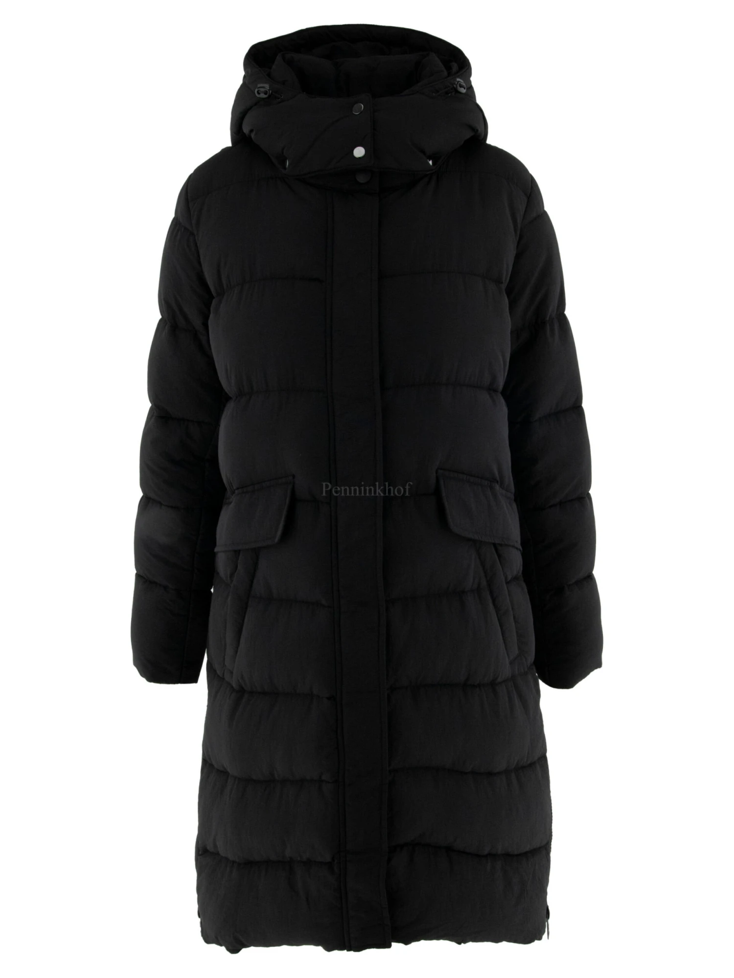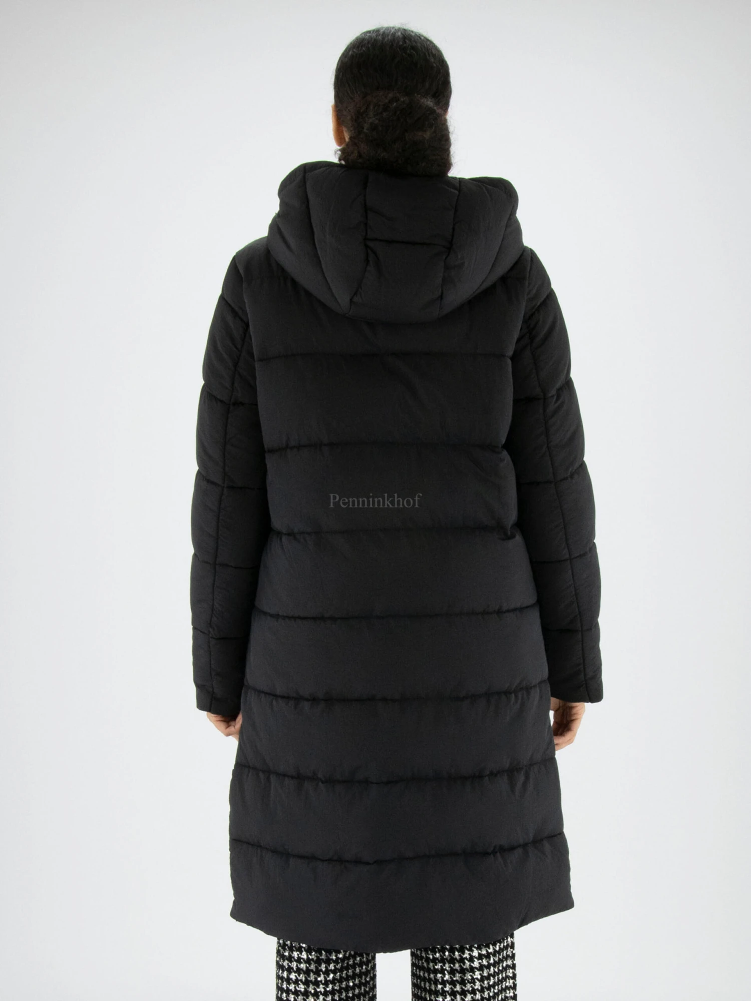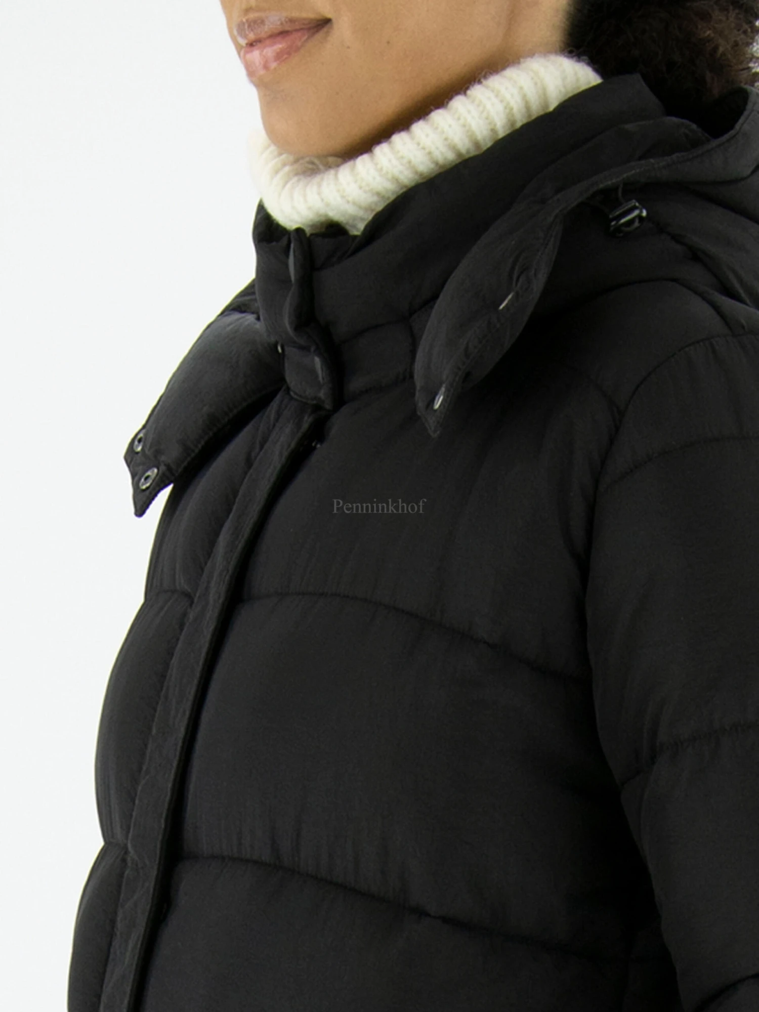 Een gestepte coat van Fuchs Schmitt in de kleur zwart. De coat heeft een afknoopbare capuchon en mag op 30 graden worden gewassen.