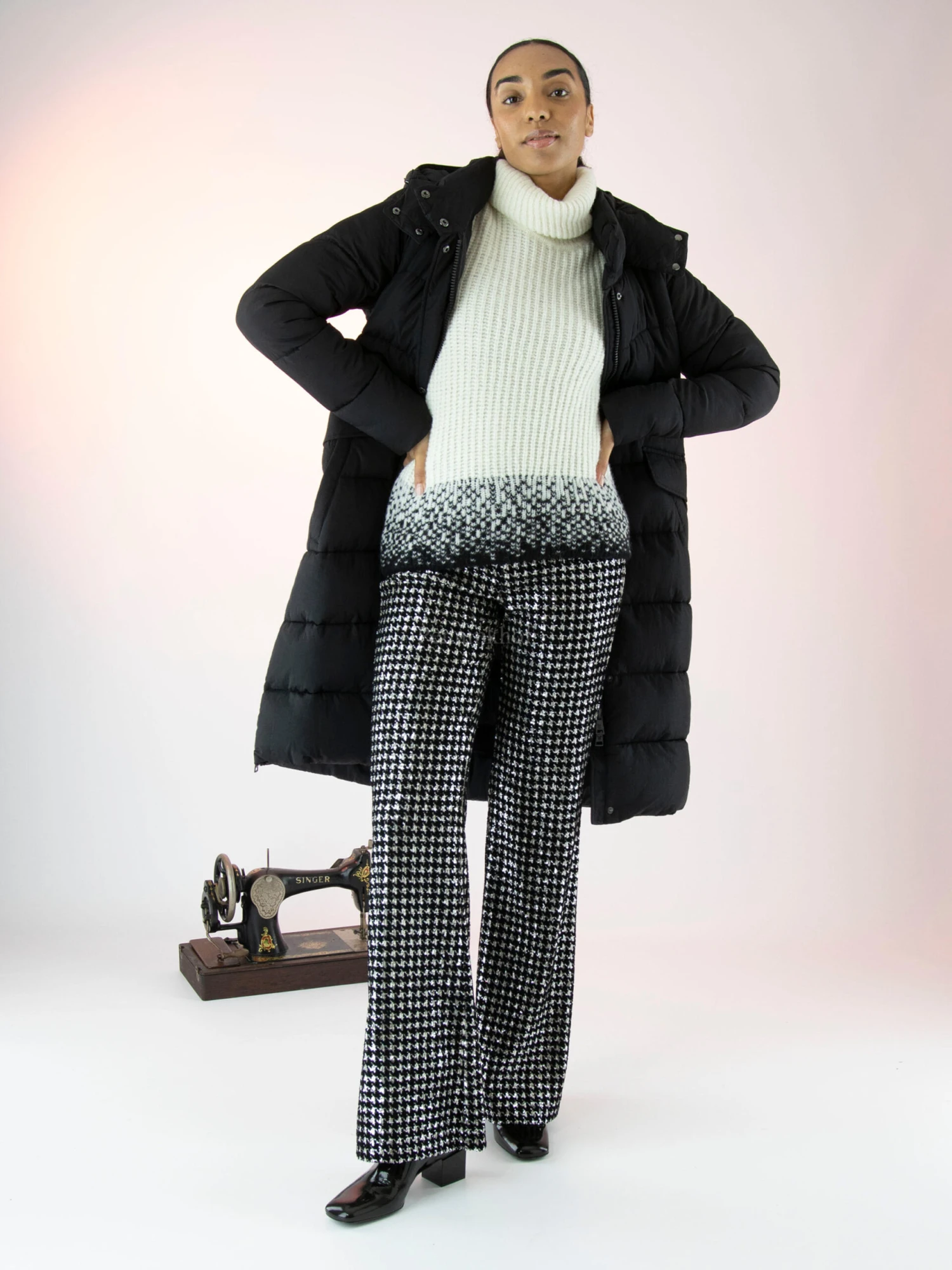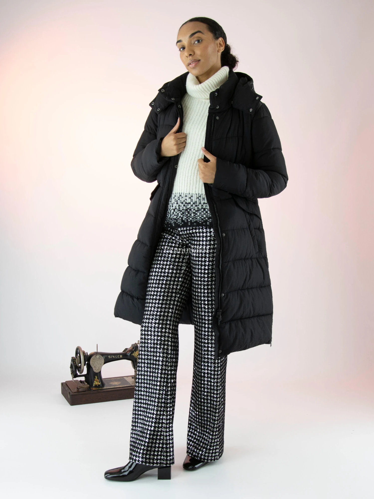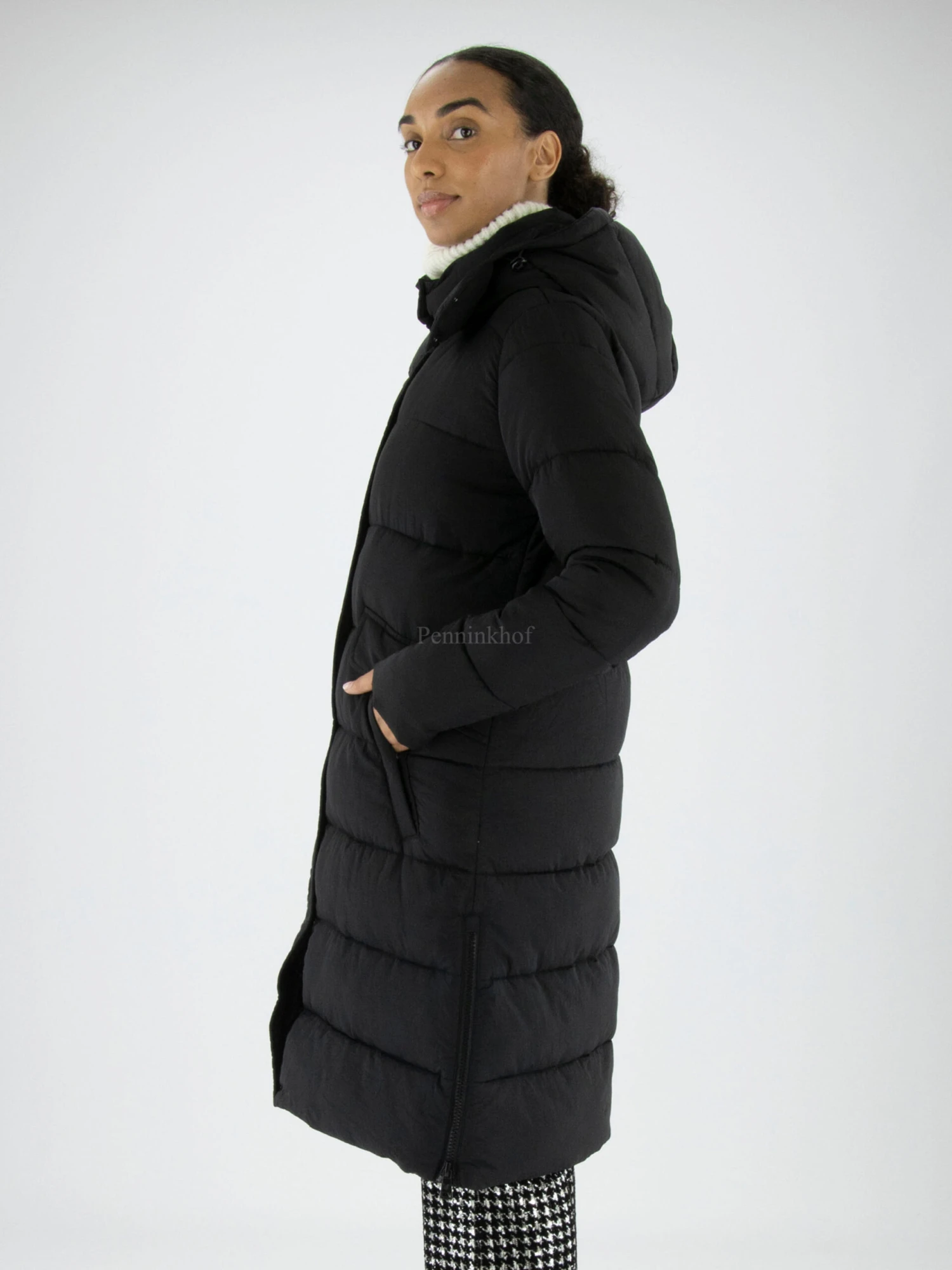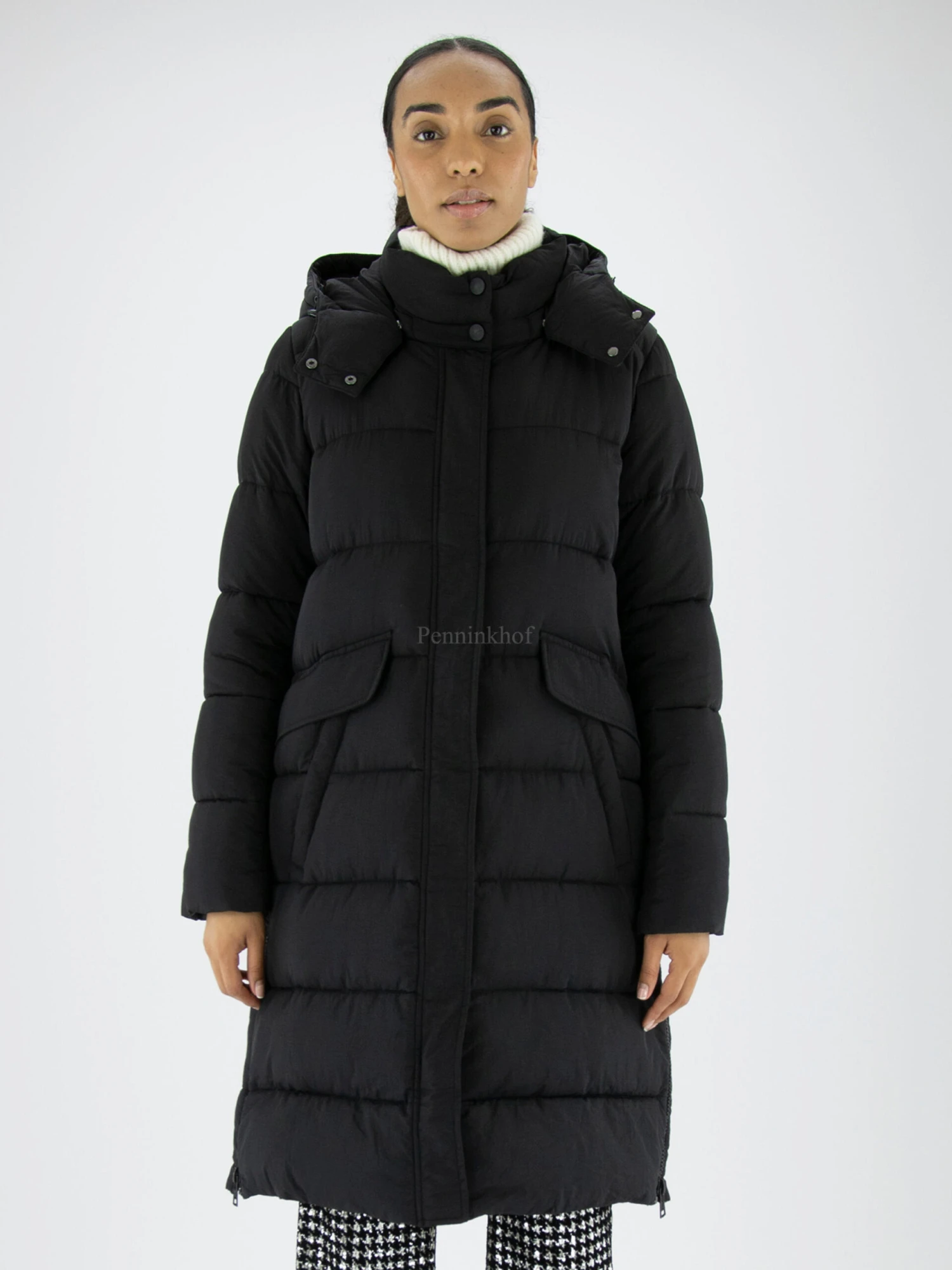 Een gestepte coat van Fuchs Schmitt in de kleur zwart. De coat heeft een afknoopbare capuchon en mag op 30 graden worden gewassen.