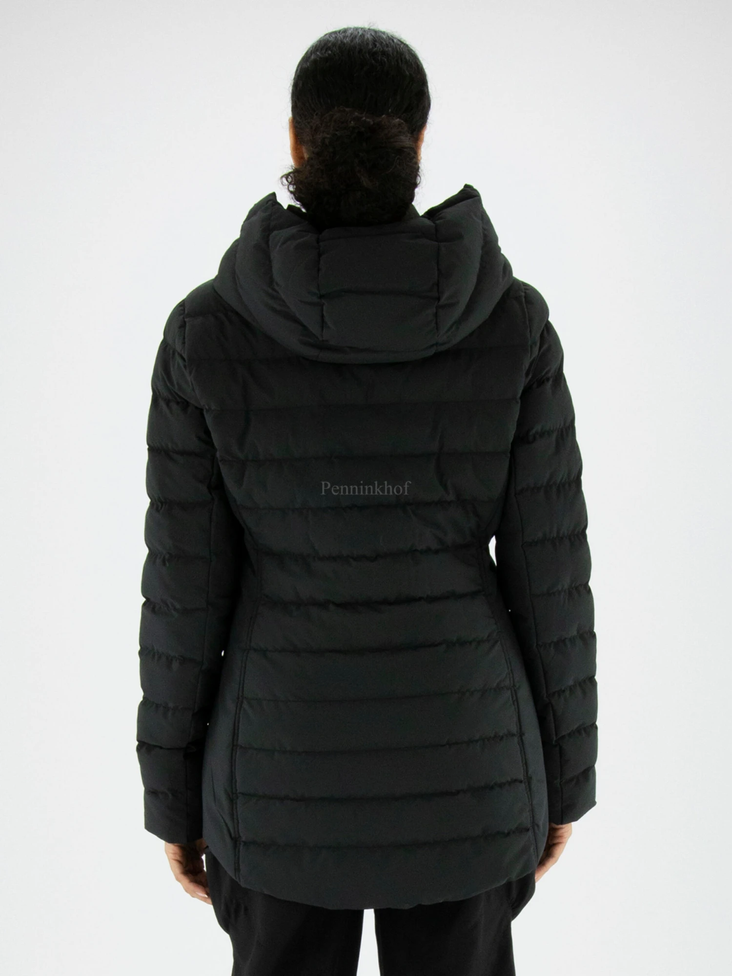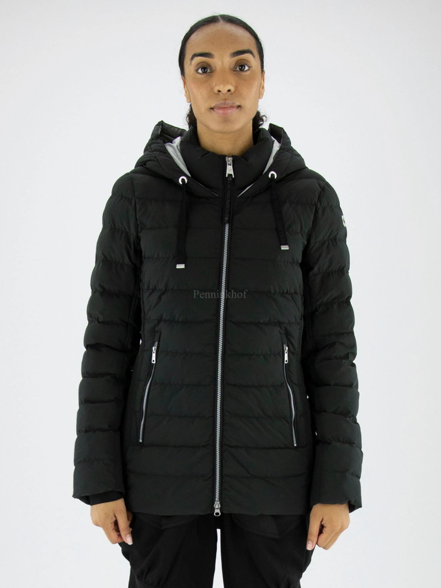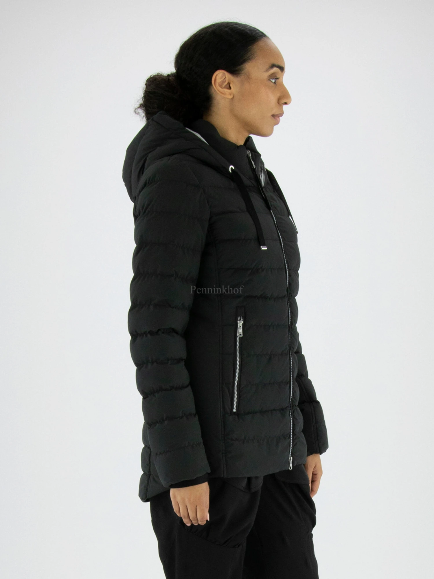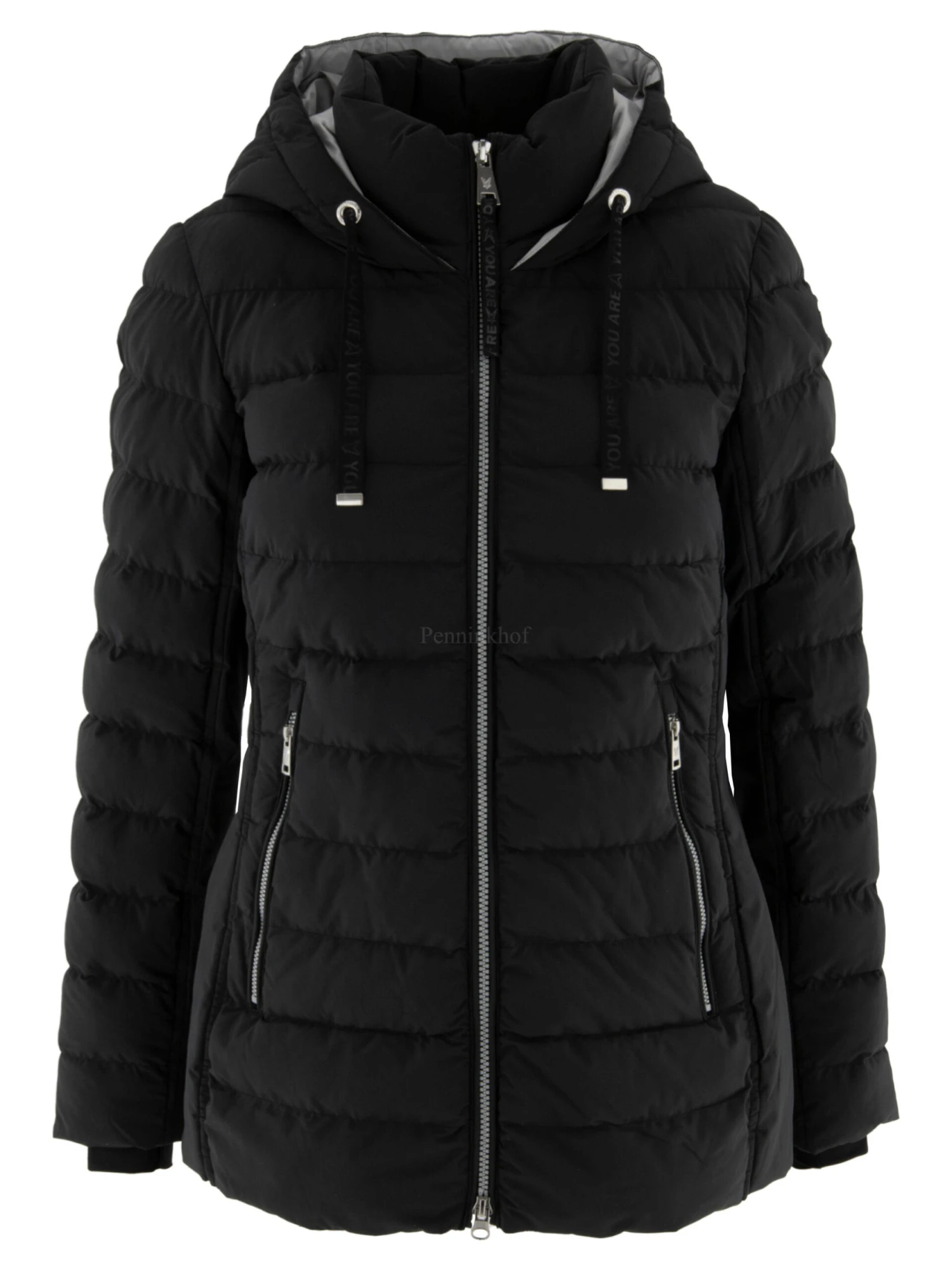 Een gestepte coat van Fuchs Schmitt in de kleur zwart. In de rand van de capuchon is een koord om de capuchon aan te trekken. Aan het uiteinde van de mouwen zijn zwarte manchetten. Deze coat mag op 30 graden worden gewassen.