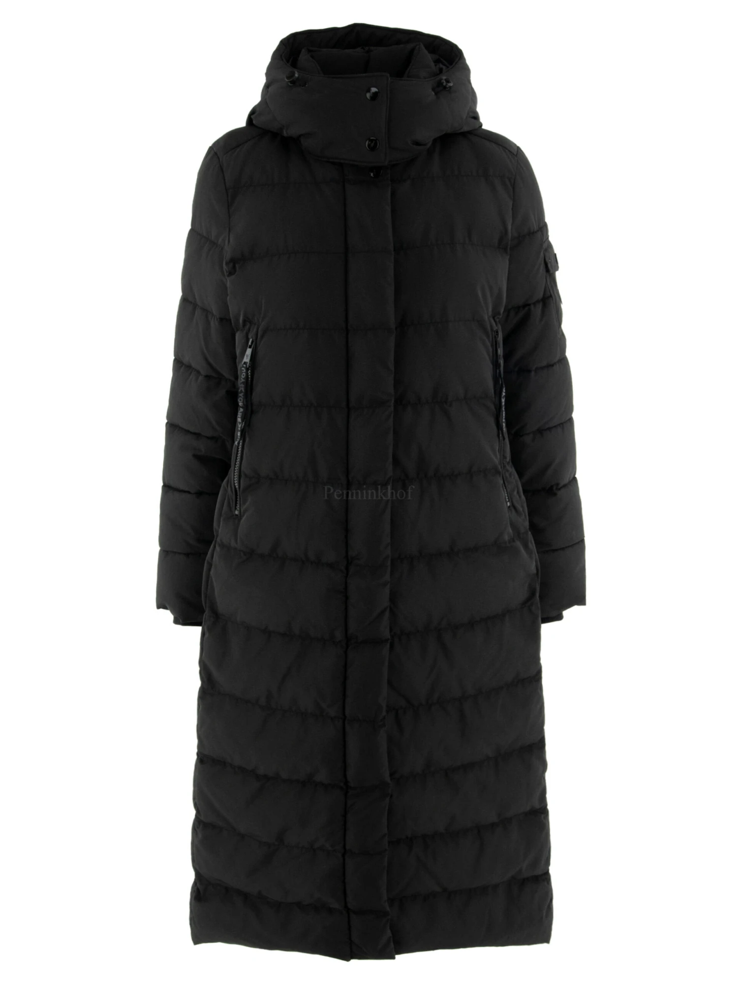 Een lange gestepte coat van Fuchs schmitt in de kleur zwart. De coat heeft een afneembare capuchon en een ritsluiting met extra drukknopen. Deze coat mag op 30 graden worden gewassen.