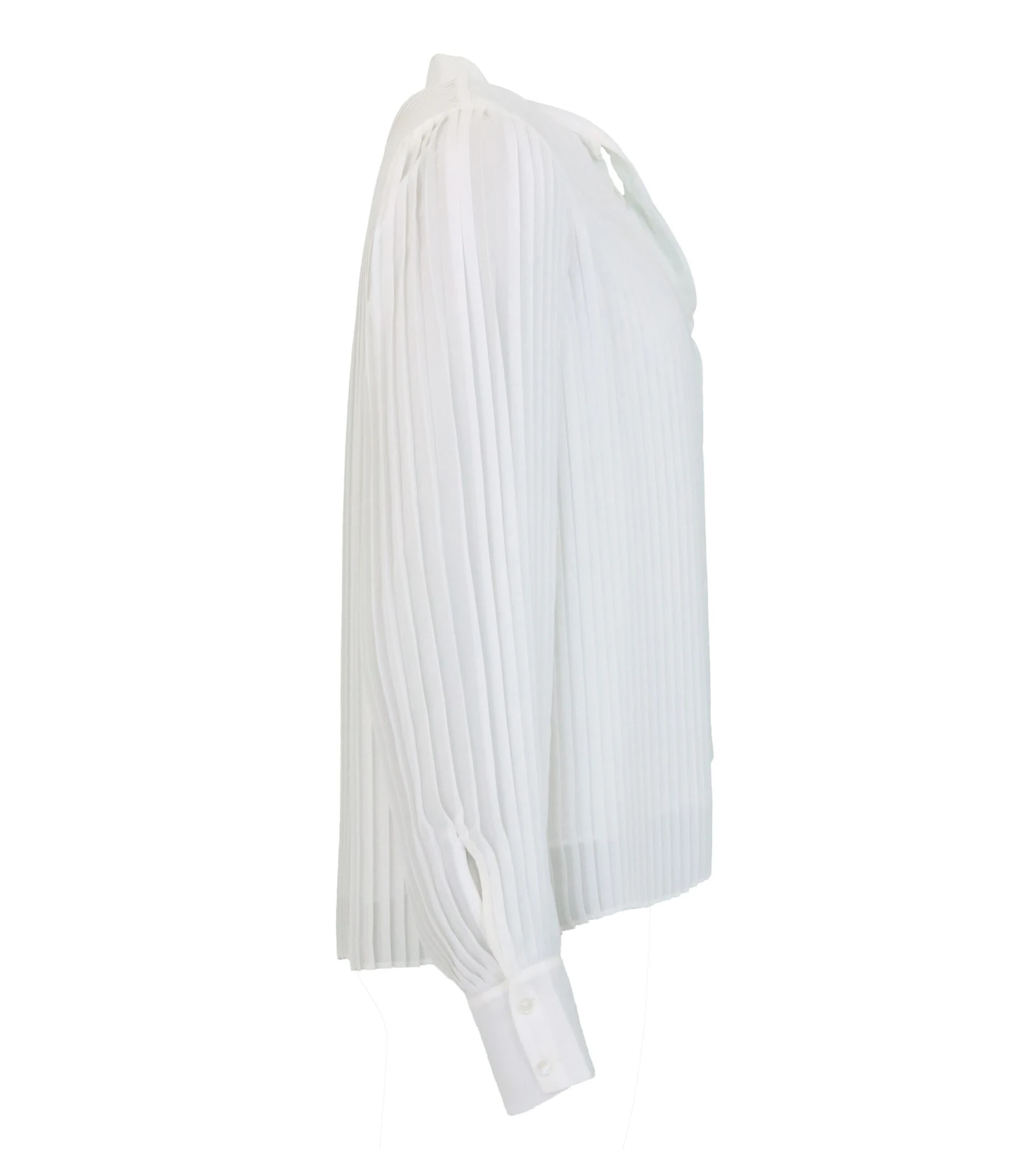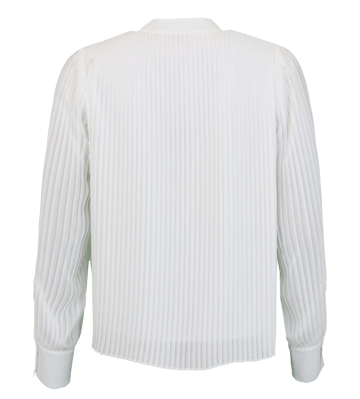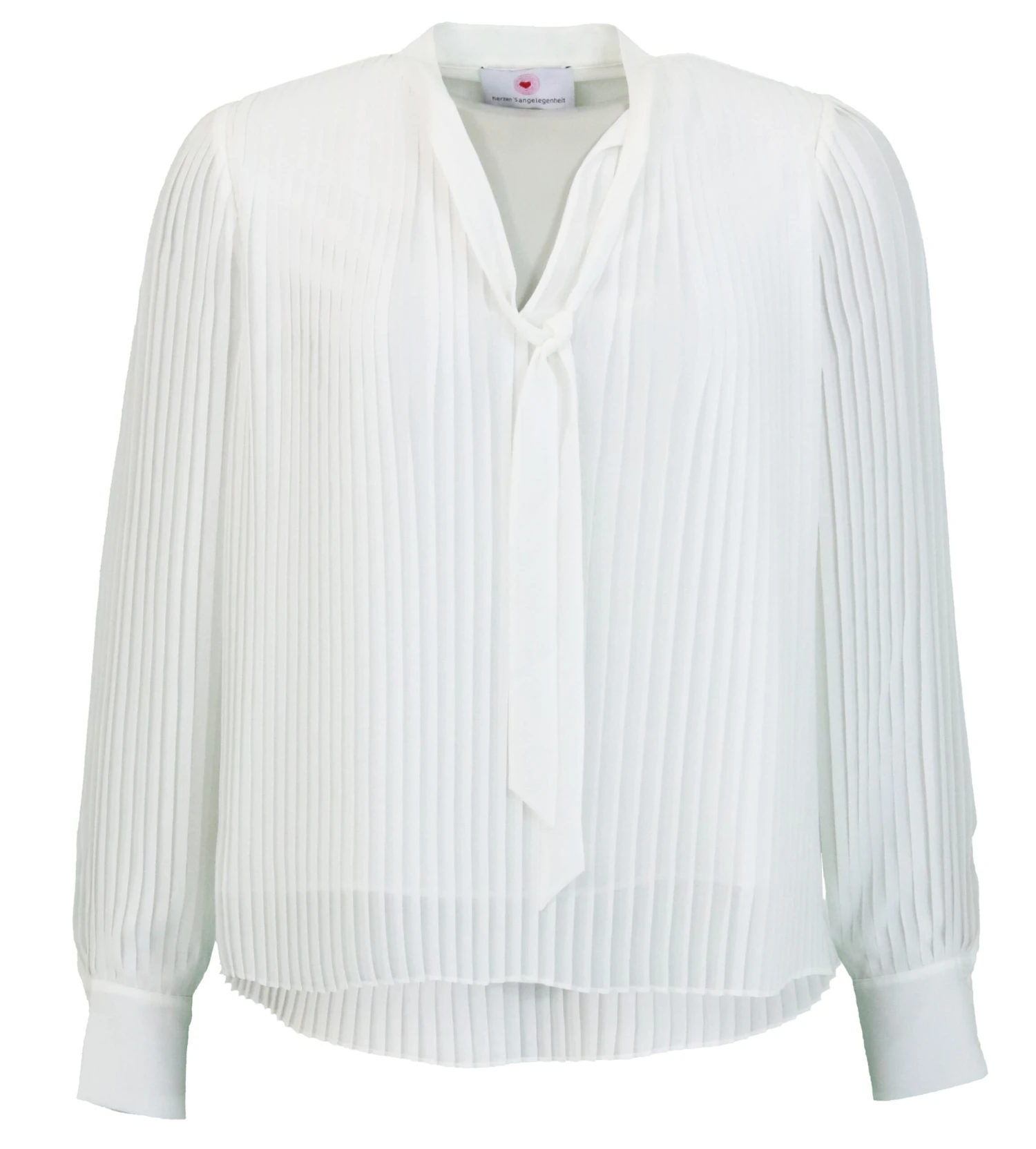 Een blouse van Herzen’s Angelegenheit in de kleur roomwit. De blouse is geheel in een verticale plissé stof. Vanuit de kraag zijn 2 linten. de blouse heeft een V – Hals en is gevoerd. deze blouse mag op de hand worden gewassen.