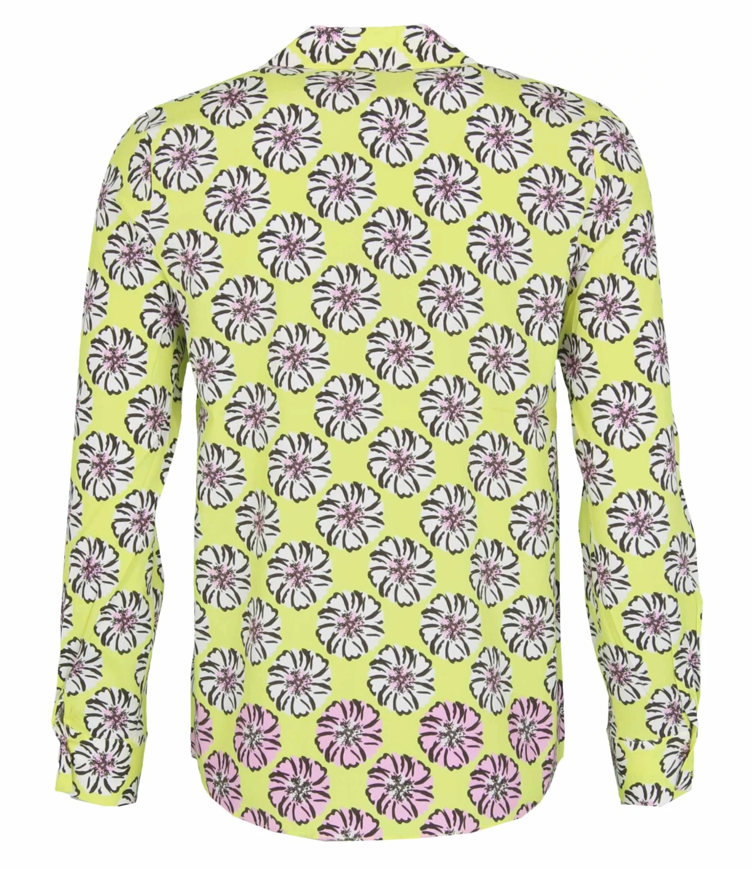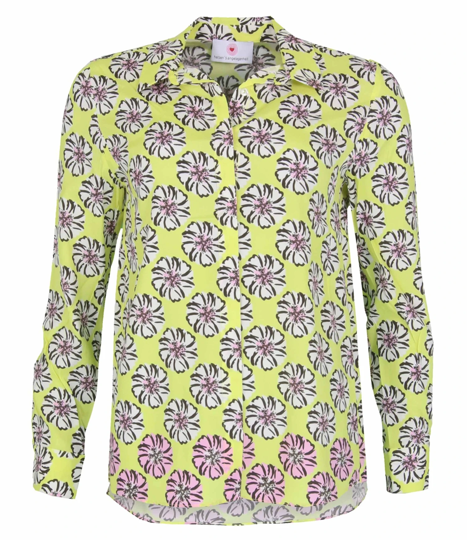 Een blouse van Herzen’s in een print van zwart witte bloemen met een roze kern op een pastel gele achtergrond. Deze blouse mag op de hand worden gewassen.