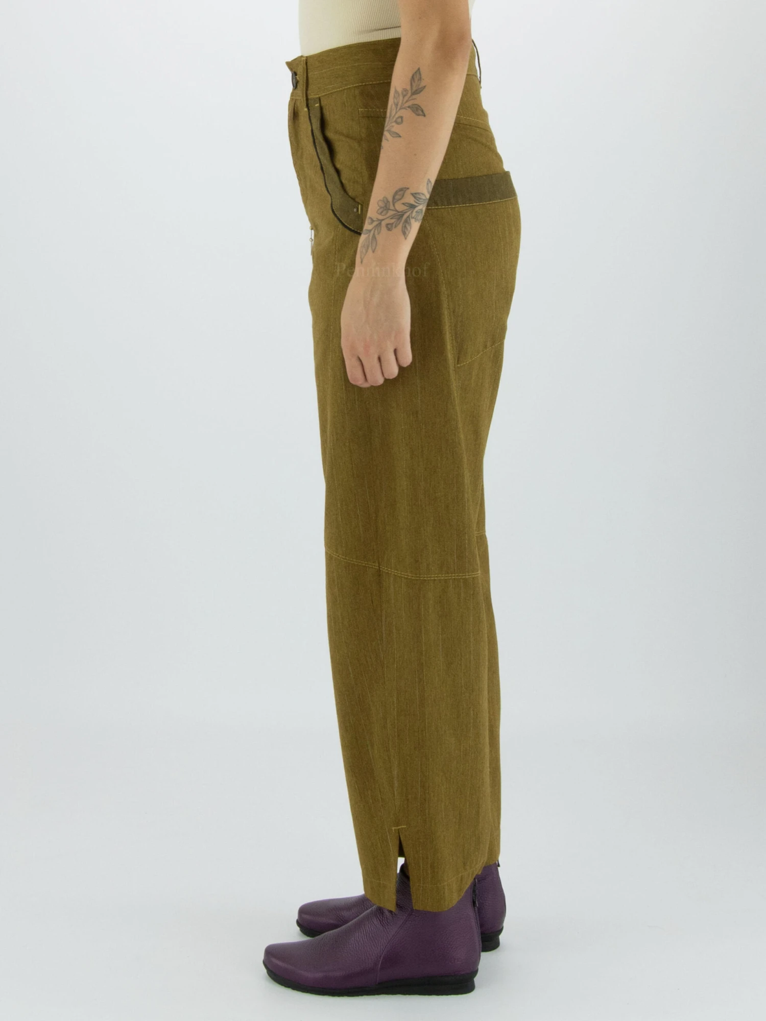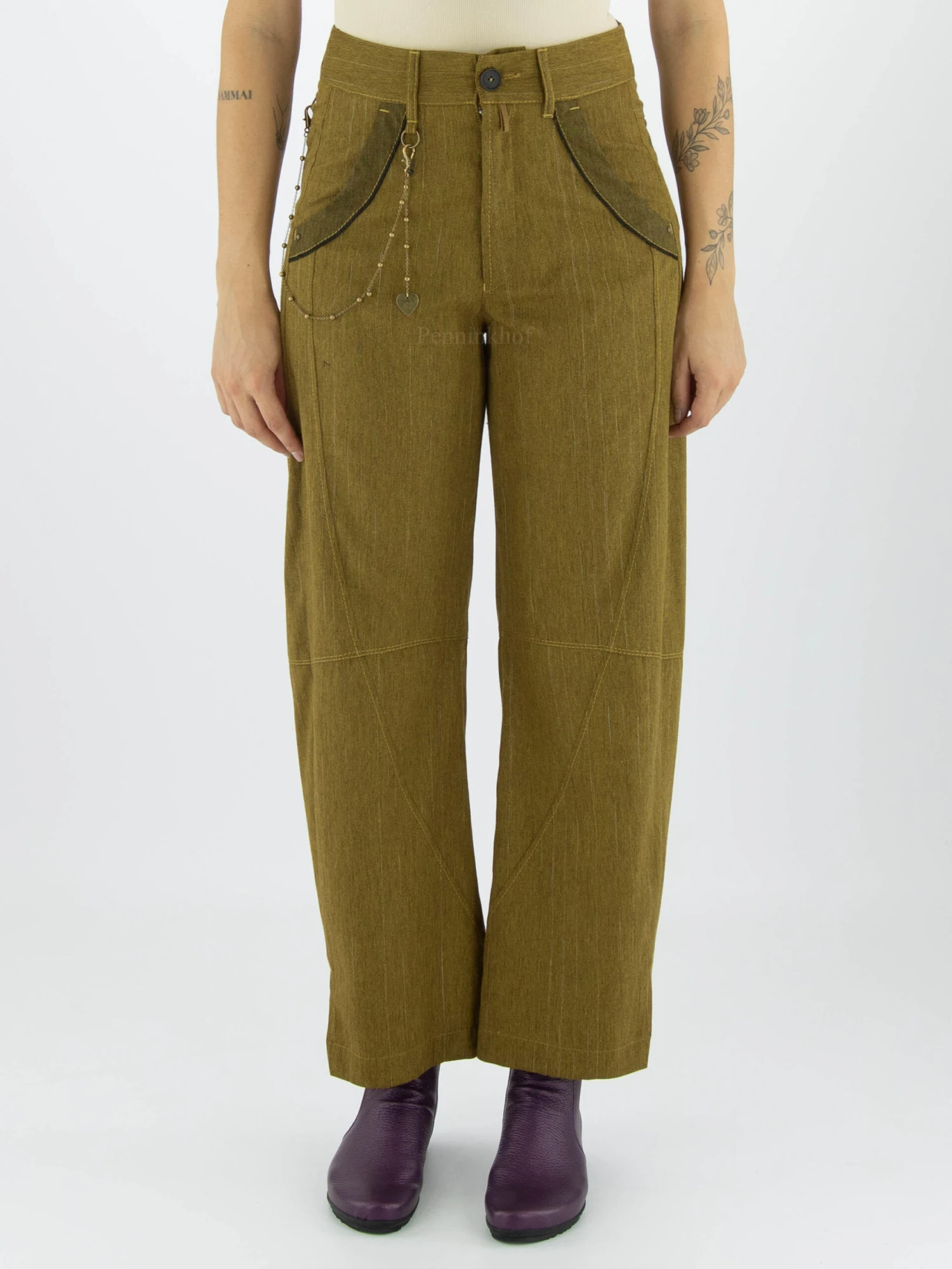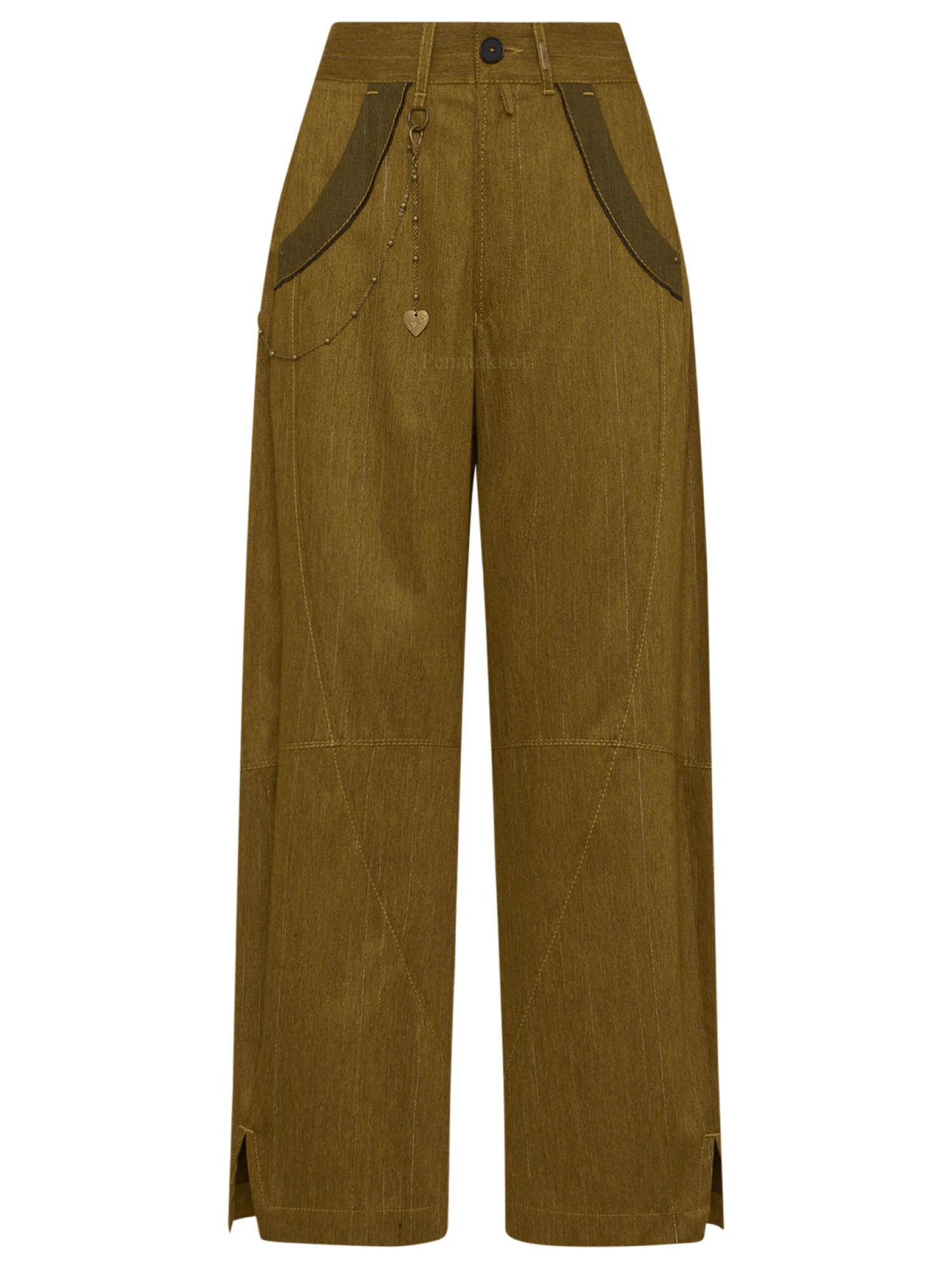 Een broek van High in een krijtstreep met de kleuren pistachegroen en platina. Langs de rand van de steekzakken is een rondlopende roomwitte bies. De broek heeft enkele diagonale stiknaden en aan de onderkant van de rechtgesneden pijpen is een split. Vanaf de lus van de ceintuur is aan de rechterkant een smalle ketting die naar de achterkant loopt. Deze broek mag niet worden gewassen.