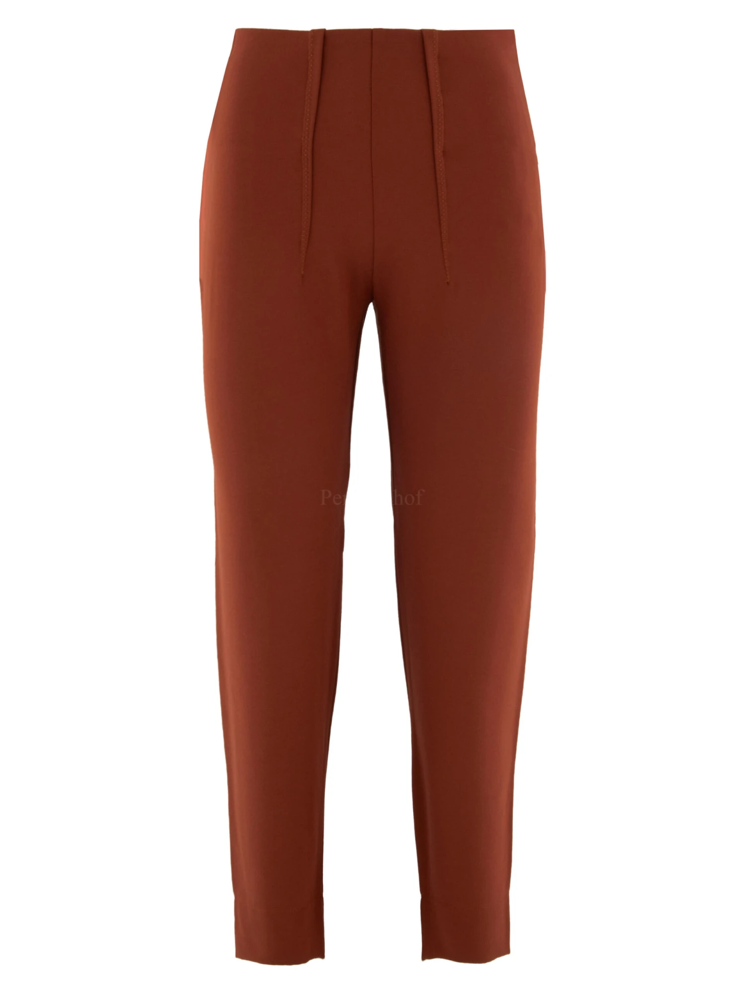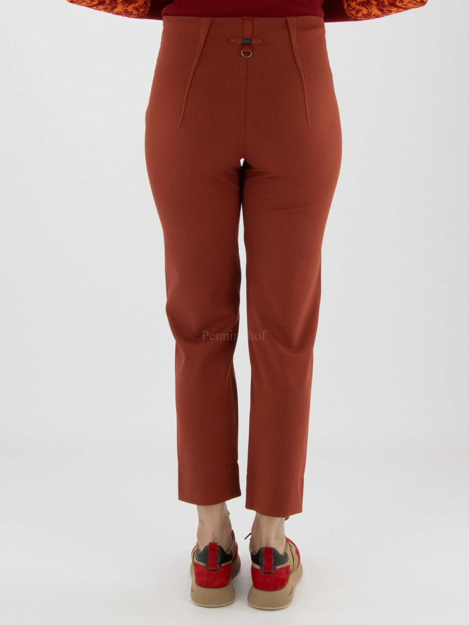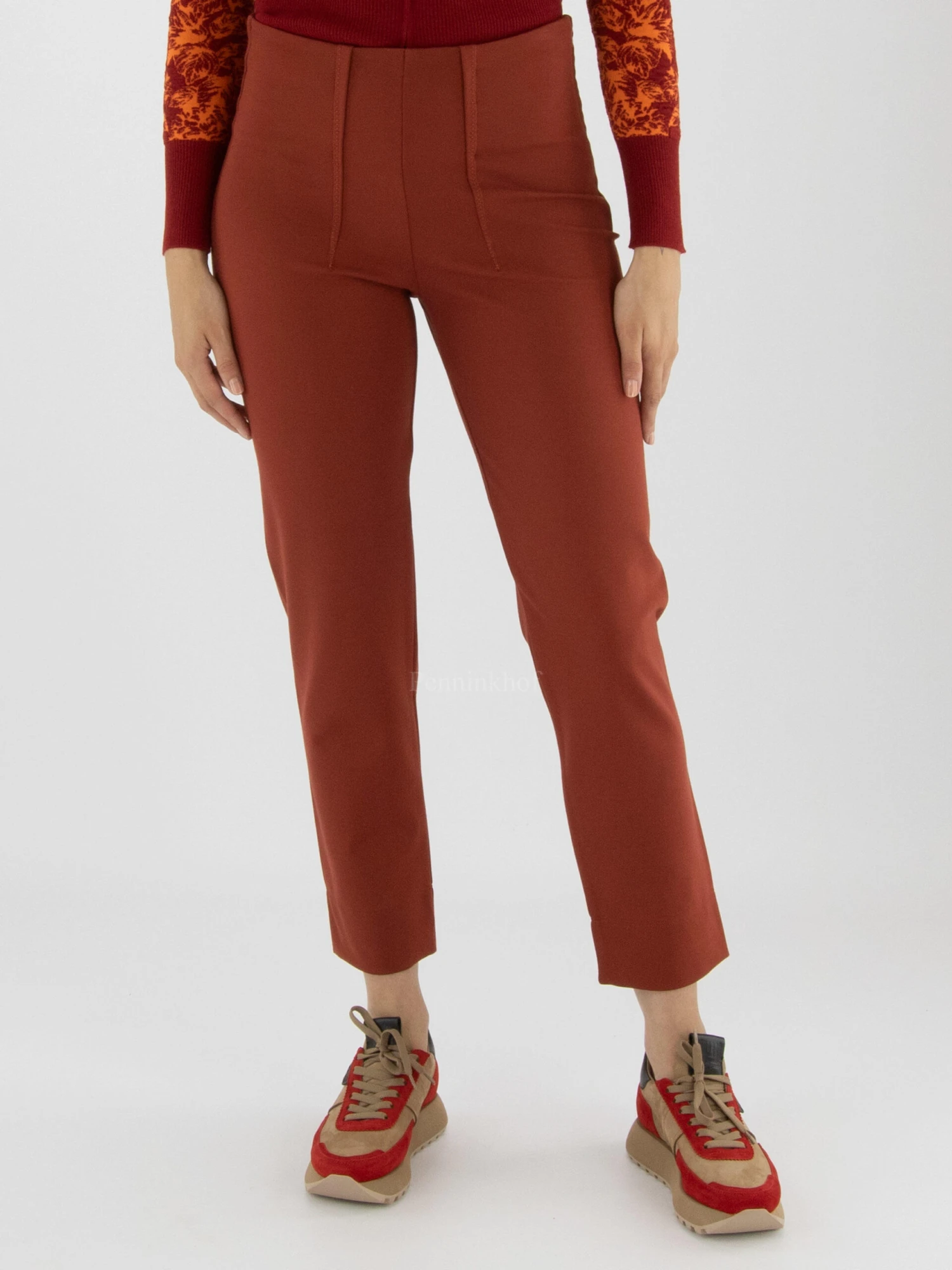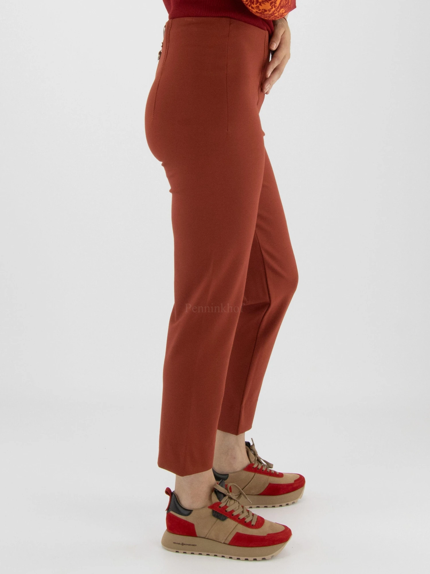 Een broek van High in de kleur roest. Aan de voor en achterkant is aan beide zijkanten van het midden een decoratieve “ton sur ton” stiknaad tot de heup. Aan de onderkant van de pijpen is een fake boord geaccentueerd door een stiknaad. Deze broek mag op de hand worden gewassen.
