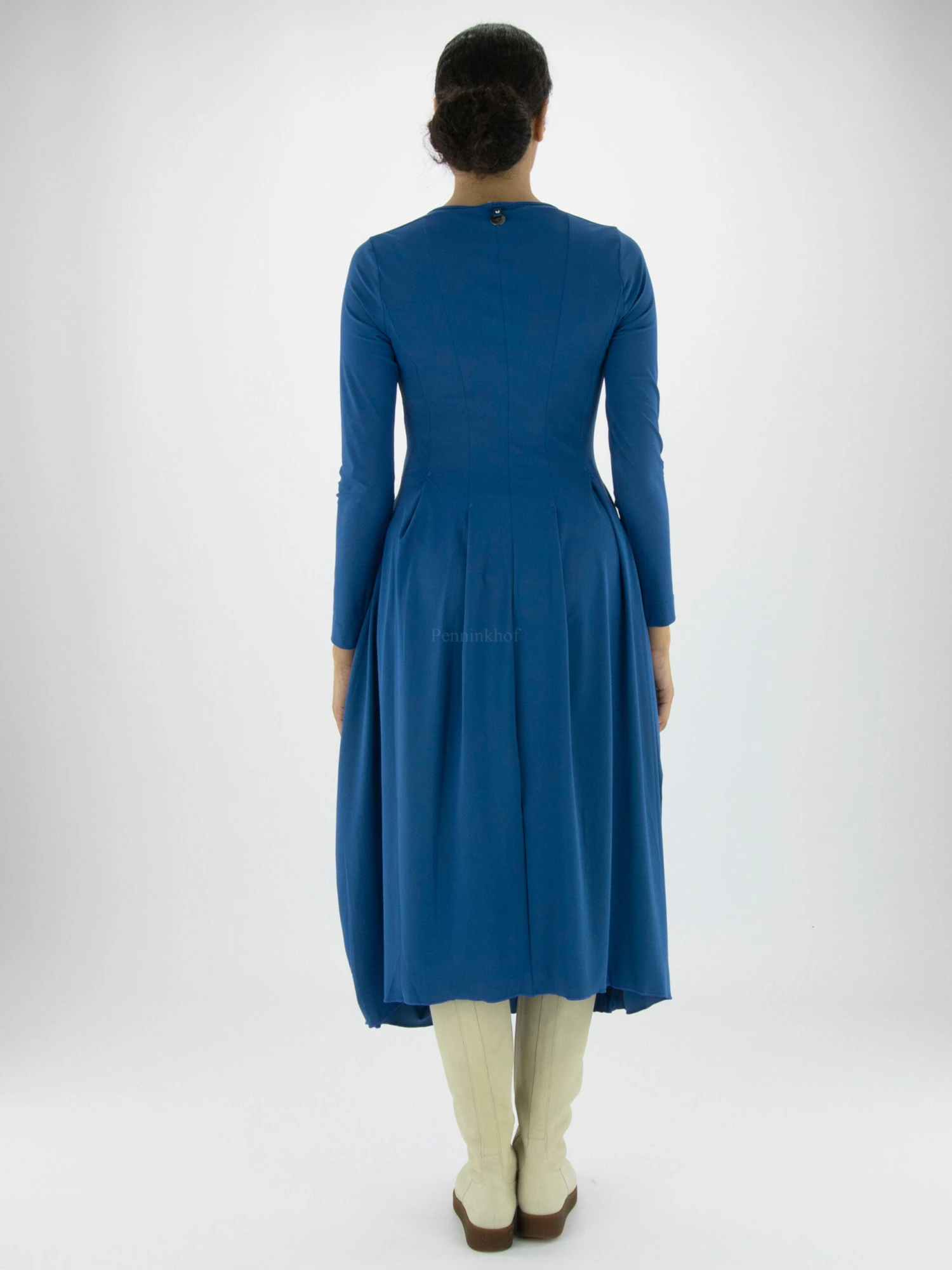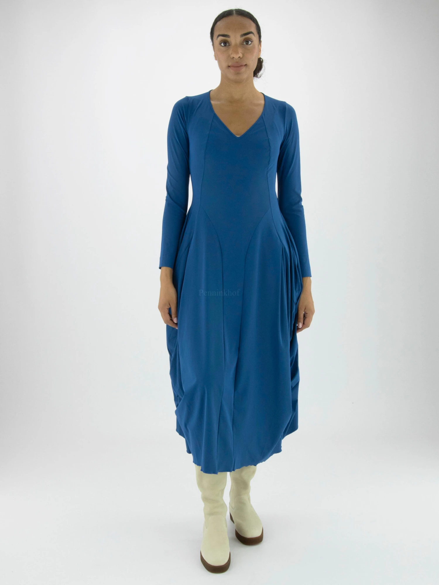 Een jurk van High in de kleur blauw met lange mouwen. De jurk heeft een V – Hals en vanuit de taille heeft de jurk een ballon vorm. Ter hoogte van de taille zijn steekzakken. Deze jurk mag op 30 graden worden gewassen.