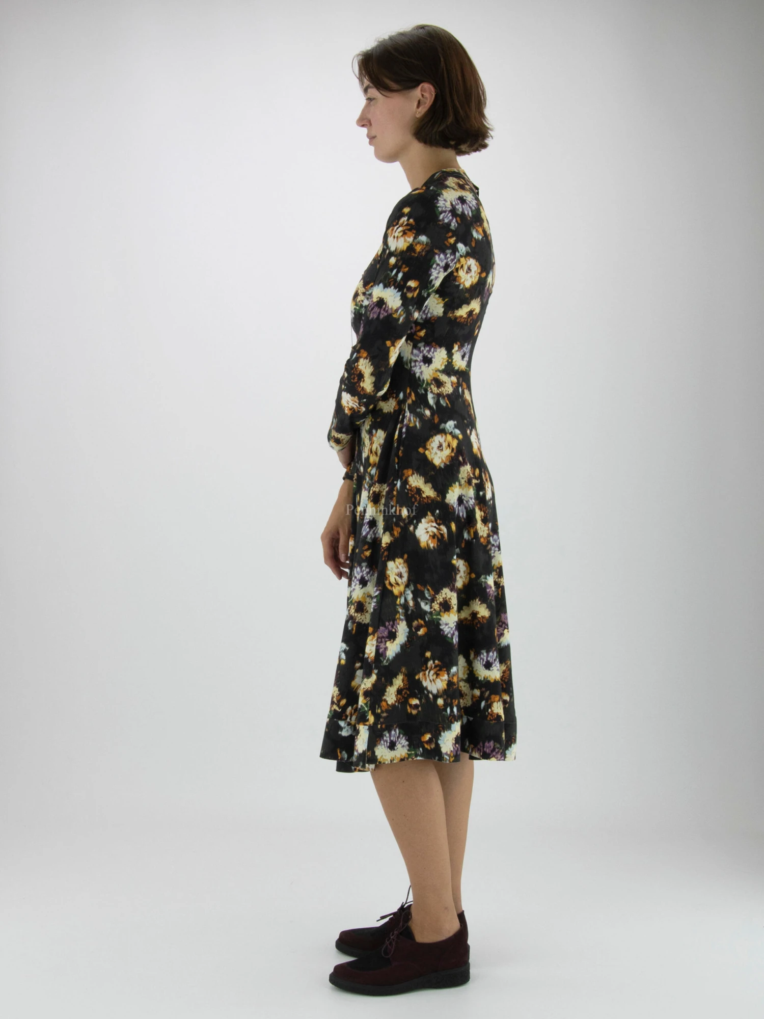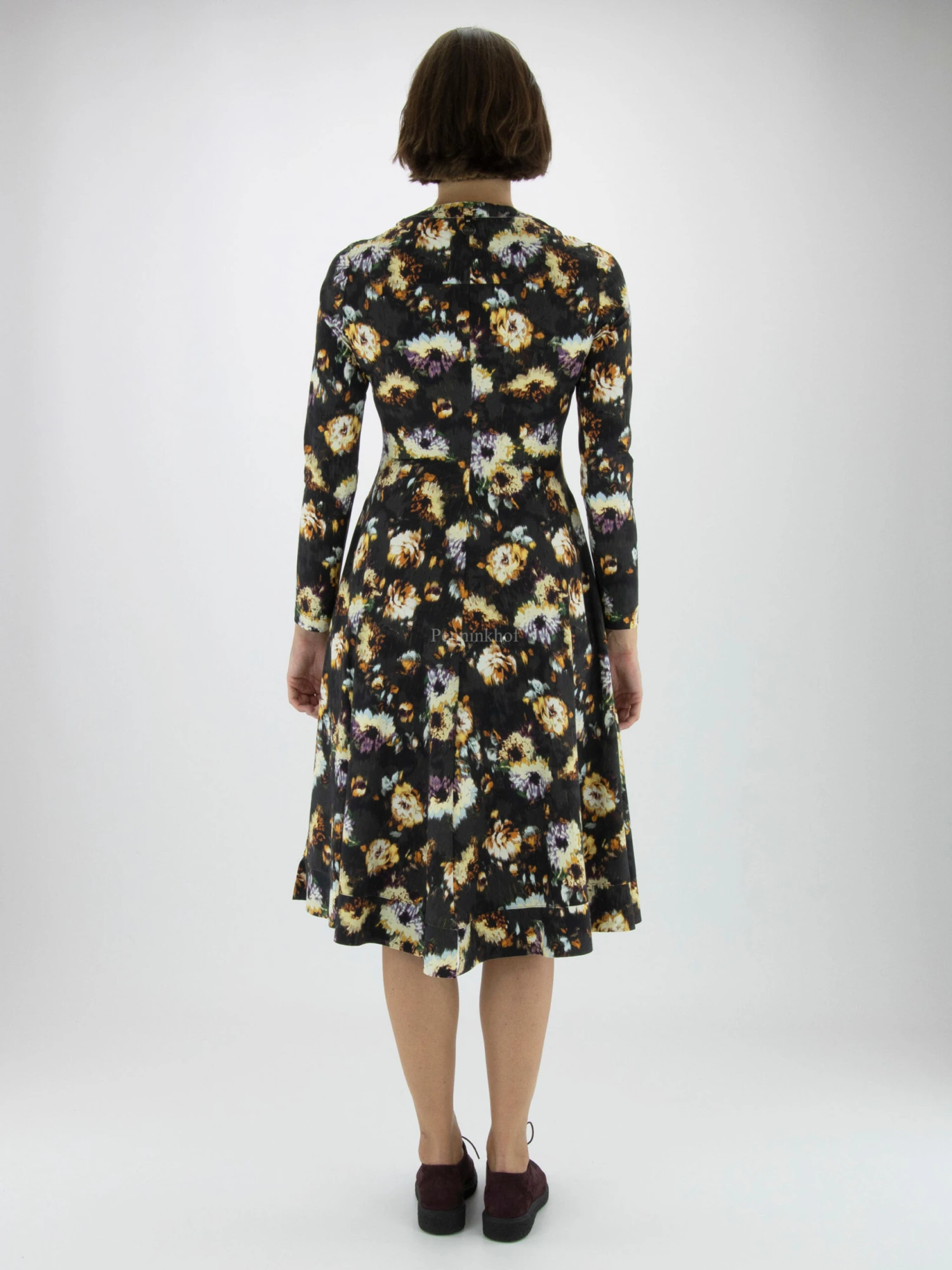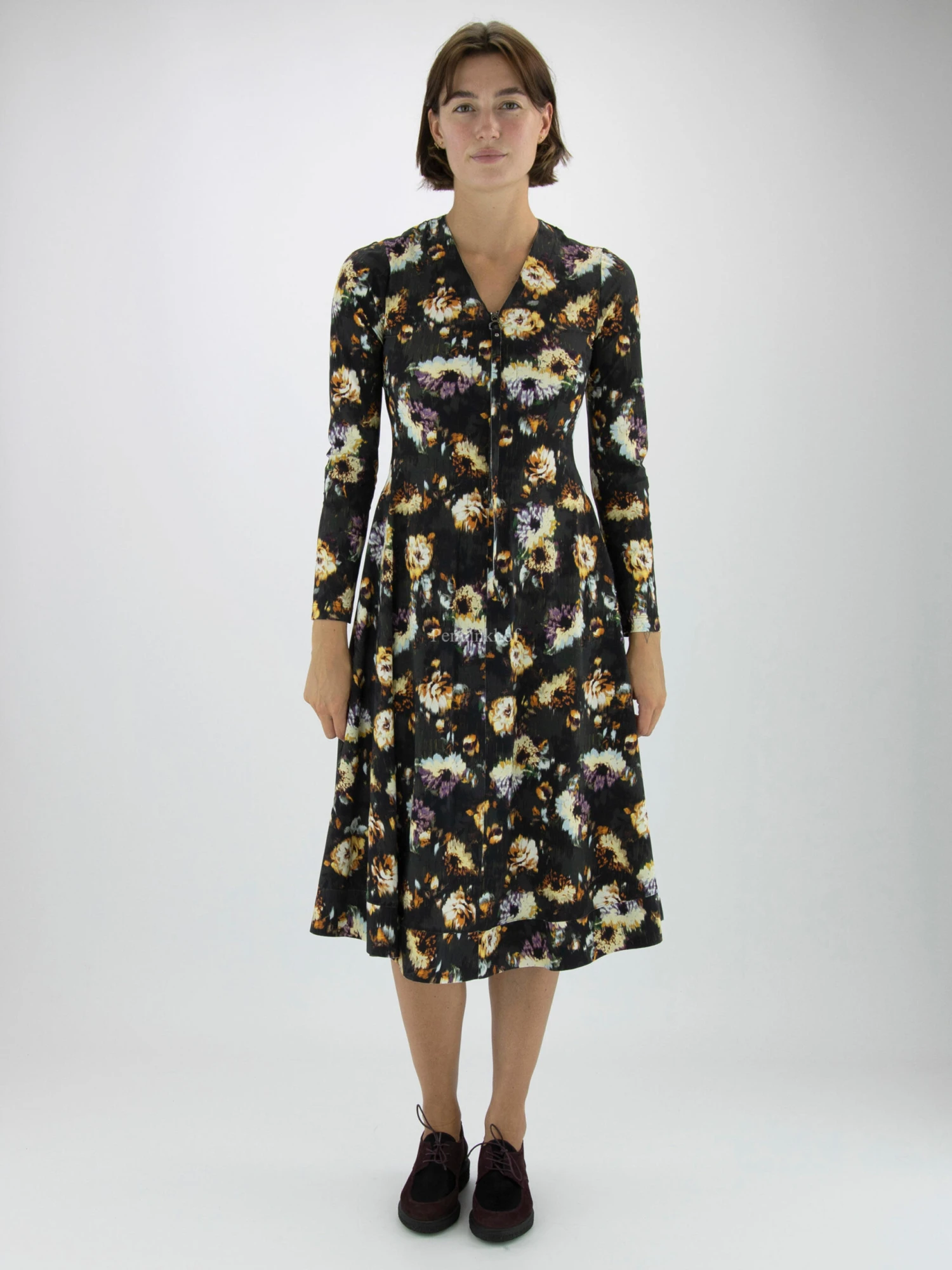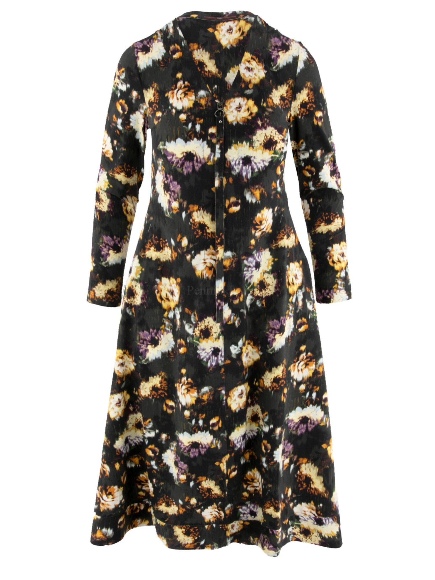 Een jurk van High in een grafische bloemenprint met de kleuren roomwit, paars, okergeel en khaki op een donkere mokka khaki kleur. Vanuit de V – Hals is een rits tot aan de taille. Vanuit de taille heeft de jurk een A – Lijn. Deze jurk mag op 30 graden worden gewassen.