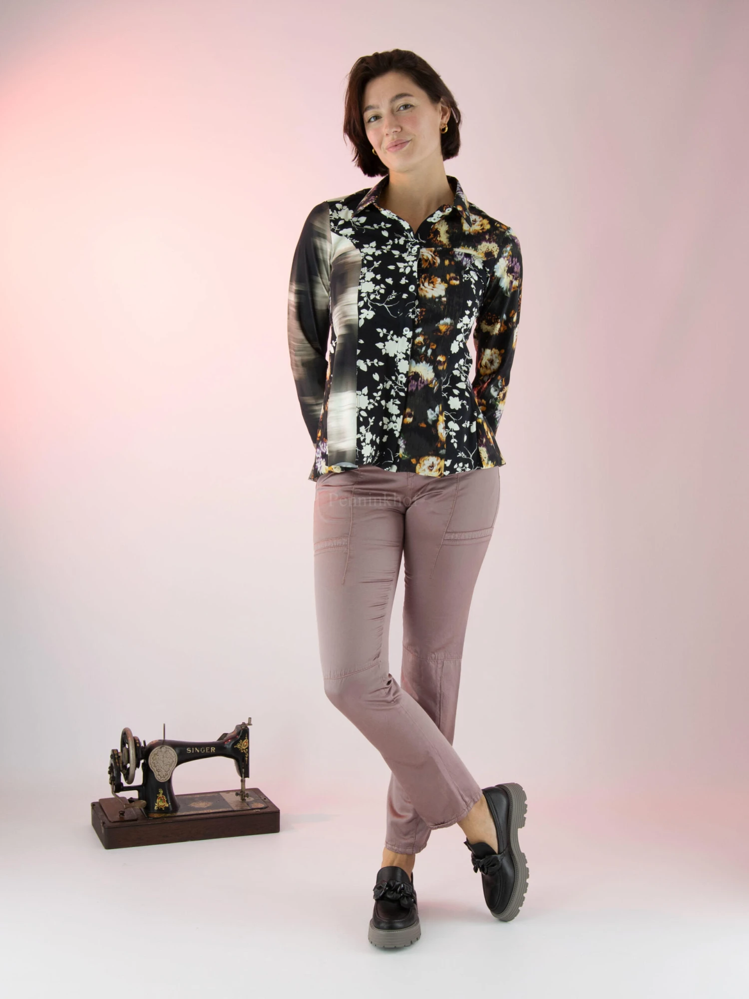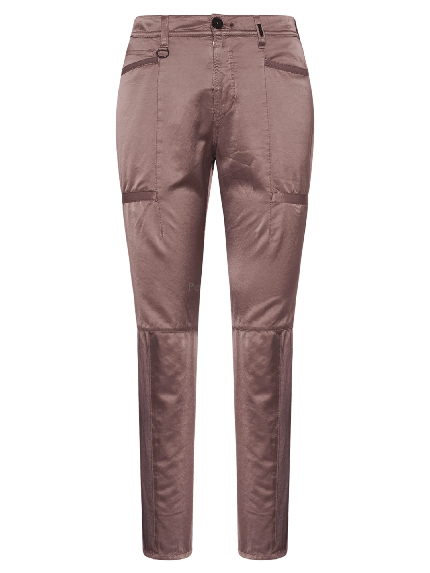 Een mat satijnen broek van High in de kleur lila. De broek heeft meerdere decoratieve stiknaden. Langs de rand van de zakken is een katoenen bies. Deze broek mag op de hand worden gewassen.