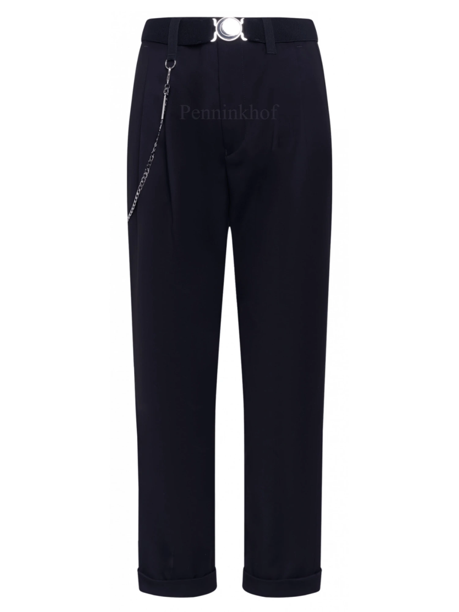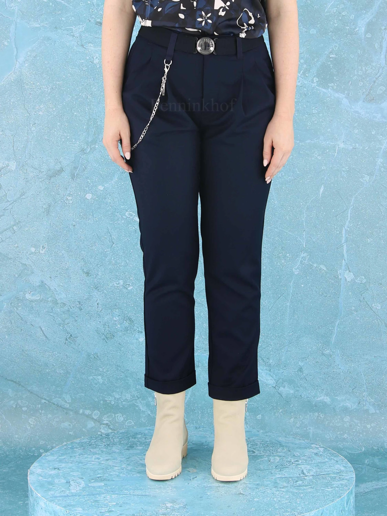 Een broek van High in de kleur marineblauw. In de taille is een elastieken ceintuur met een ronde zilverkleurige gesp. Vanuit de taille zijn aan de voorzijde enkele bandplooien. Aan de onderkant van de pijpen is een korte omslag. Vanuit de rechter ceintuurlus is een zilverkleurige ketting die naar de achterkant gaat. De broek heeft steekzakken en mag op 30 graden worden gewassen.