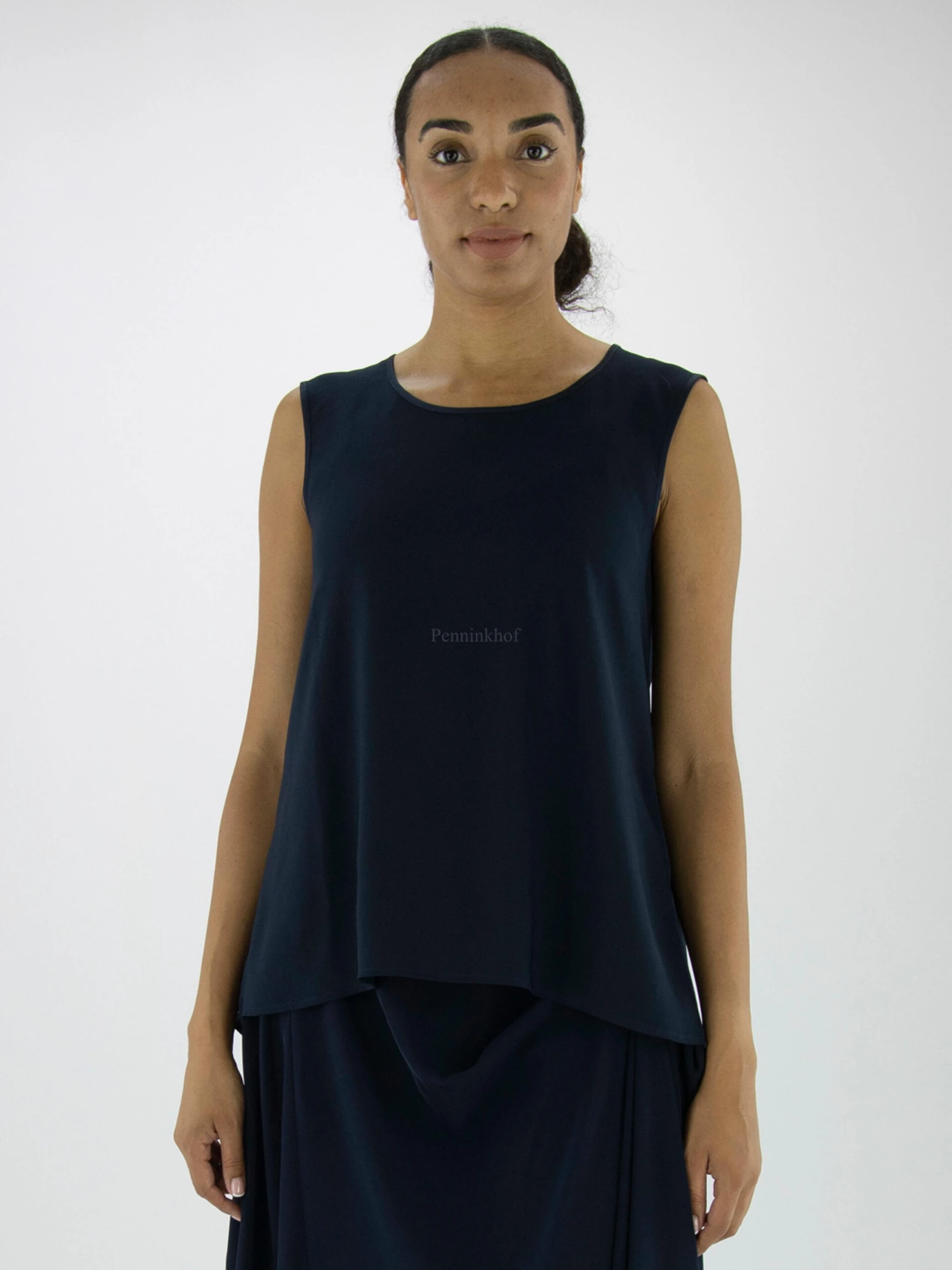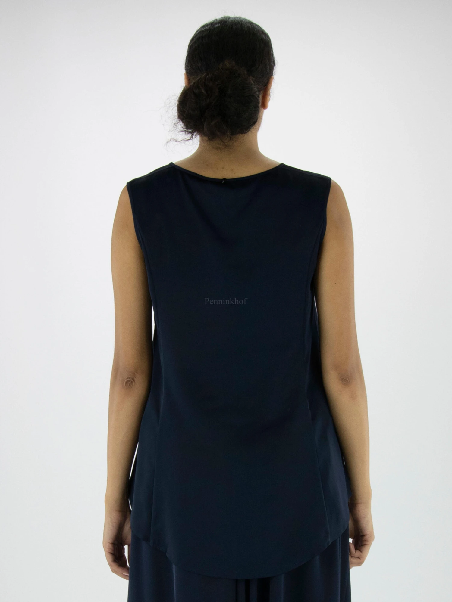 Een top van High in de kleur marineblauw. De top heeft een ronde hals en heeft een lichte A – Lijn. Deze top mag op de hand worden gewassen.
