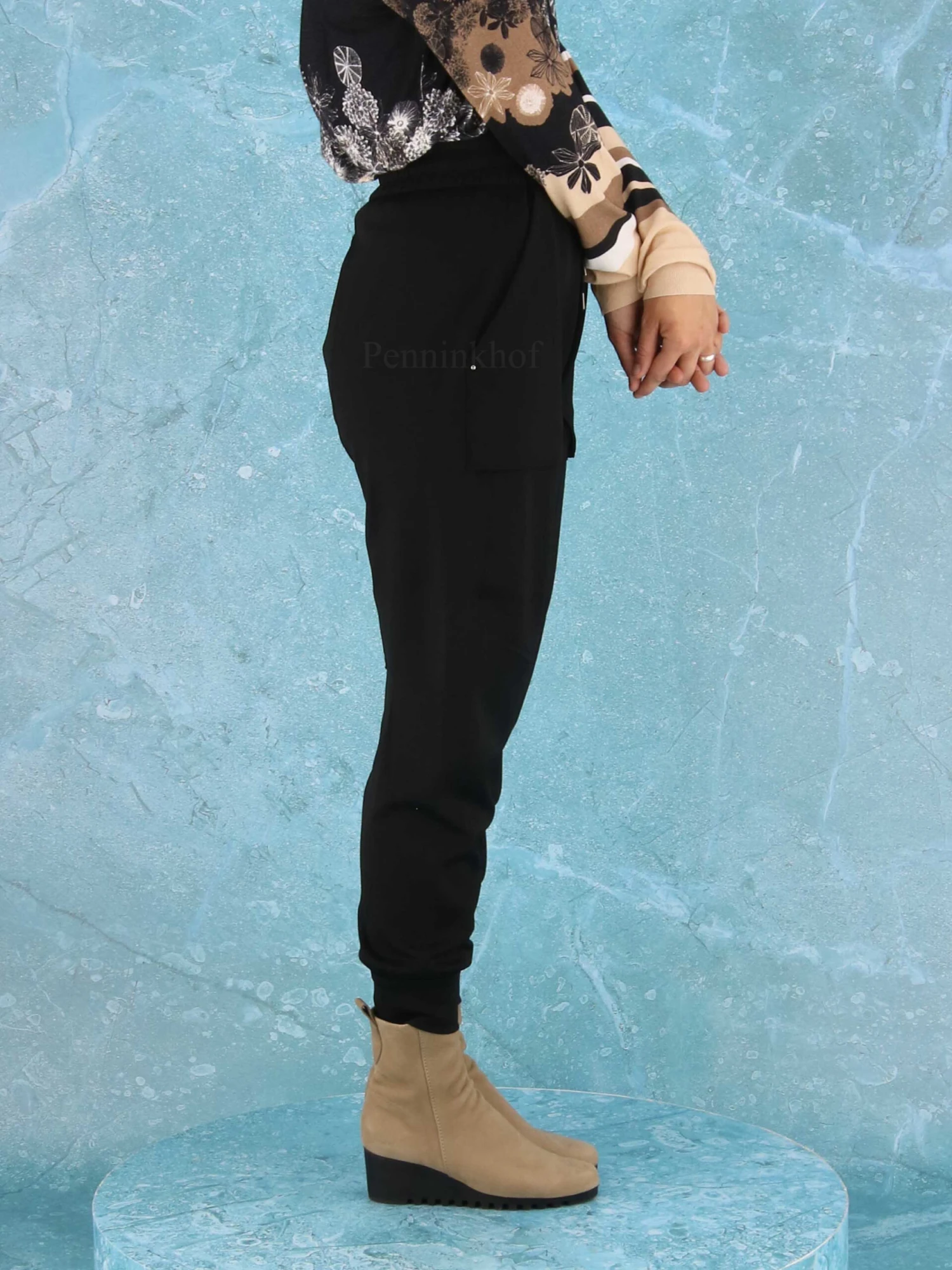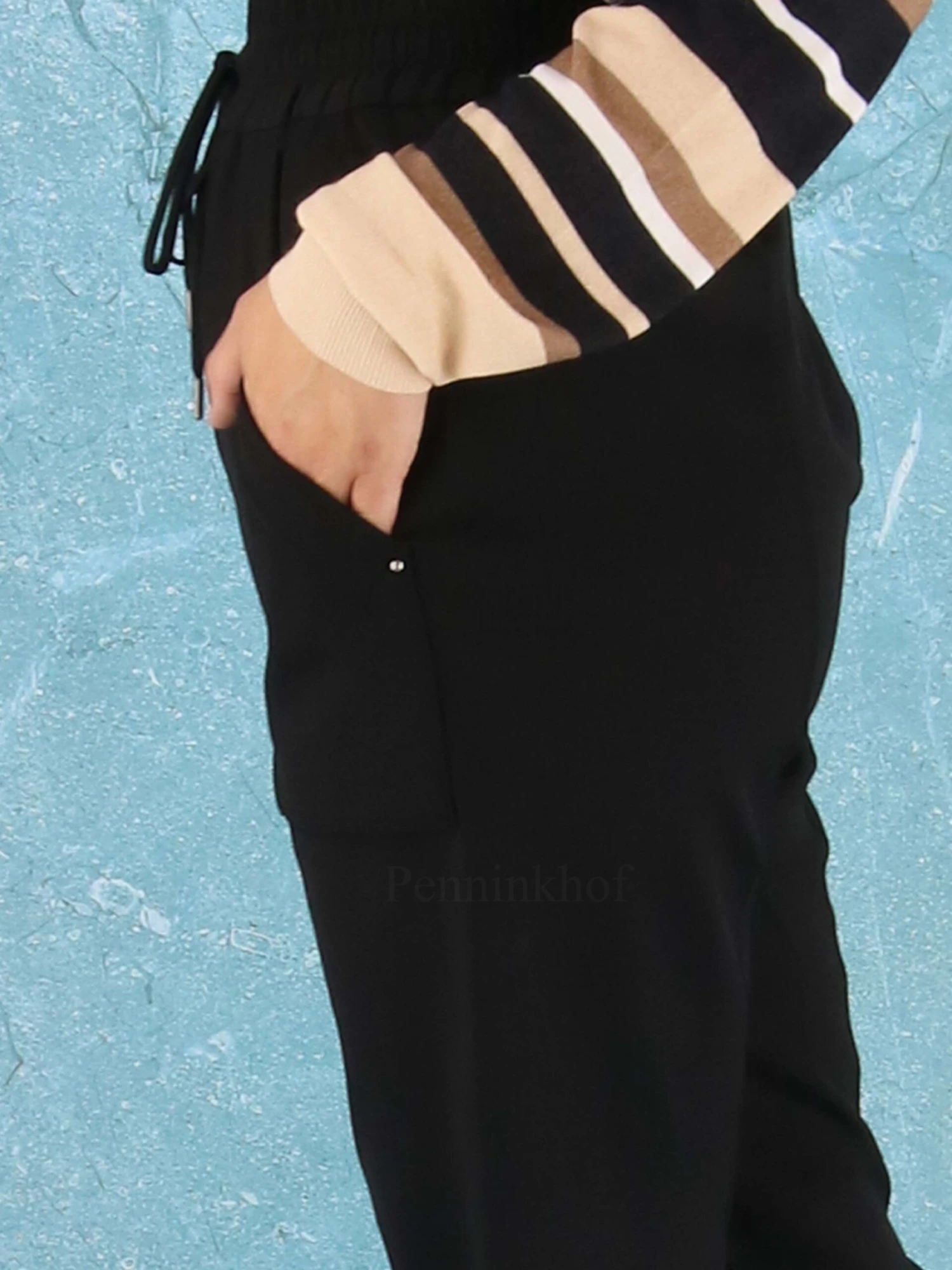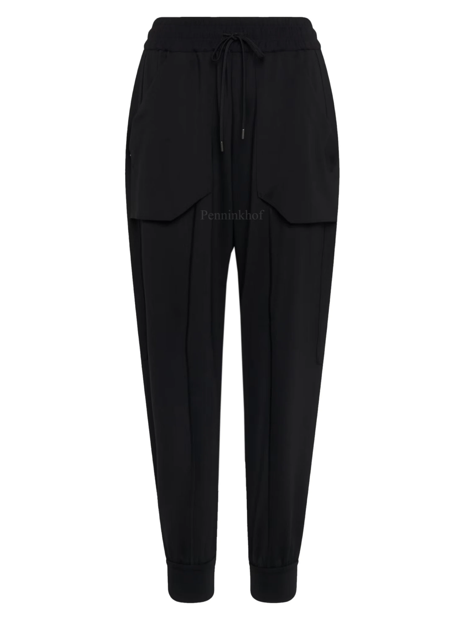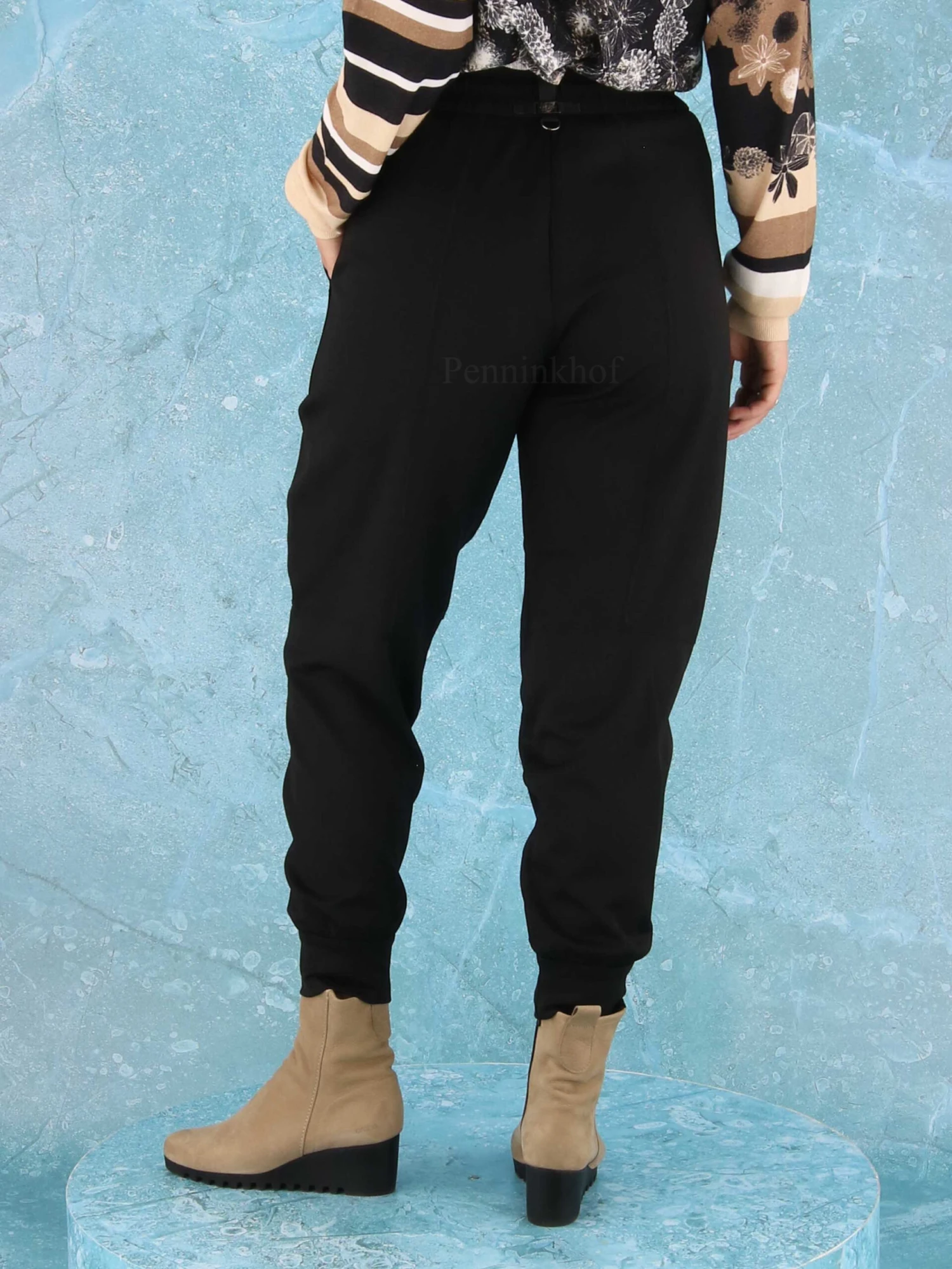 Een broek van High in de kleur zwart. In de taille is een fijn geplooide elastieken band. Over het midden van de pijpen is een stiknaad. de broek heeft grote steekzakken en aan de onderkant van de pijpen is een brede boord. Deze broek mag op de hand worden gewassen.